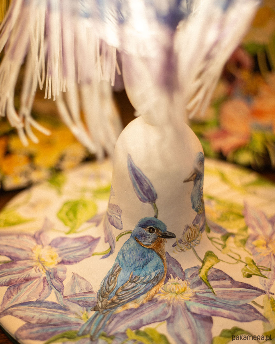 Adagio: średniej wielkości lampa z kolekcji „Floral Melodies”, niczym wolne ogniwo symfonii, wprowadza spokój i komfort. Jej powierzchnię zdobią duże fioletowe powojniki, splecione liście i gałęzie, a także małe ptaszki – wschodnie bławatki, które dodają harmonii całej kompozycji.