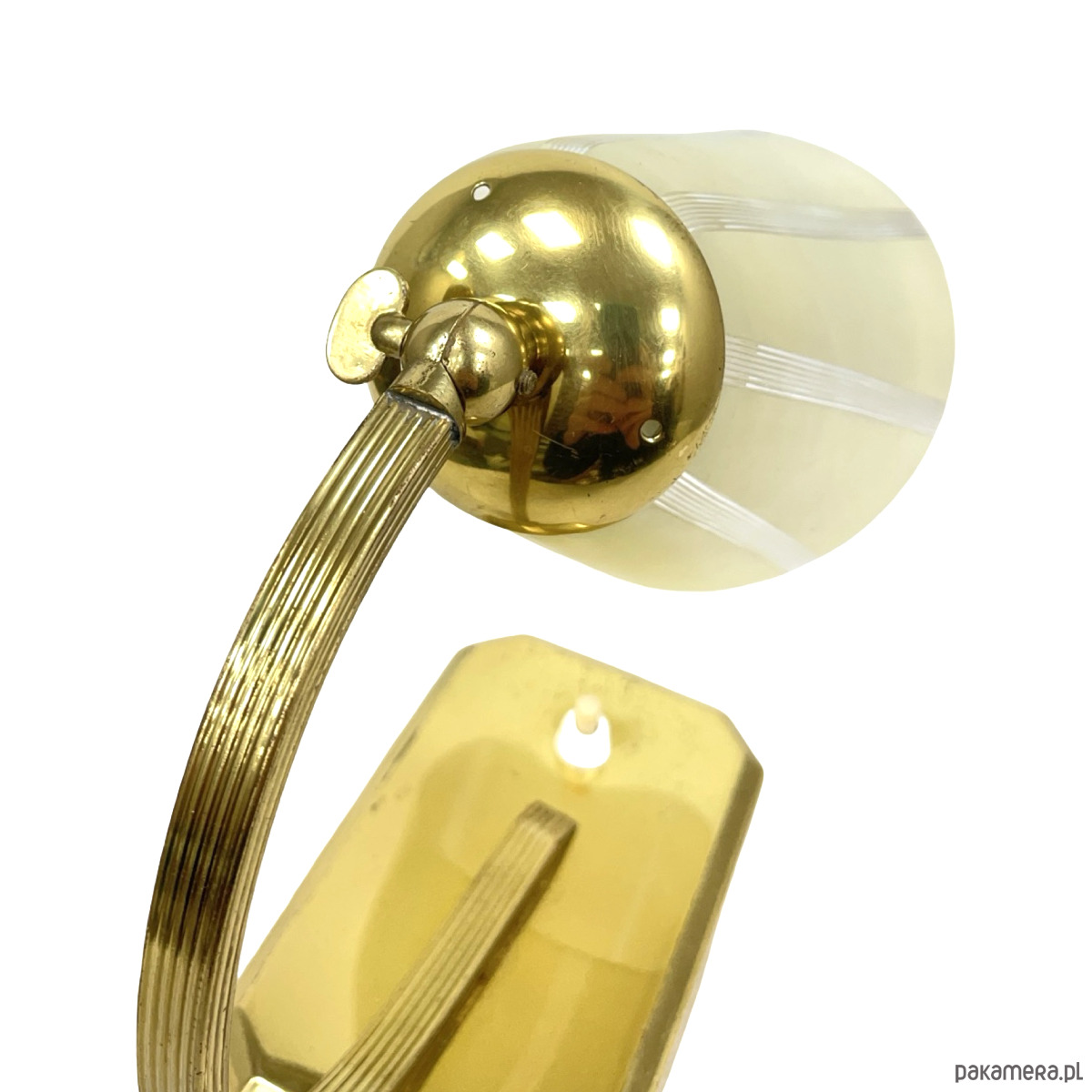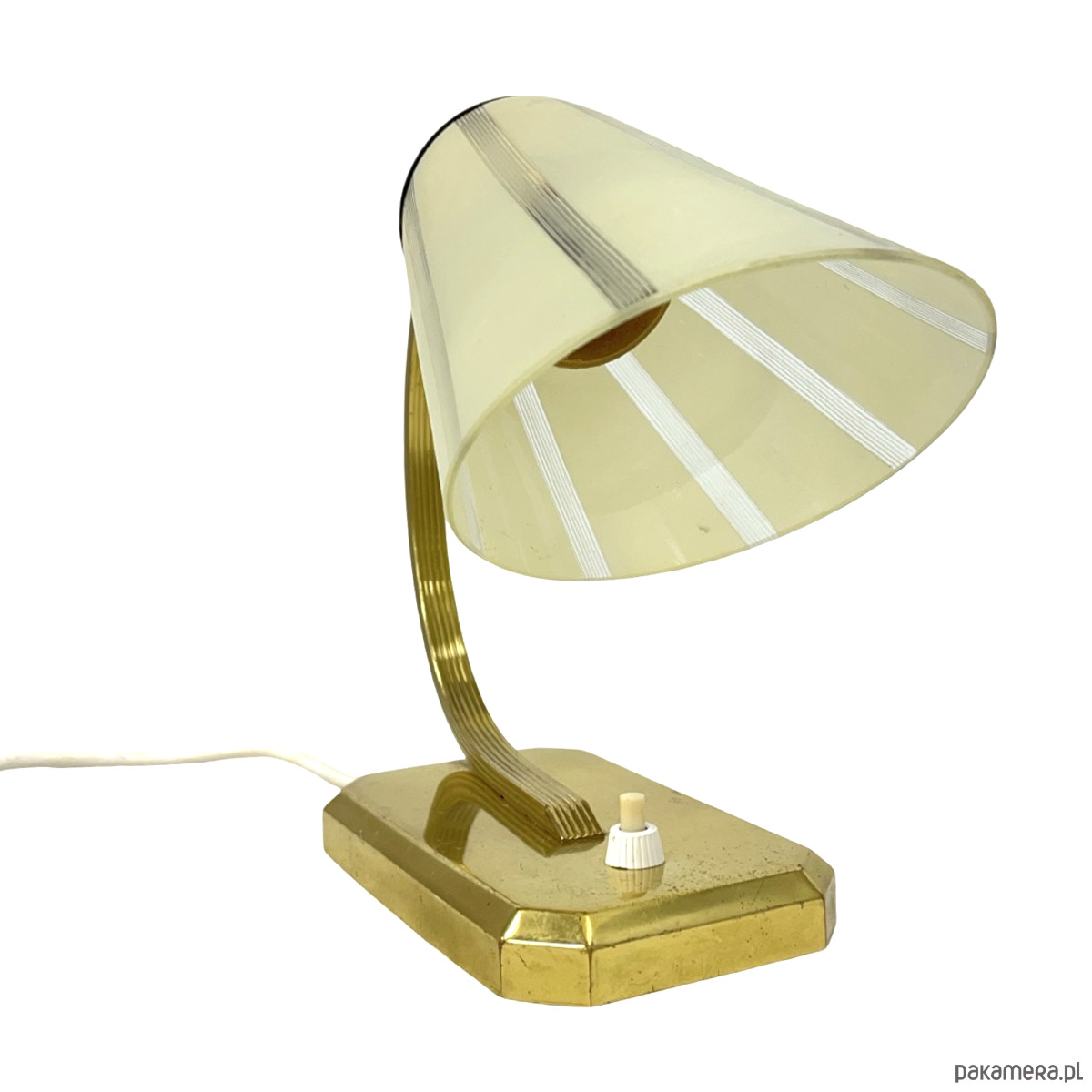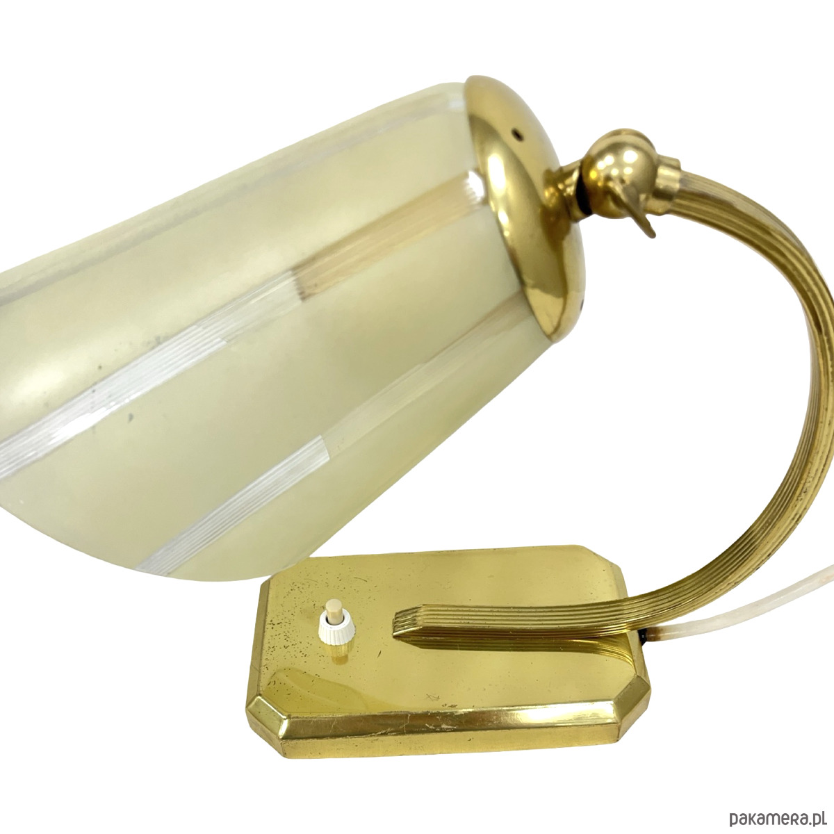 Lampa wykonana jest z mosiądzu z naturalną patyną oraz wyposażona w szklany klosz w odcieniu kremowo-mlecznym, zdobiony delikatnymi poziomymi pasami. Klosz zapewnia miękkie, kierunkowe światło, idealne do pracy przy biurku lub jako lampa nocna.