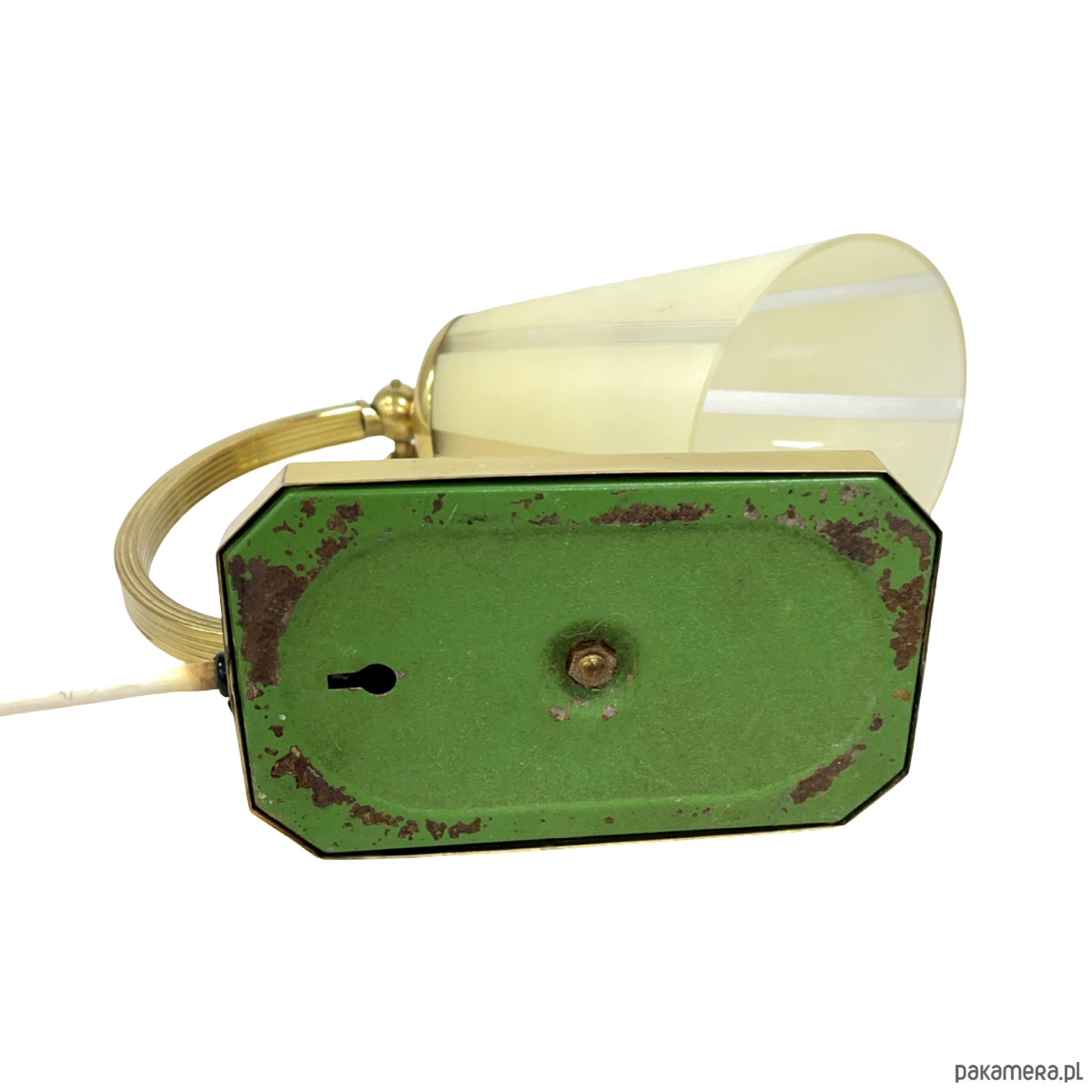 Mosiądz z naturalną patyną i drobnymi śladami użytkowania adekwatnymi do wieku. Szklany klosz bez pęknięć i wyszczerbień. Instalacja sprawna.