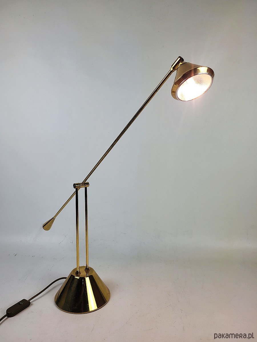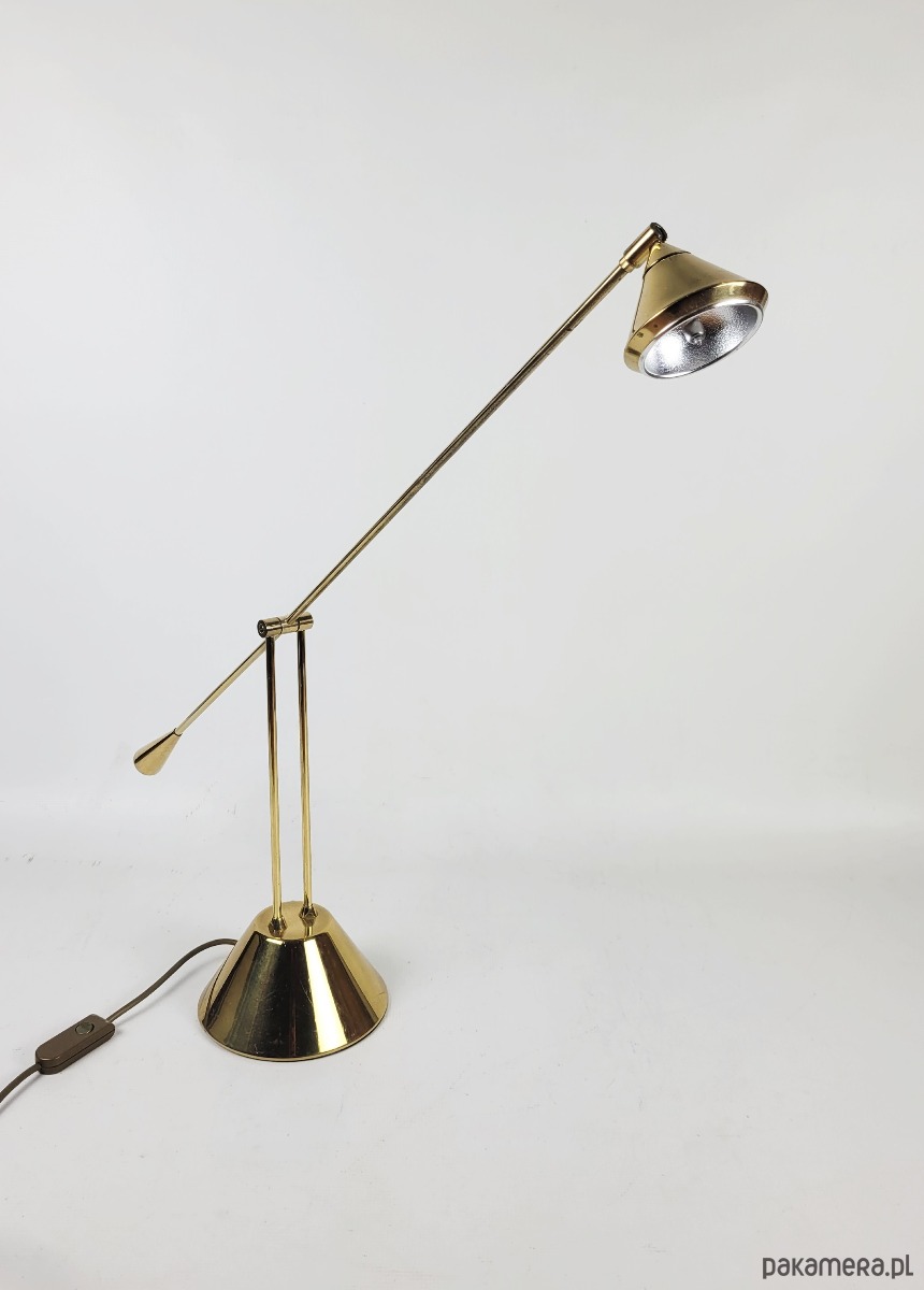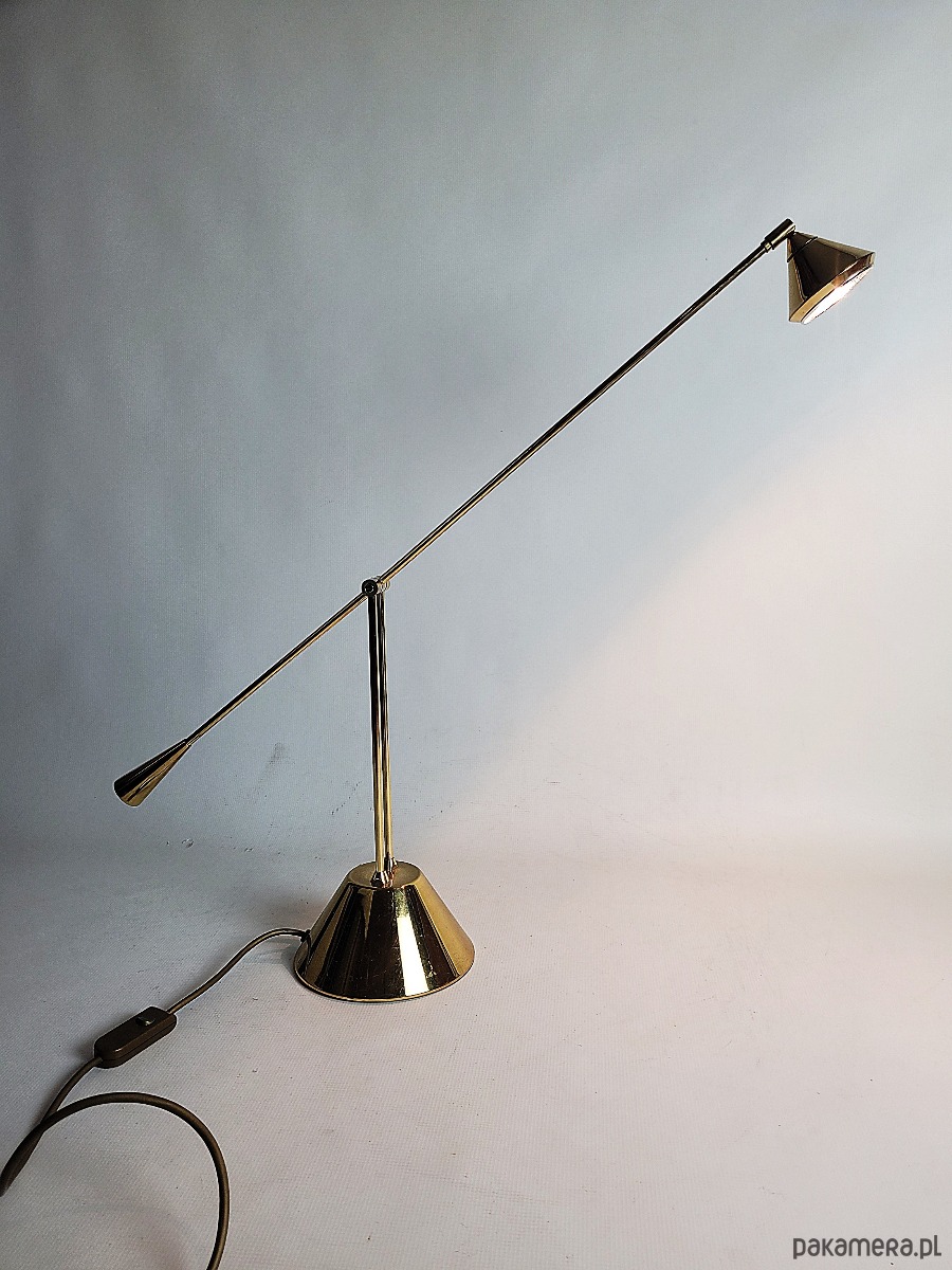 Elegancka lampa biurkowa w kolorze złota, utrzymana w duchu modernizmu lat 80. Charakteryzuje się prostą, geometryczną formą oraz funkcjonalną konstrukcją z przeciwwagą, pozwalającą na regulację położenia klosza. Klosz w kształcie ostrosłupa nadaje całości wyrazisty, architektoniczny charakter, podkreślając minimalistyczną estetykę przedmiotu. Połączenie metalicznego blasku złota z geometryczną bryłą tworzy ponadczasowy, dekoracyjny akcent, idealny do wnętrz inspirowanych modernizmem, postmodernizmem lub stylem vintage.