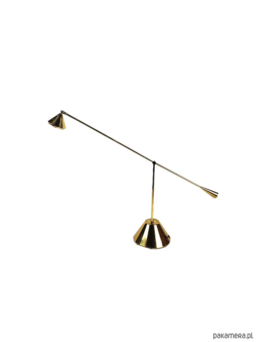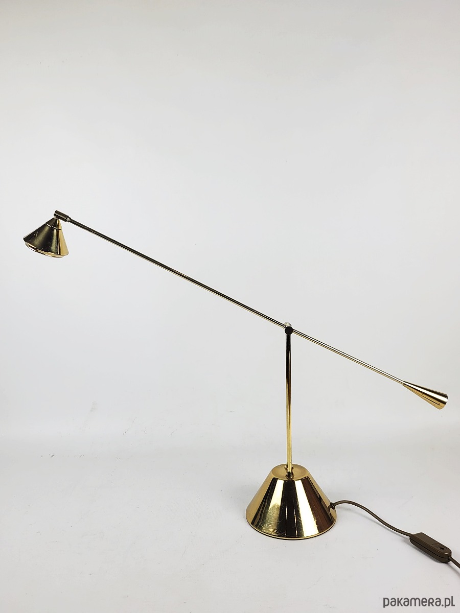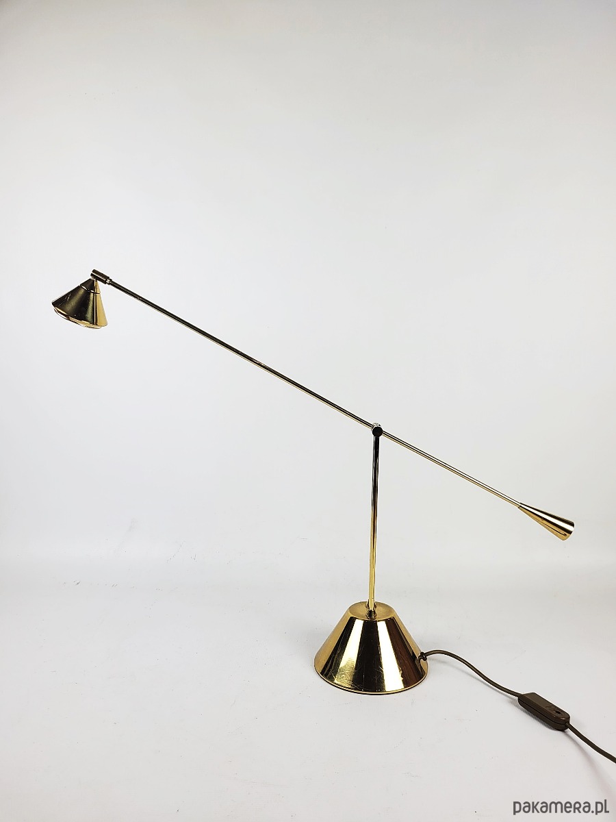 Elegancka lampa biurkowa w kolorze złota, utrzymana w duchu modernizmu lat 80. Charakteryzuje się prostą, geometryczną formą oraz funkcjonalną konstrukcją z przeciwwagą, pozwalającą na regulację położenia klosza. Klosz w kształcie ostrosłupa nadaje całości wyrazisty, architektoniczny charakter, podkreślając minimalistyczną estetykę przedmiotu. Połączenie metalicznego blasku złota z geometryczną bryłą tworzy ponadczasowy, dekoracyjny akcent, idealny do wnętrz inspirowanych modernizmem, postmodernizmem lub stylem vintage.