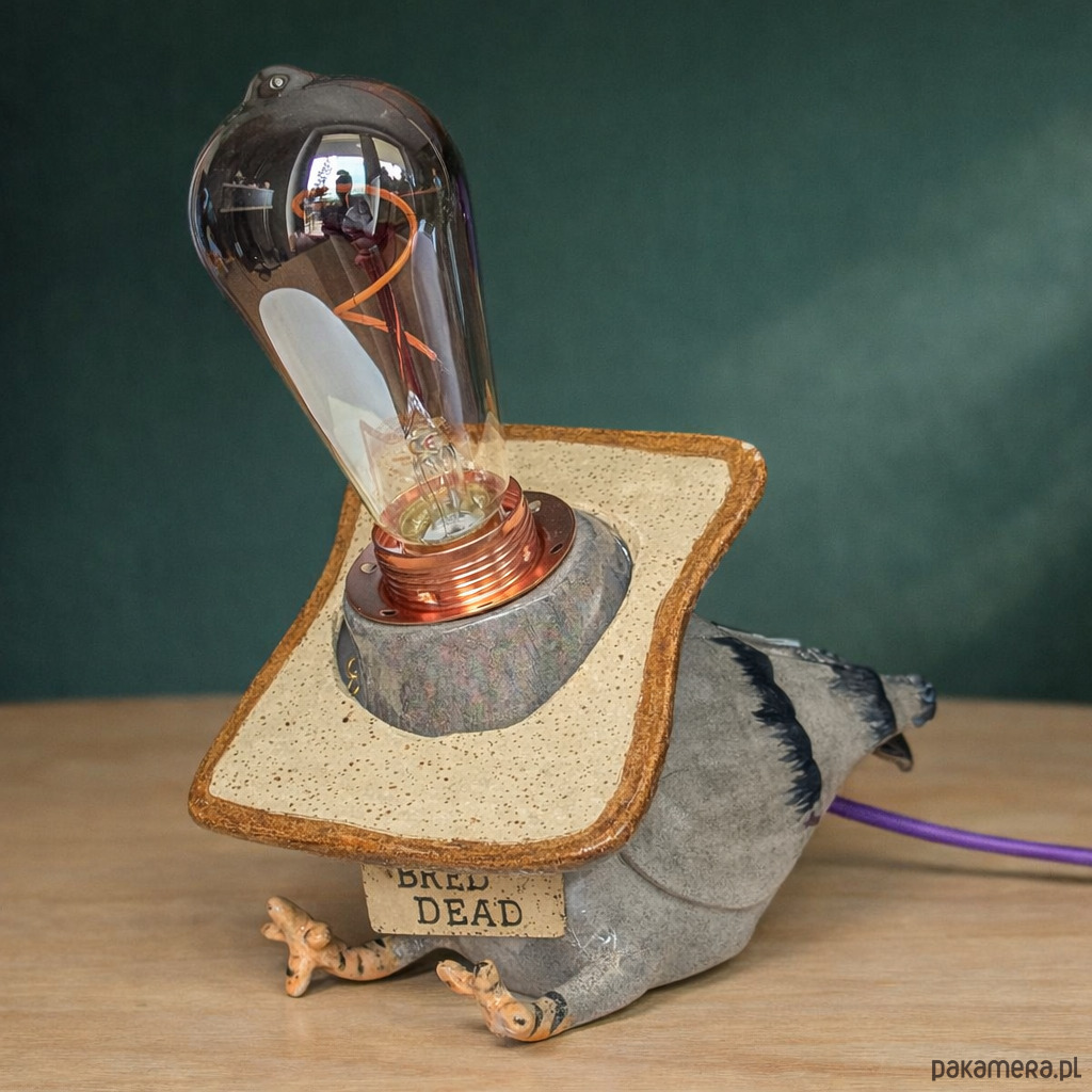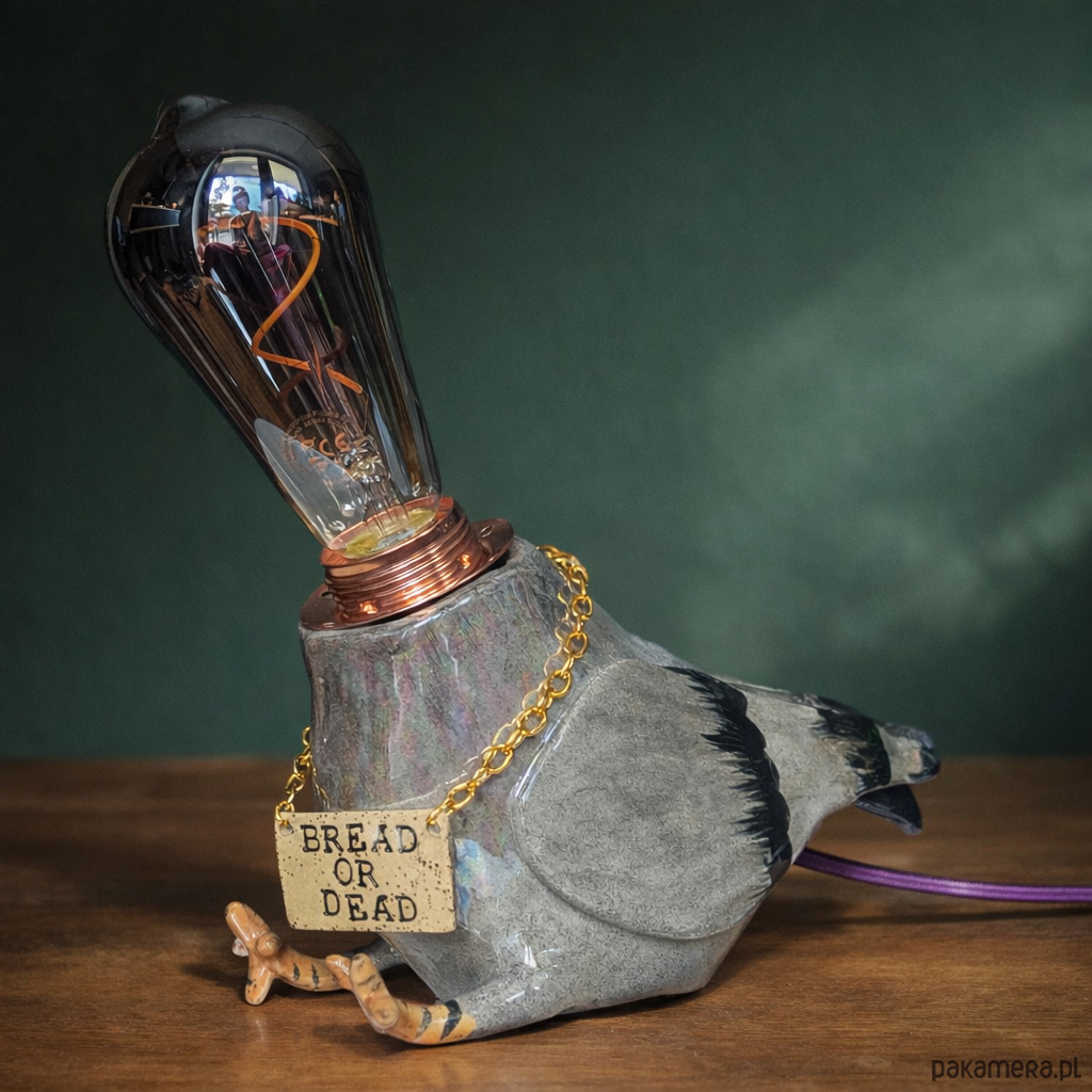 Ręcznie lepiona i szkliwiona lampa z typowym dla mnie żartem- lubię grę słów i rymy, dlatego gołąb nosi dumnie naszyjnik "BREAD OR DEAD". Głowa, szyja i końcówki skrzydeł pokryte lustrami, co daje efekt delikatnej, tęczowej poświaty.