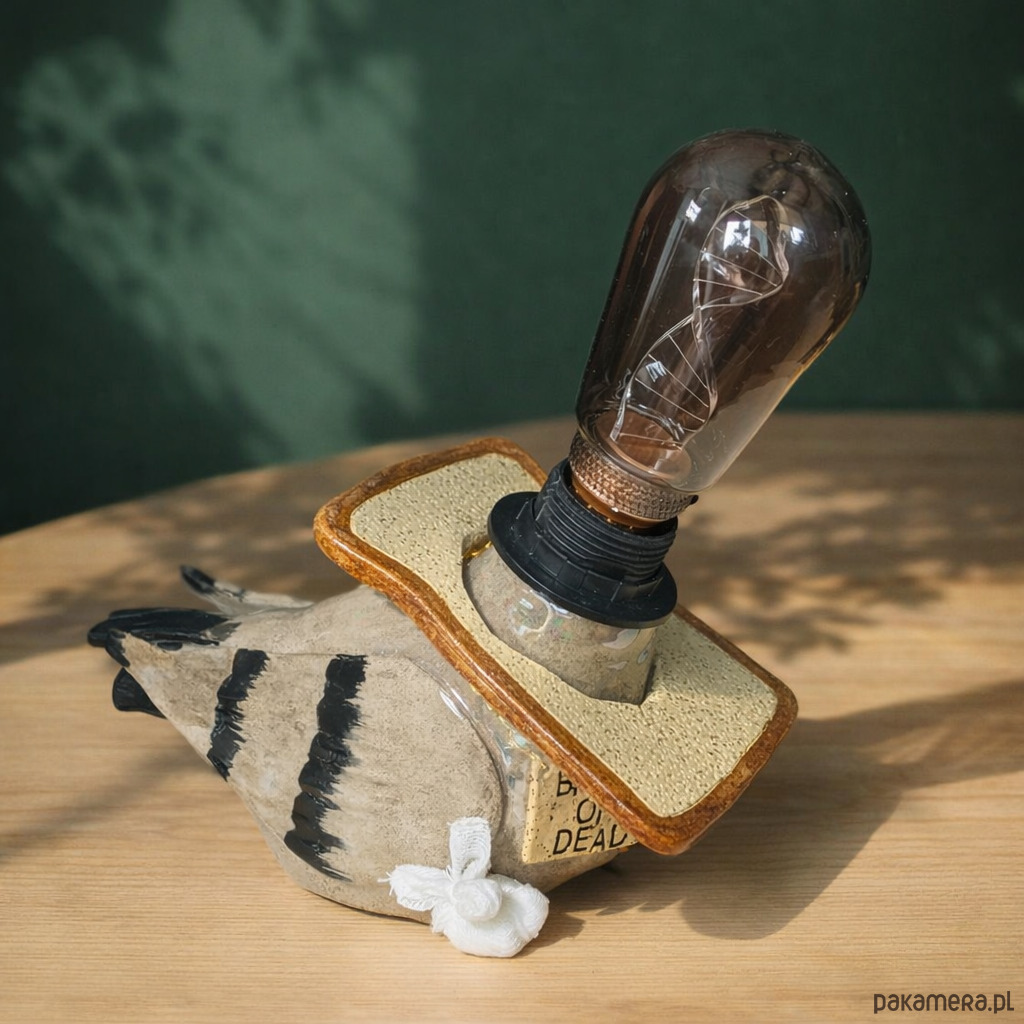 Ręcznie lepiona i szkliwiona lampa z typowym dla mnie żartem- lubię grę słów i rymy, dlatego gołąb nosi dumnie naszyjnik "BREAD OR DEAD". Głowa, szyja i końcówki skrzydeł pokryte lustrami, co daje efekt tęczowej poświaty.