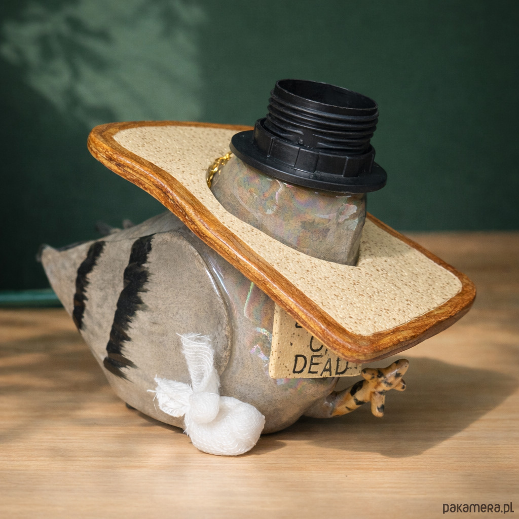 Gołąb doznał urazu a nawet była konieczna amputacja części nogi, stąd obowiązkowy opatrunek. Nie przeszkadza to w użytkowaniu, a można potraktować jak żart- w końcu cała lampa też nie jest poważna ;-)