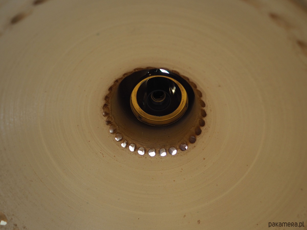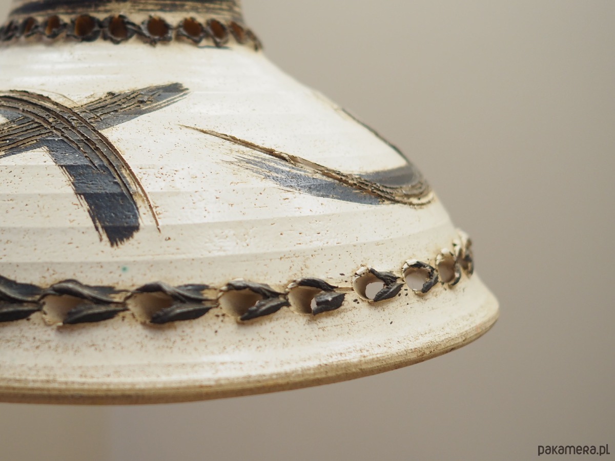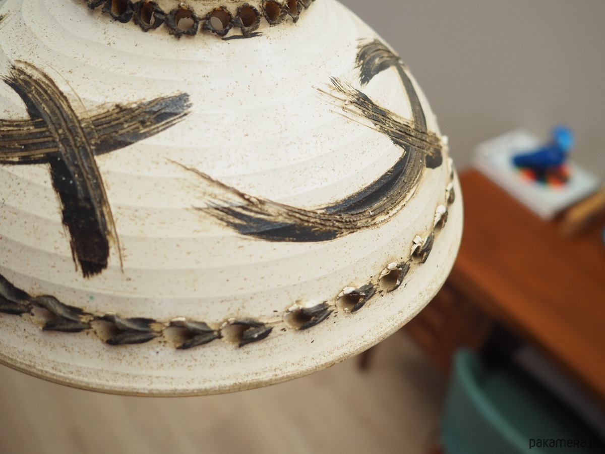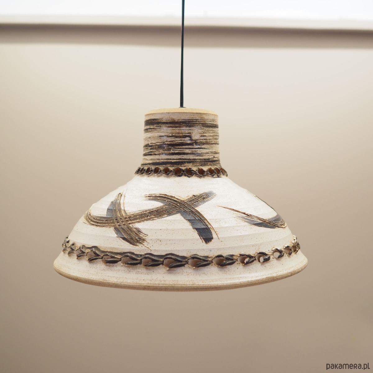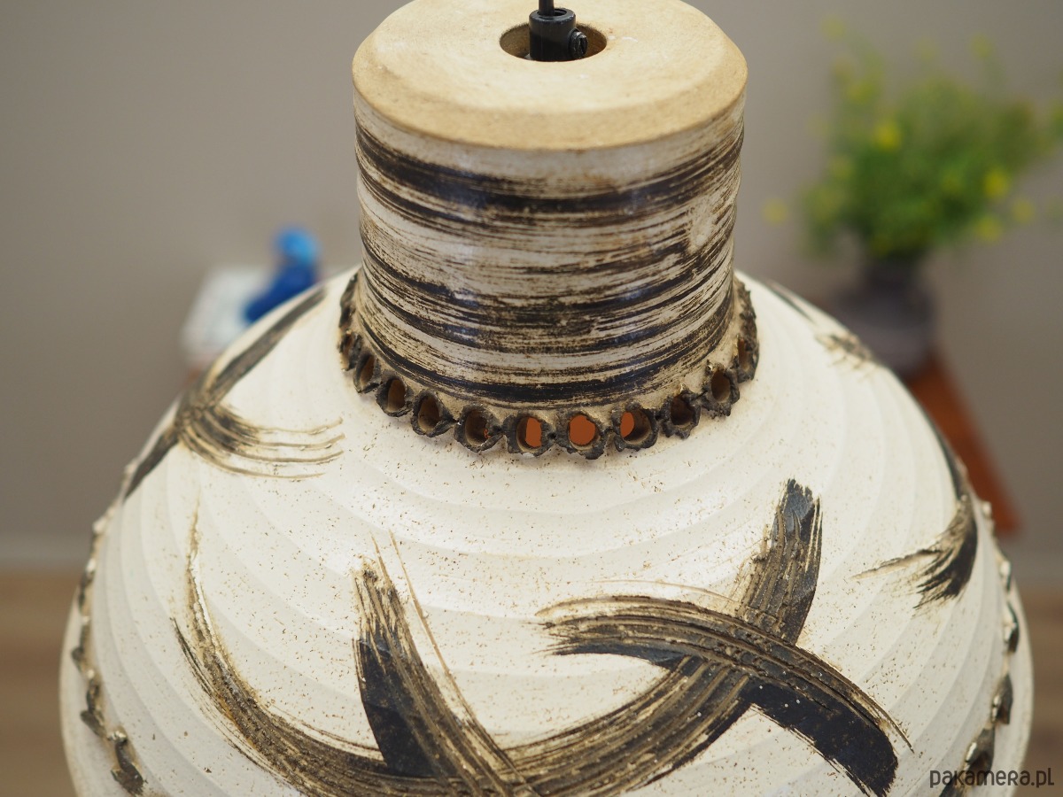 Wykonana z ceramiki w kolorze beżowym i brązowym. Unikatowa konstrukcja jest nie tylko elementem designu, jej głównym założeniem jest rozproszenie światła w celu stworzenia przyjemnego nastroju wnętrza.