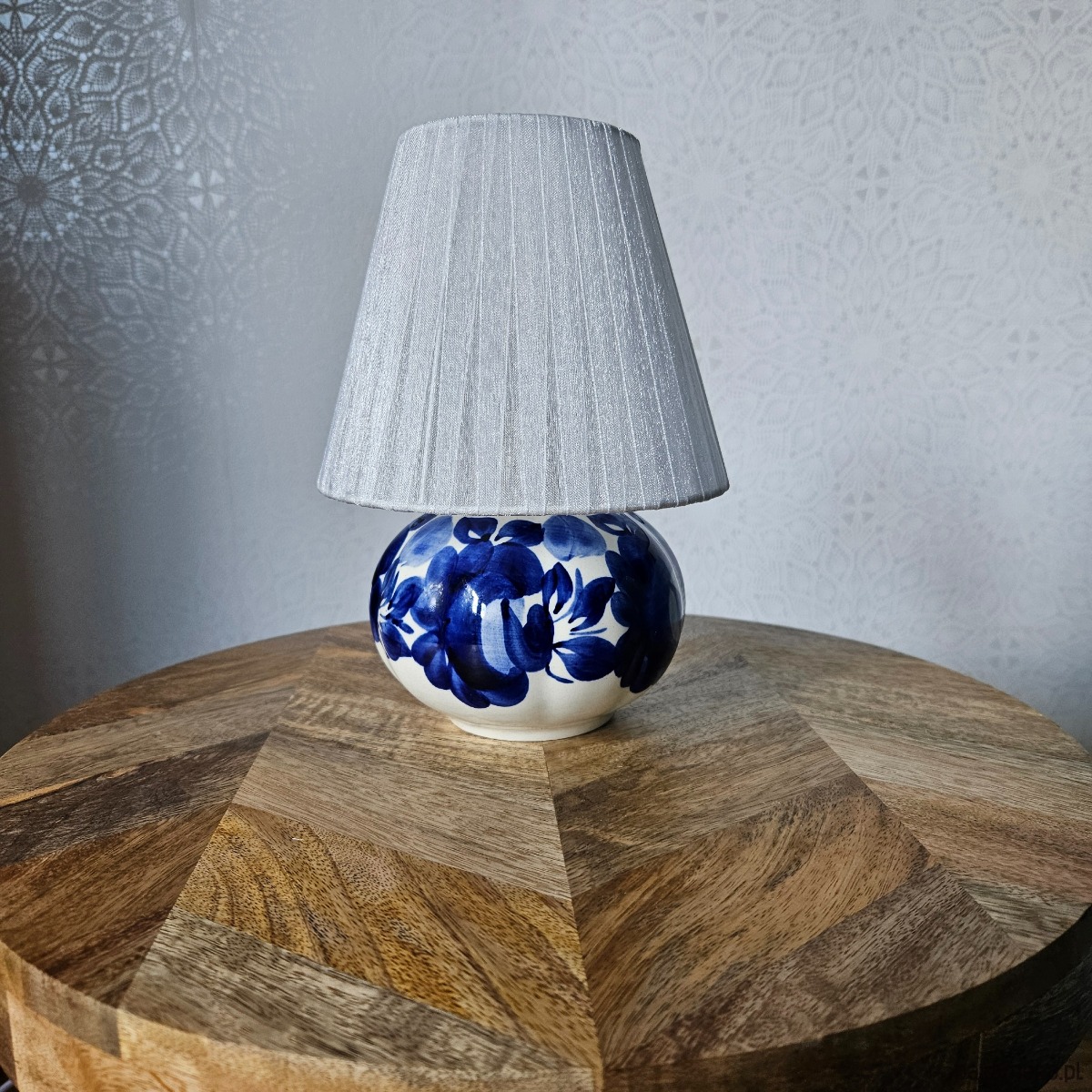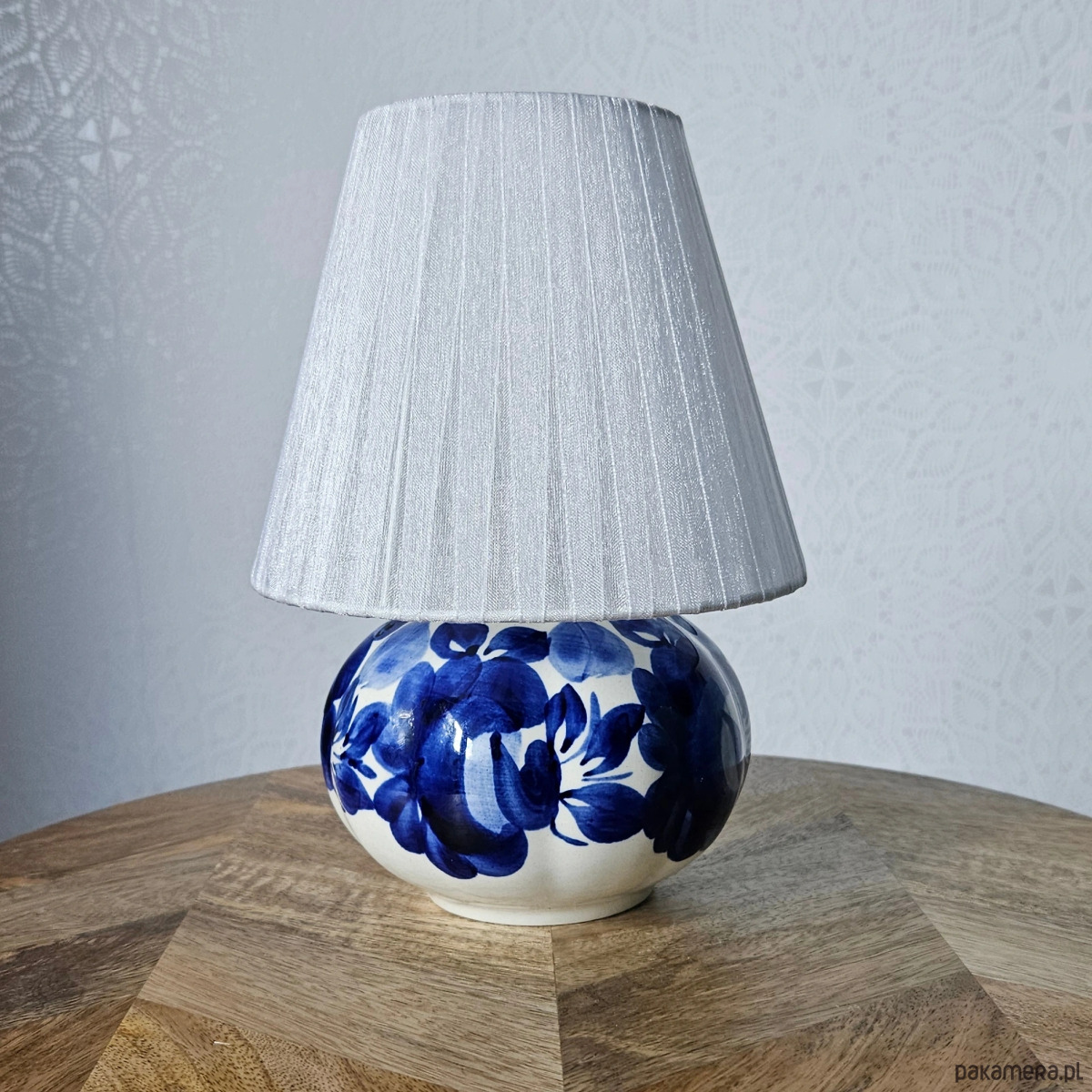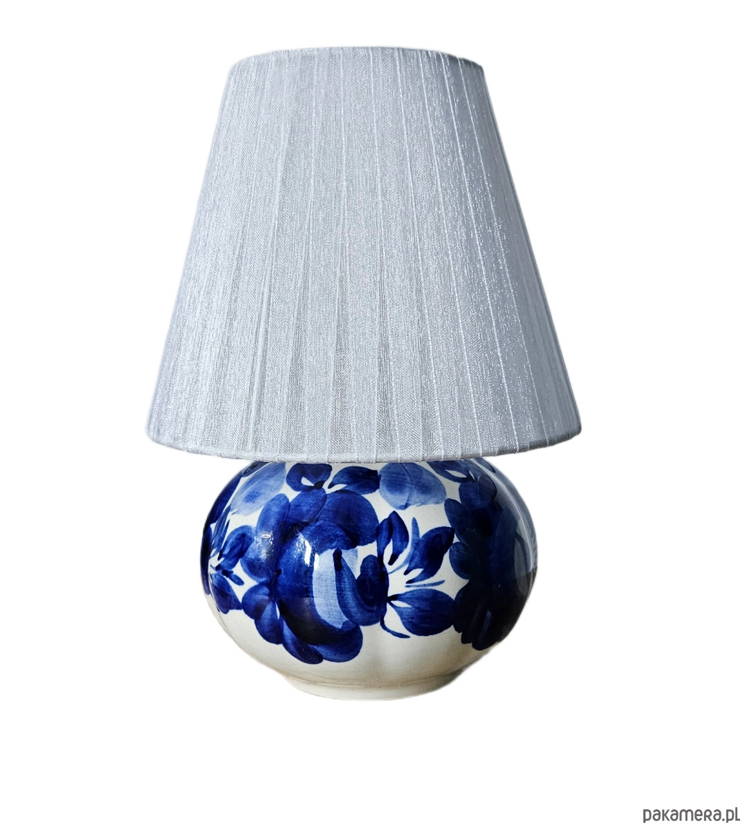 Ręcznie malowana lampa stołowa wykonana z unikalnego fajansowego wazonu z polskiej manufaktury Koło (PRL). Granatowo-biała ceramika z motywem roślinnym – wyjątkowy akcent do wnętrz w stylu śródziemnomorskim, coastal, cottagecore, eklektycznym, a nawet mid-century modern. Oryginalny wazon vintage został profesjonalnie przekształcony w działającą lampę: przewód w oplocie z włącznikiem, nowy abażur i oprawka E14 (żarówka nie w zestawie). Wysokość ok. 20 cm, średnica 12 cm – idealna na stolik nocny, biurko czy komodę. Świetna propozycja dla osób ceniących rękodzieło, ekologię i niepowtarzalne dodatki. Produkt wysyłany z Polski, bezpiecznie zapakowany, z numerem śledzenia. Nadaj wnętrzu charakter i historię dzięki tej wyjątkowej, funkcjonalnej ozdobie.