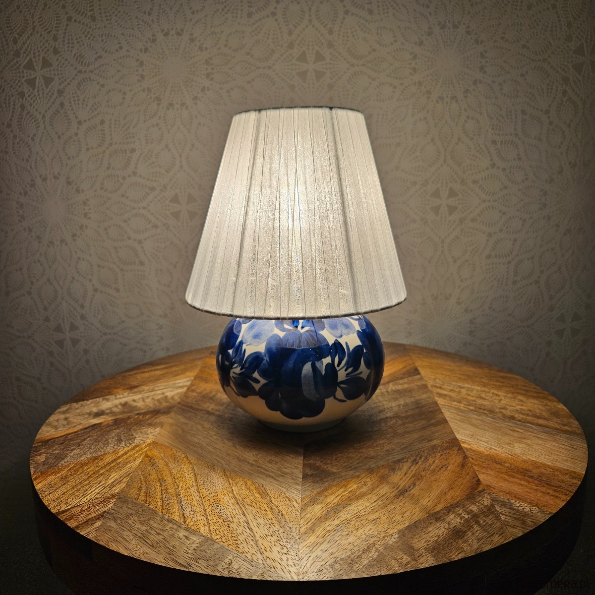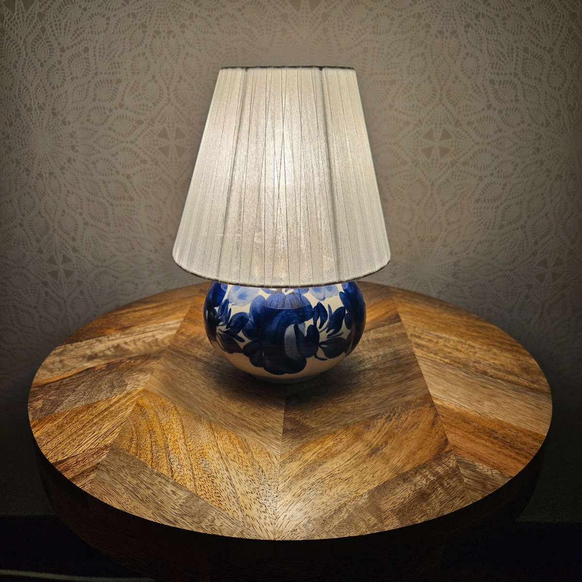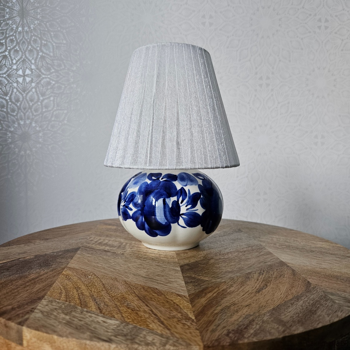 Ręcznie malowana lampa stołowa wykonana z unikalnego fajansowego wazonu z polskiej manufaktury Koło (PRL). Granatowo-biała ceramika z motywem roślinnym – wyjątkowy akcent do wnętrz w stylu śródziemnomorskim, coastal, cottagecore, eklektycznym, a nawet mid-century modern. Oryginalny wazon vintage został profesjonalnie przekształcony w działającą lampę: przewód w oplocie z włącznikiem, nowy abażur i oprawka E14 (żarówka nie w zestawie). Wysokość ok. 20 cm, średnica 12 cm – idealna na stolik nocny, biurko czy komodę. Świetna propozycja dla osób ceniących rękodzieło, ekologię i niepowtarzalne dodatki. Produkt wysyłany z Polski, bezpiecznie zapakowany, z numerem śledzenia. Nadaj wnętrzu charakter i historię dzięki tej wyjątkowej, funkcjonalnej ozdobie.