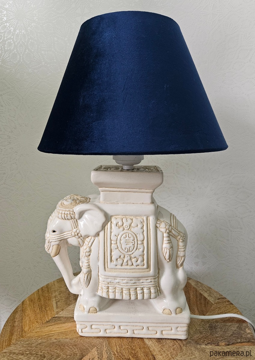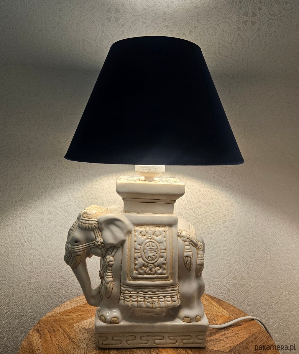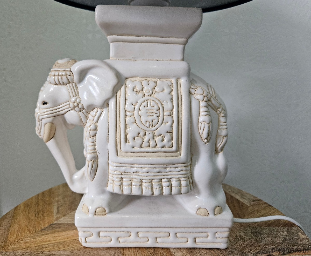 Ta lampa to wyjątkowy przedmiot z historią. Powstała na bazie antycznej, ceramicznej podstawy w formie słonia, inspirowanej sztuką Indii lub Dalekiego Wschodu. Słoń – symbol szczęścia, mądrości i ochrony – został oddany z niezwykłą dbałością o detale. Naturalna patyna i drobne ślady czasu podkreślają jej autentyczność i nadają całości niepowtarzalnego charakteru.