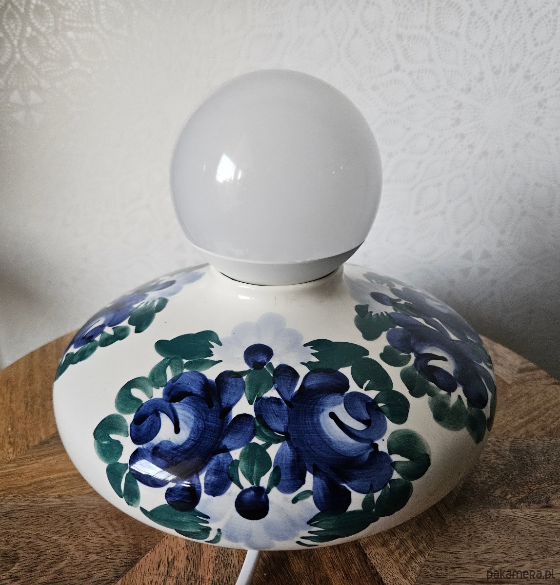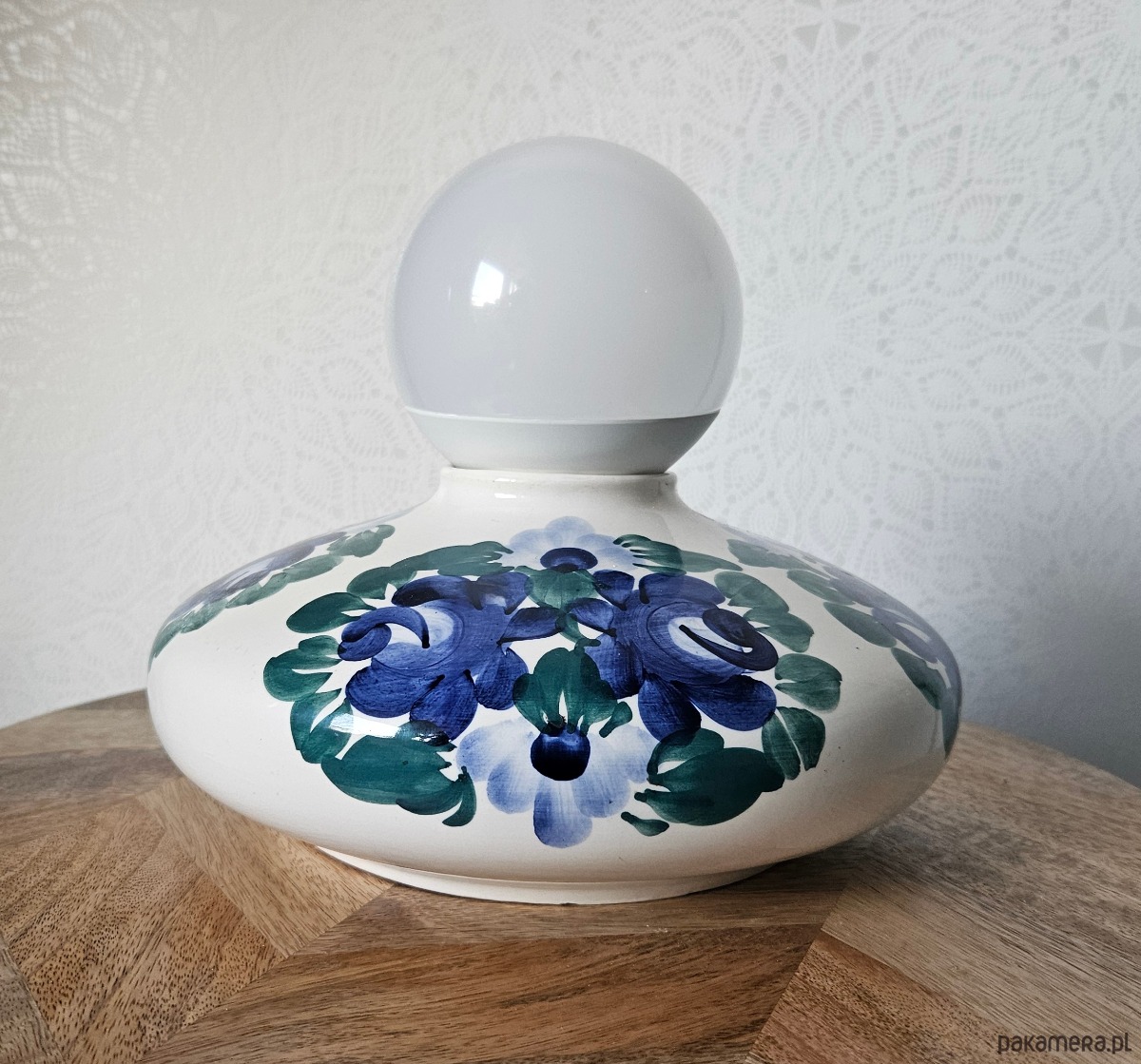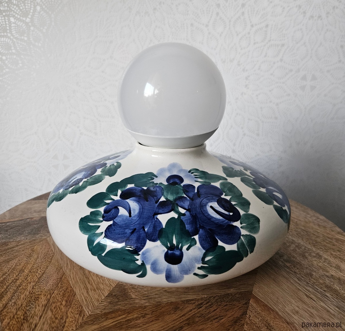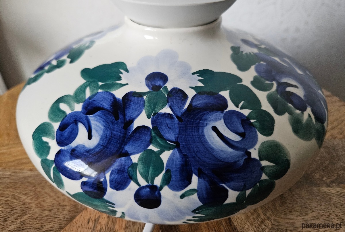 Podstawa lampy zachwyca klasycznym, fajansowym zdobieniem – ręcznie malowane kwiaty w odcieniach głębokiego granatu i zieleni pięknie kontrastują z jasnym tłem ceramiki. Każdy detal jest niepowtarzalny i nosi w sobie ducha minionej epoki.