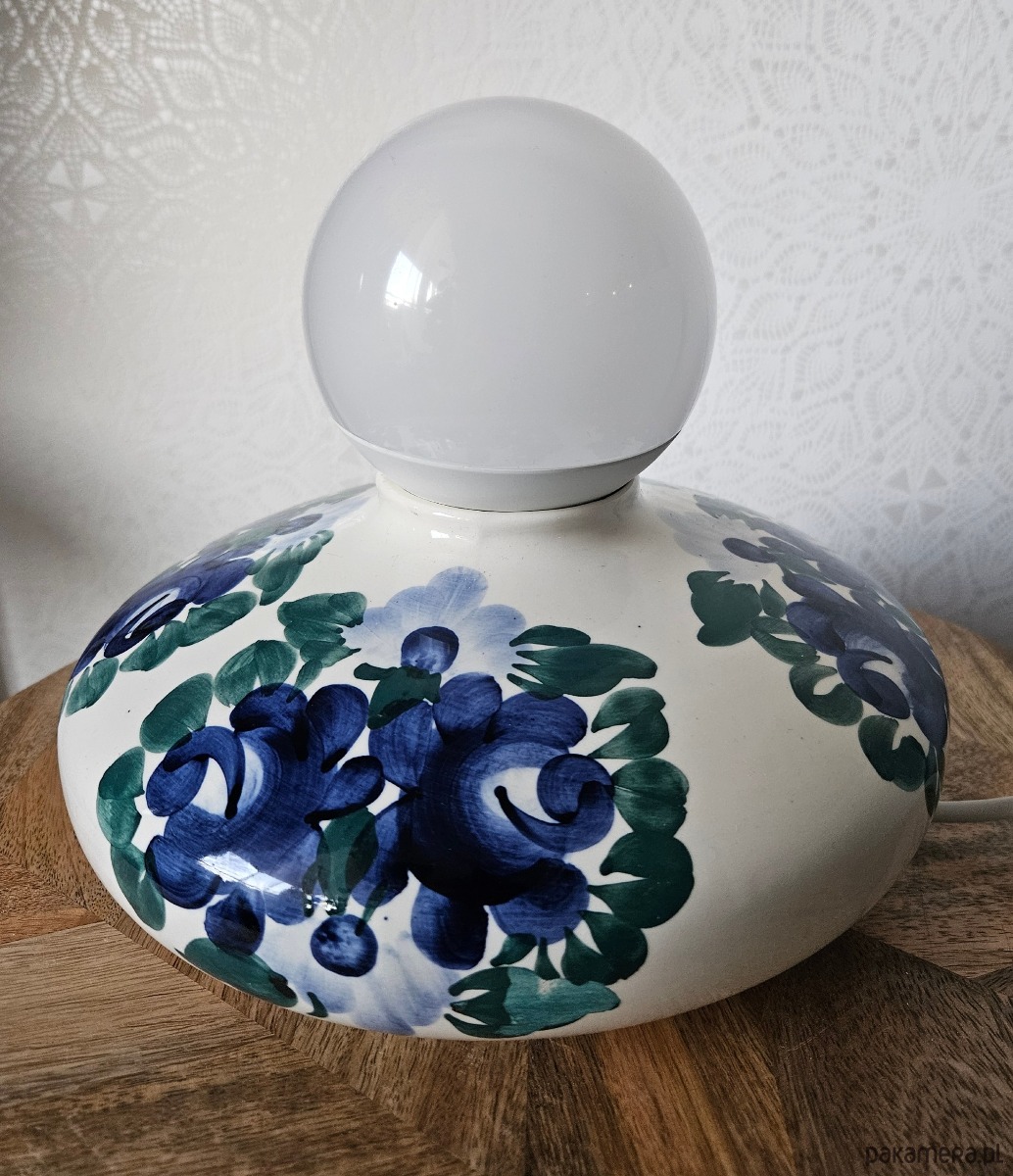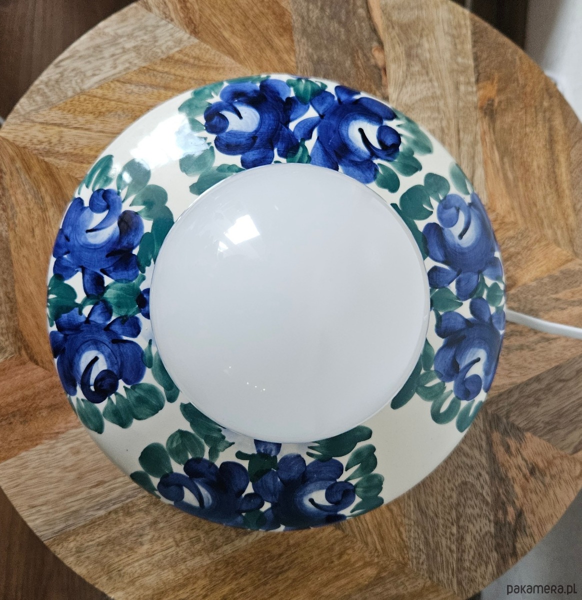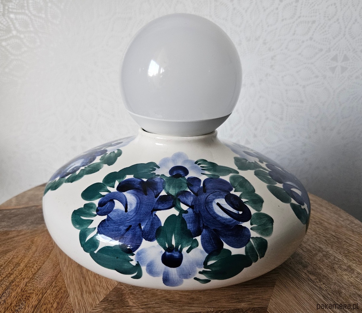 Podstawa lampy zachwyca klasycznym, fajansowym zdobieniem – ręcznie malowane kwiaty w odcieniach głębokiego granatu i zieleni pięknie kontrastują z jasnym tłem ceramiki. Każdy detal jest niepowtarzalny i nosi w sobie ducha minionej epoki.
