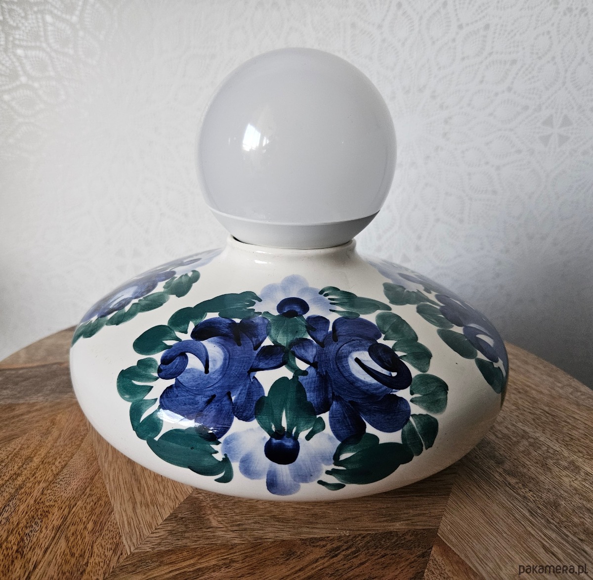 Ta wyjątkowa lampa powstała z oryginalnego, antycznego wazonu pochodzącego z polskiej manufaktury Koło, znanej z charakterystycznych fajansowych form i ręcznego malowania. Wazony tego typu były produkowane w Polsce w latach 60.–80. XX wieku, co czyni tę lampę nie tylko elementem oświetlenia, ale również małym fragmentem historii polskiego wzornictwa.
