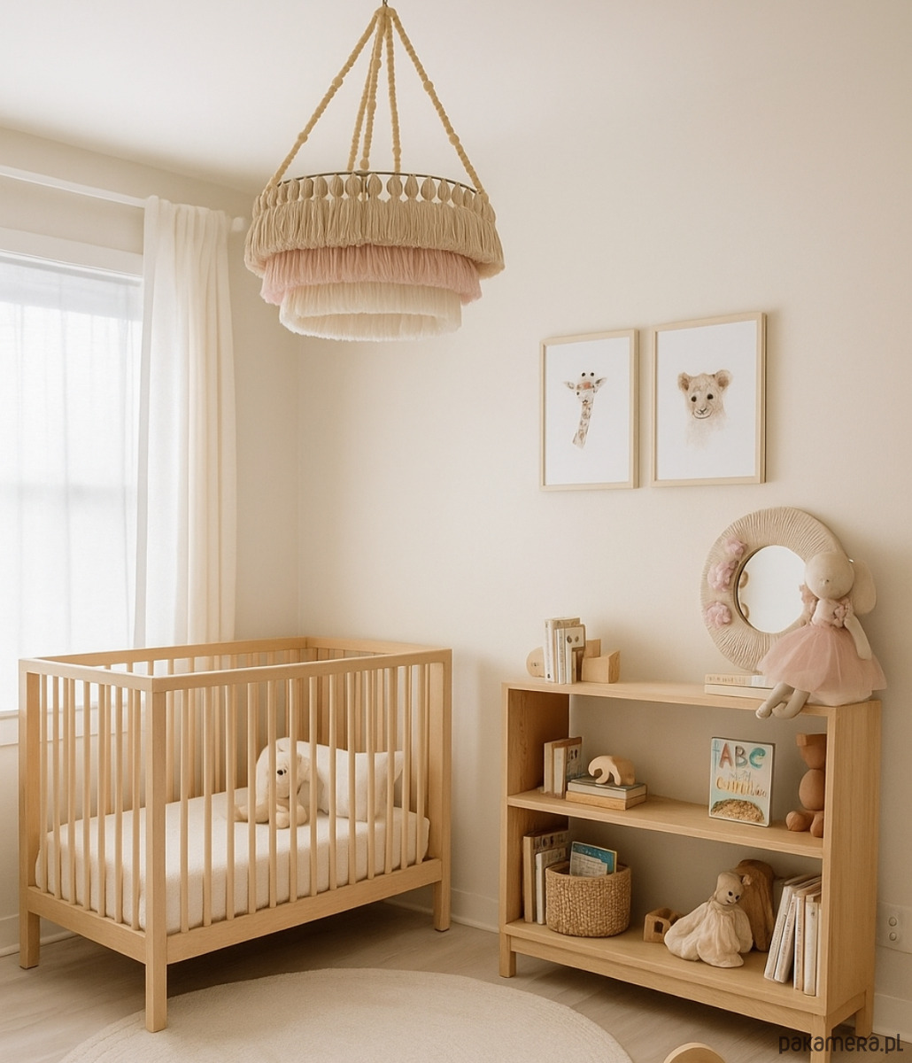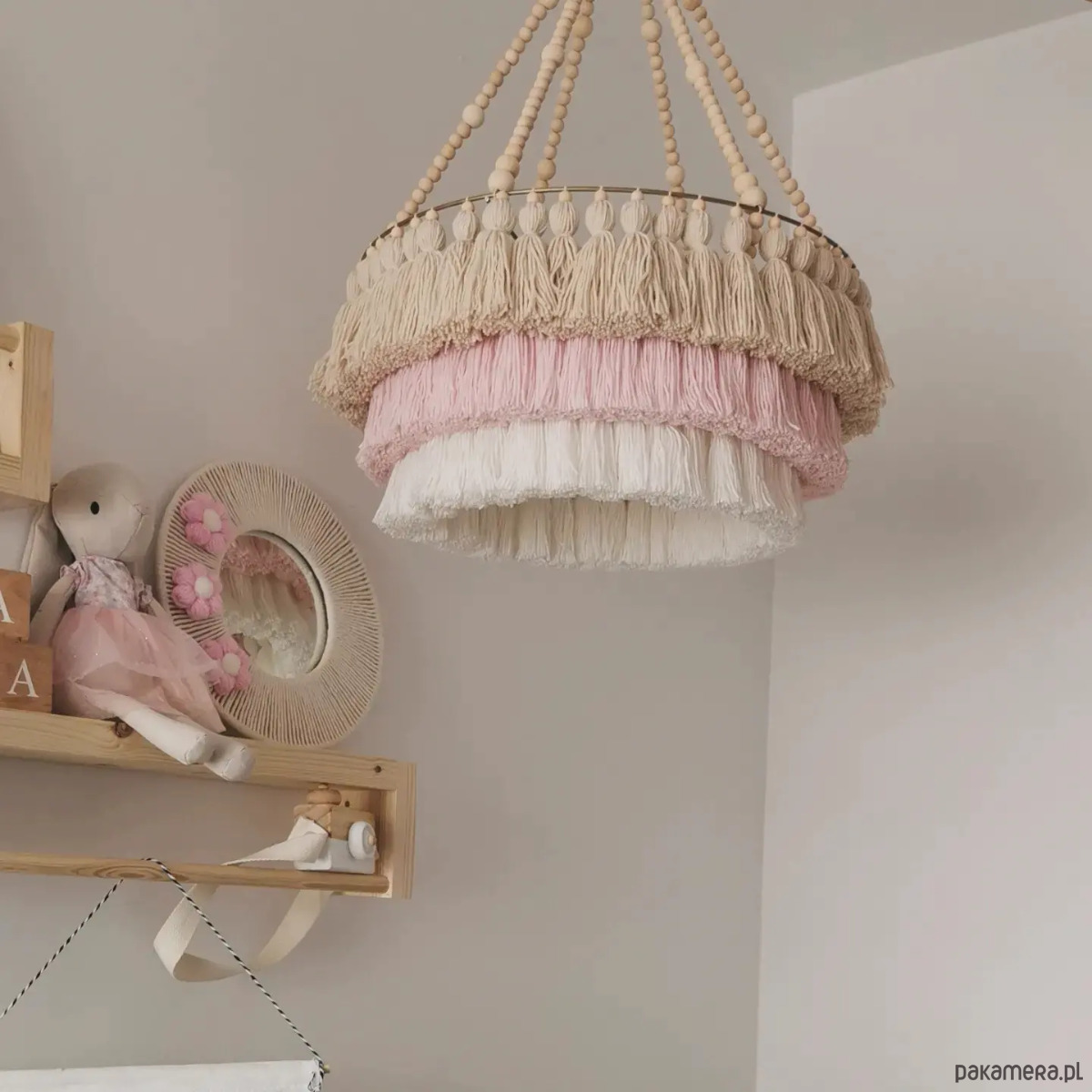Wyjątkowa lampa wisząca do pokoju dziecięcego ręcznie pleciona w kolorach różu, bieli oraz beżu nada uroku każdej sypialni dziecięcej.