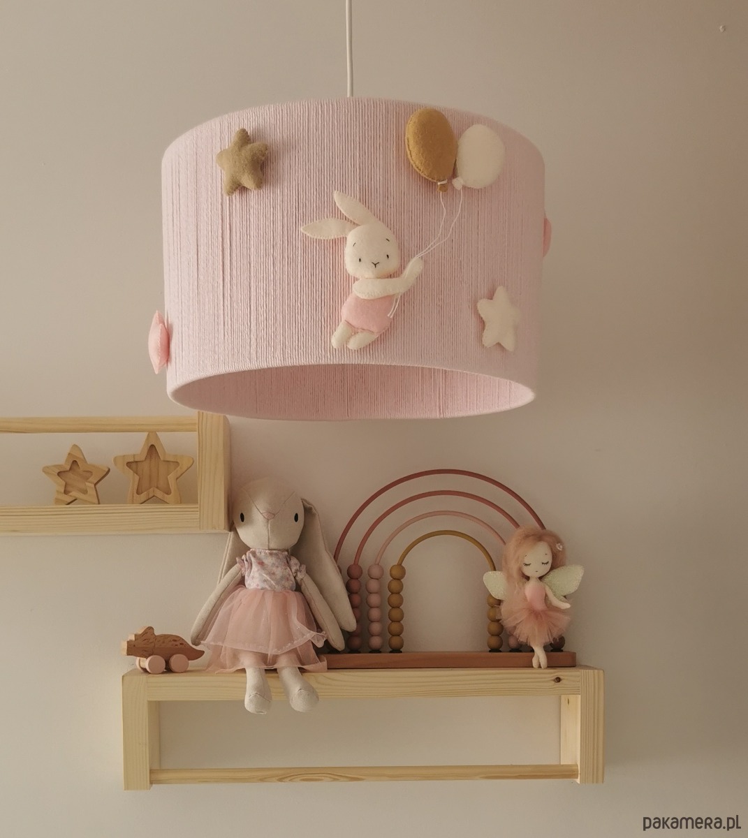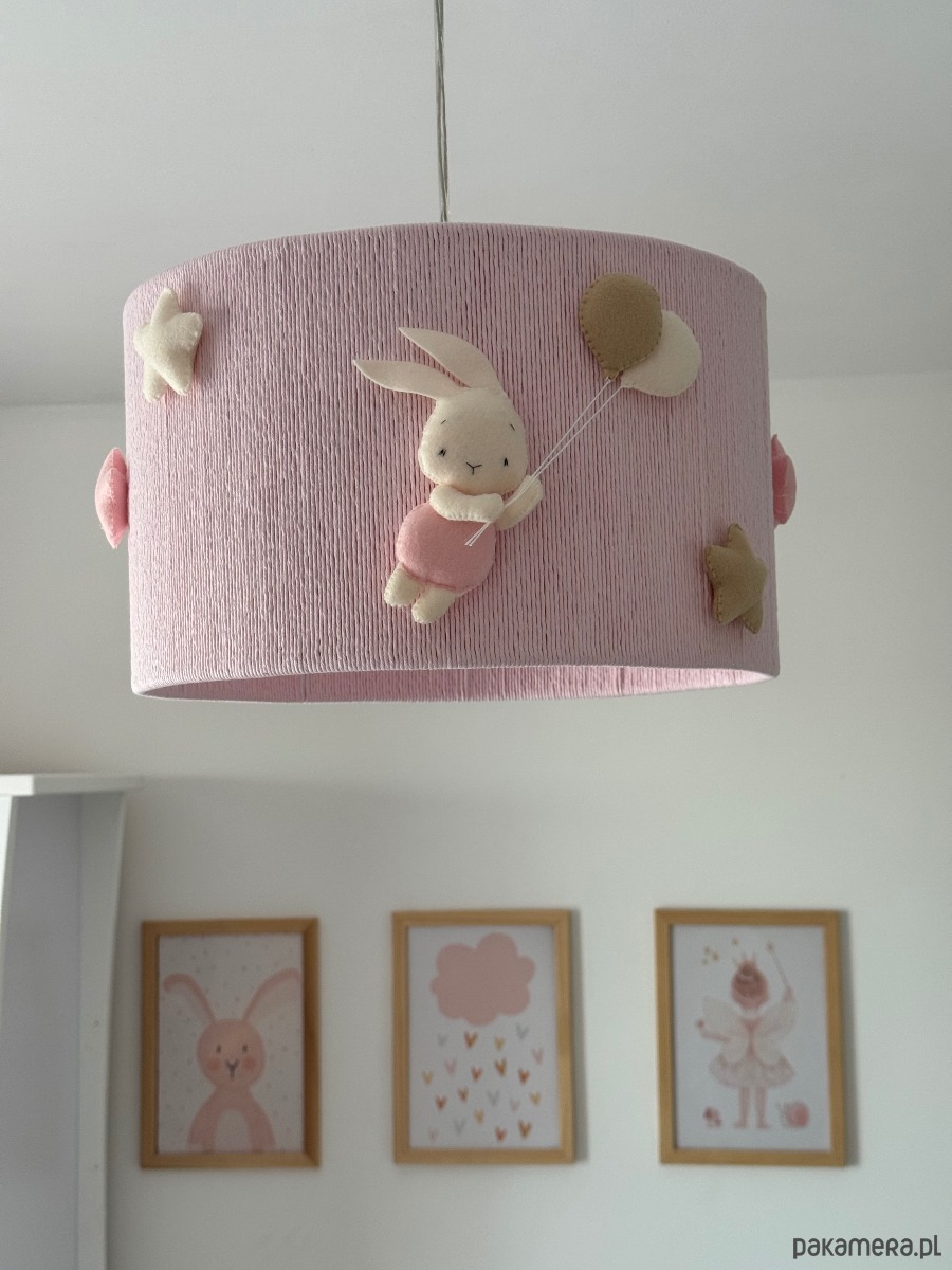 Wyjątkowa lampa do pokoju dziecięcego wykonana ze sznurka bawełnianego w kolorze różowym, króliczków wykonanych  z filcu oraz gwiazdek.