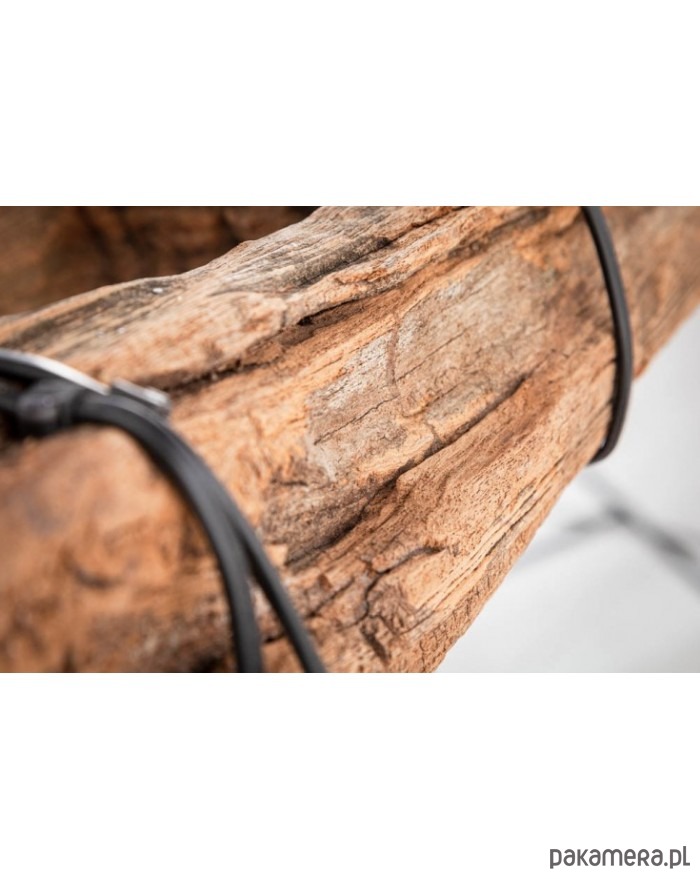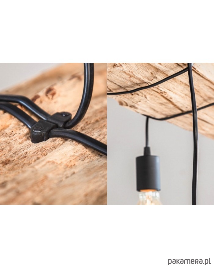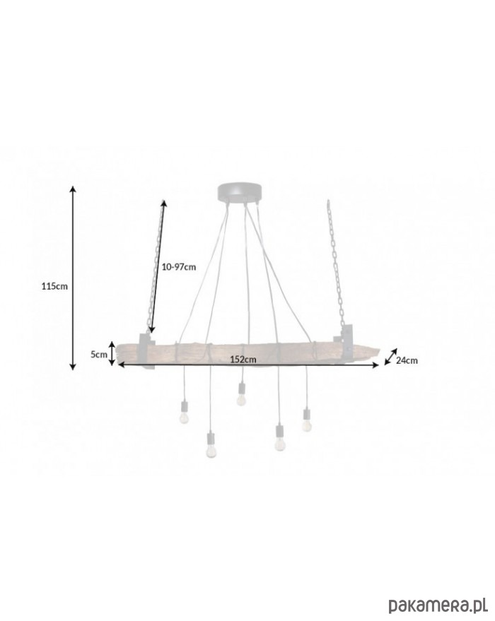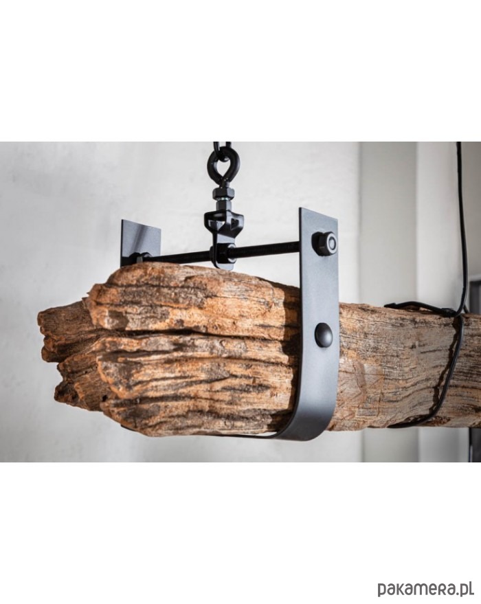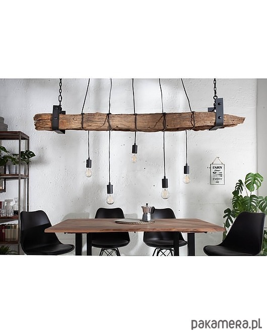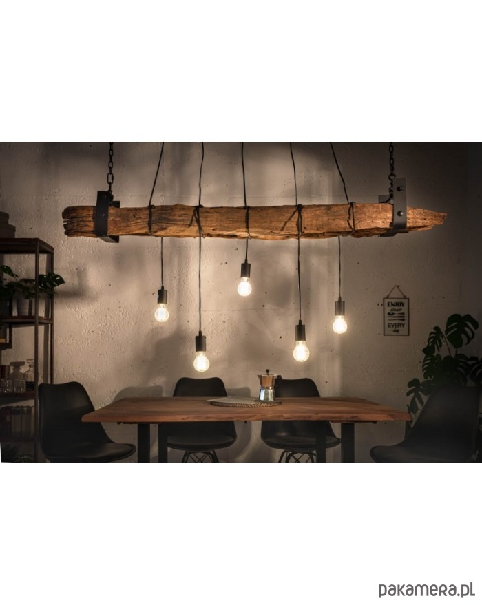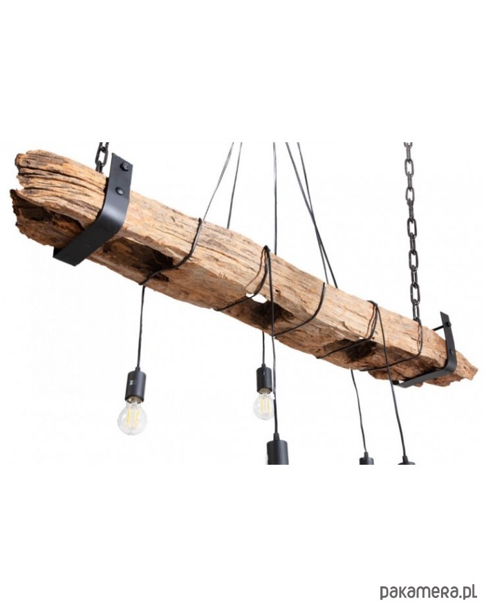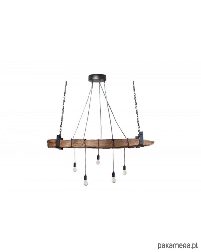 Duża lampa wisząca wykonana z drewna z recyklingu. Może posiadać charakterystyczne dla materiału naturalnego nierówności, przebarwienia, sęki itp. "wady", które czynią go egzemplarzem wyjątkowym. Nie ma dwóch takich samych! Belka, z której zwisa 5 żarówek jest zawieszona na czarnym łańcuchu, który można regulować. Lampa będzie bardzo interesującym akcentem wystroju pokoju.