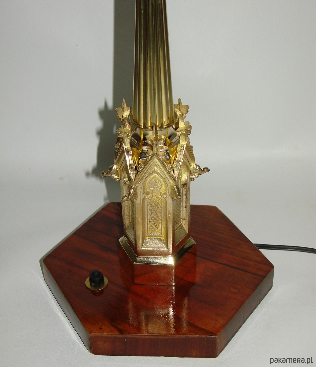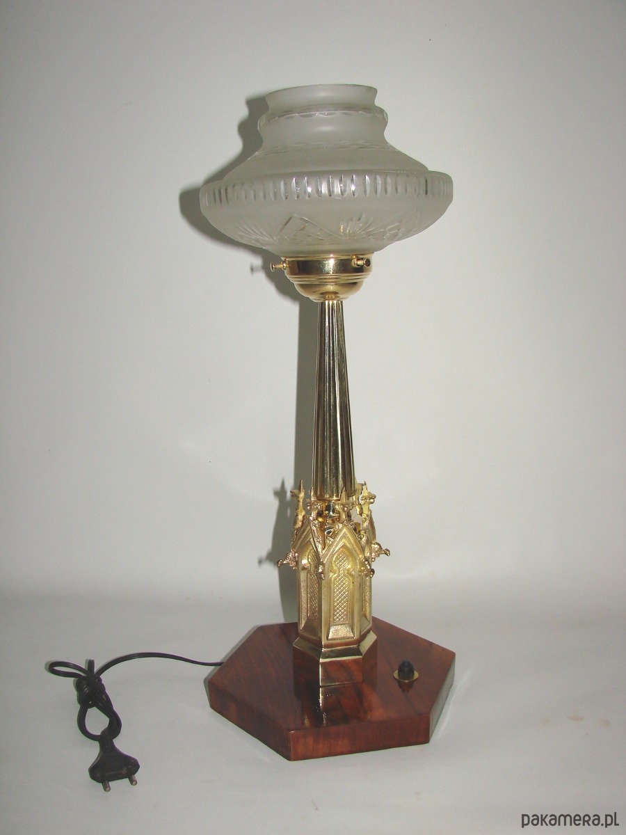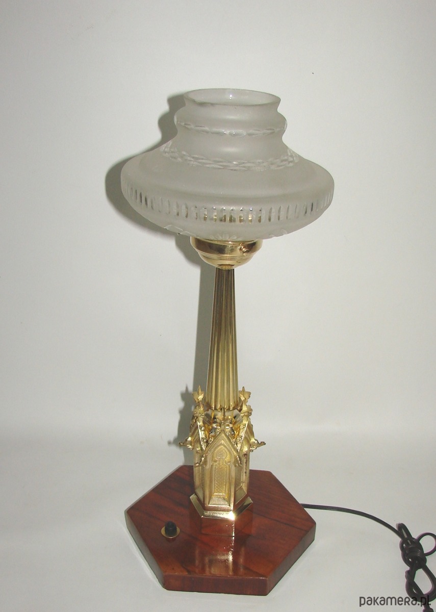 Wyjątkowa lampa gabinetowa pochodząca z lat 20. XX wieku. Konstrukcja wykonana z mosiądzu, osadzona na drewnianej podstawie, z kloszem ze szkła. Dekoracyjna forma z wyraźnymi nawiązaniami do stylistyki okresu międzywojennego nadaje lampie elegancki, reprezentacyjny charakter.
