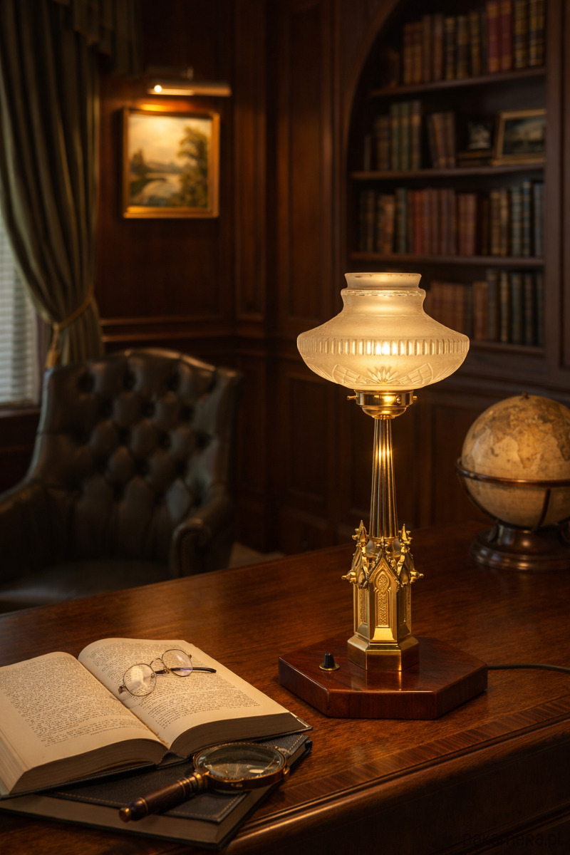 Lampa doskonale sprawdzi się w gabinecie, bibliotece, salonie lub jako nastrojowe oświetlenie boczne. Stanowi zarówno funkcjonalne źródło światła, jak i dekoracyjny element wnętrza w stylu klasycznym, art déco lub vintage.