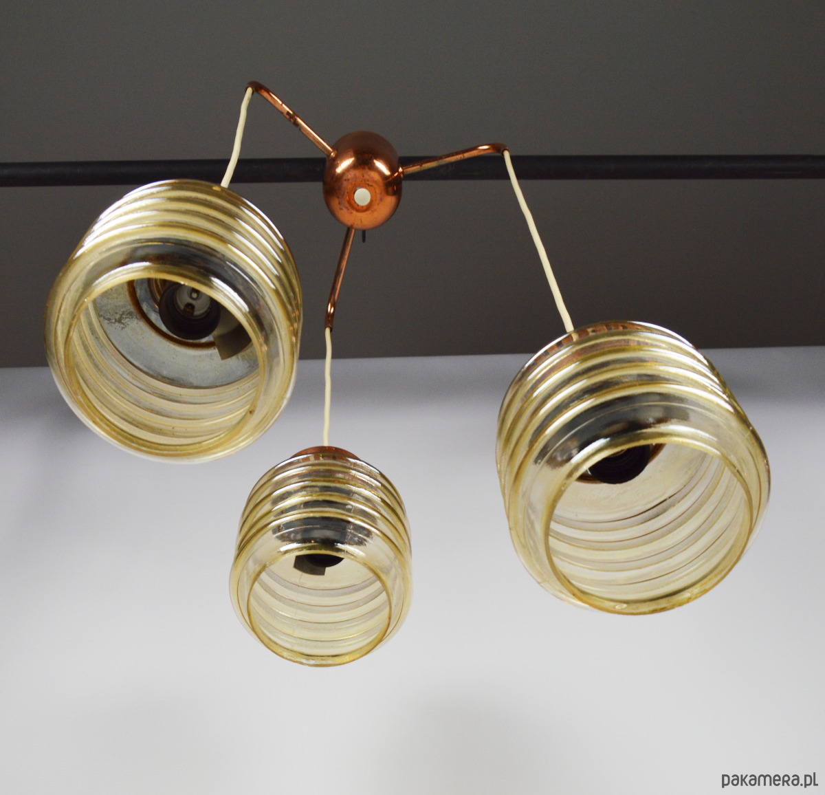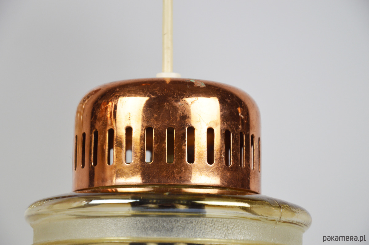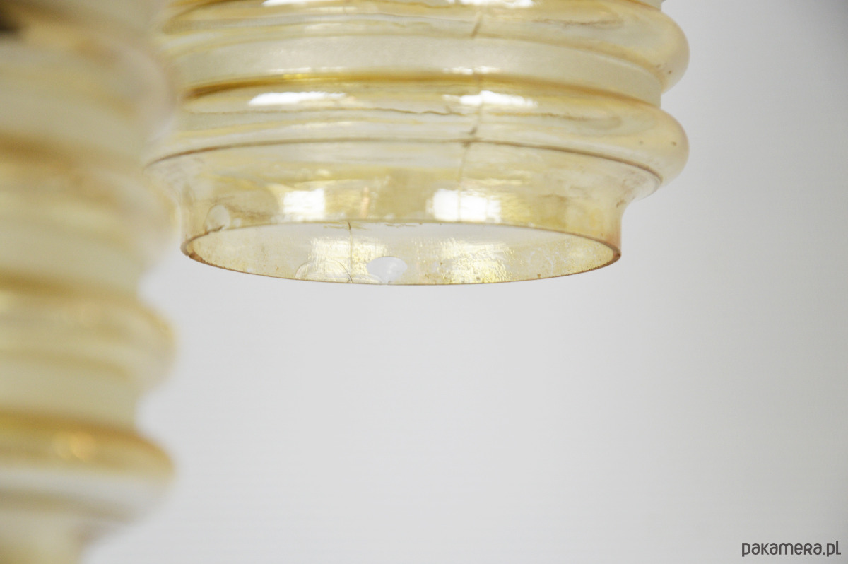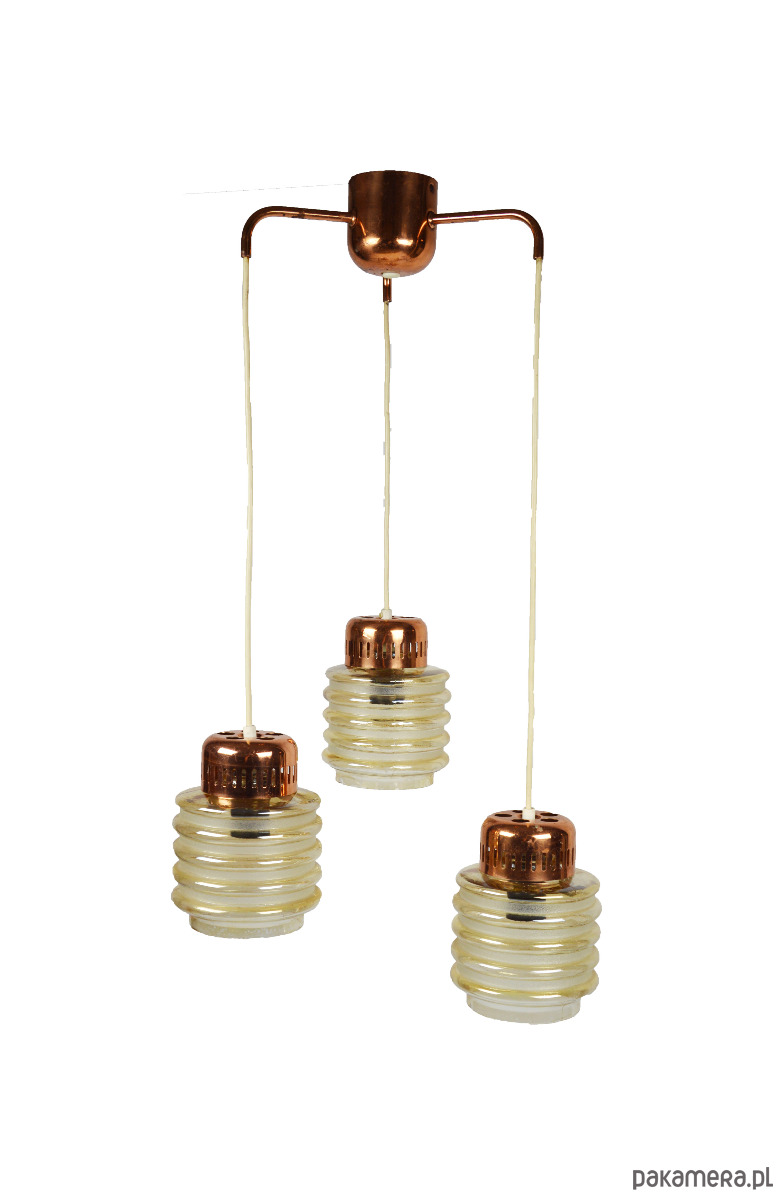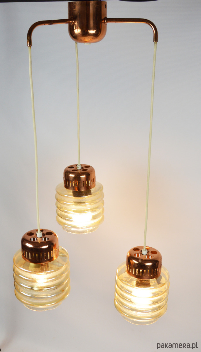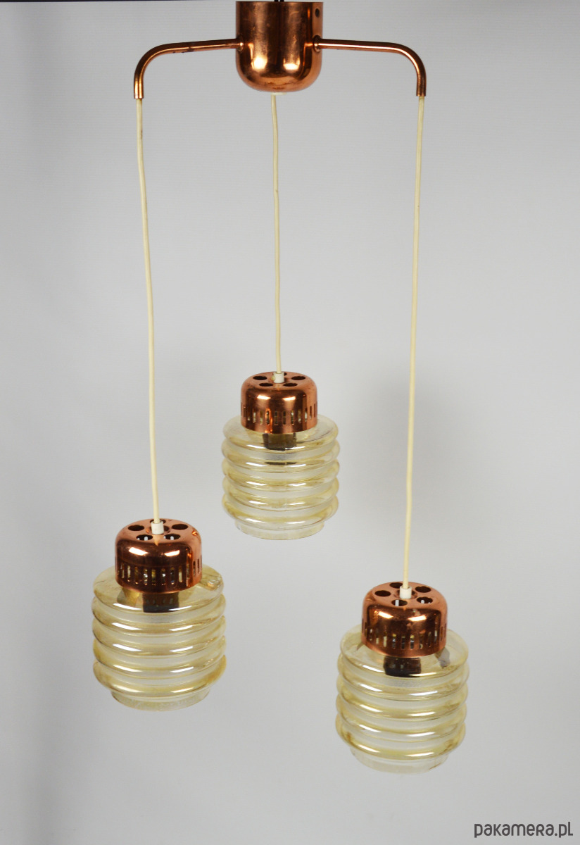 Lampa kaskadowa z trzema miodowymi kloszami z lat 70. Każdy klosz można zawiesić na innej wysokości według uznania. Stan zachowania dobry, widoczne niewielkie uszczerbki na końcach szklanych kloszy oraz utlenienia metalowych elementów.