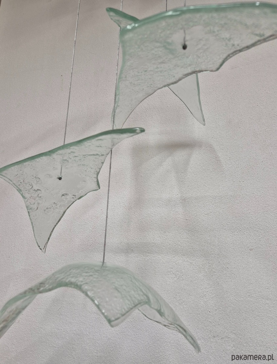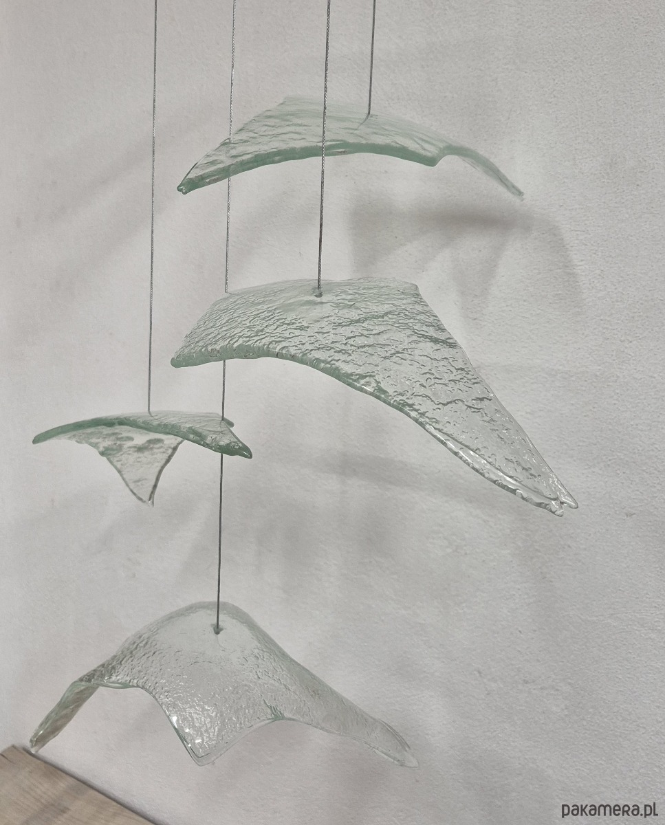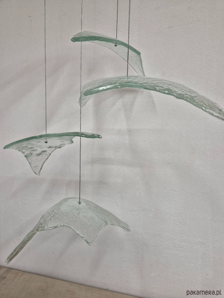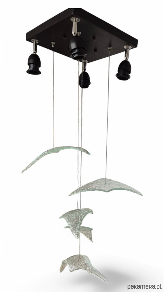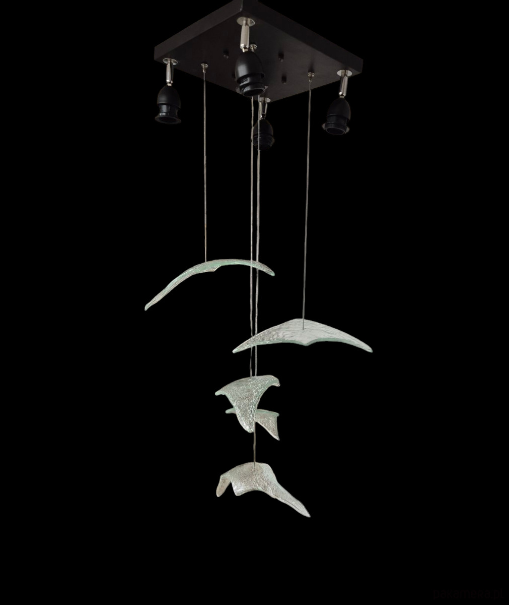 Autorska lampa , jest to kompozycja złożona z pięciu sztuk szklanych wyprofilowanych szkieł w formie lecących ptaków. Szkło jest formowane w temperaturze 820 stopni i każde z nich jest unikatowe. Całość jest zawieszona na stalowych cienkich linkach i swobodnie zwisa z szerokojej podsufitki 30x30cm w której zamontowne się cztery regulowane źródła światła E27. Długość linek ptaków są regulowane do 120cm.