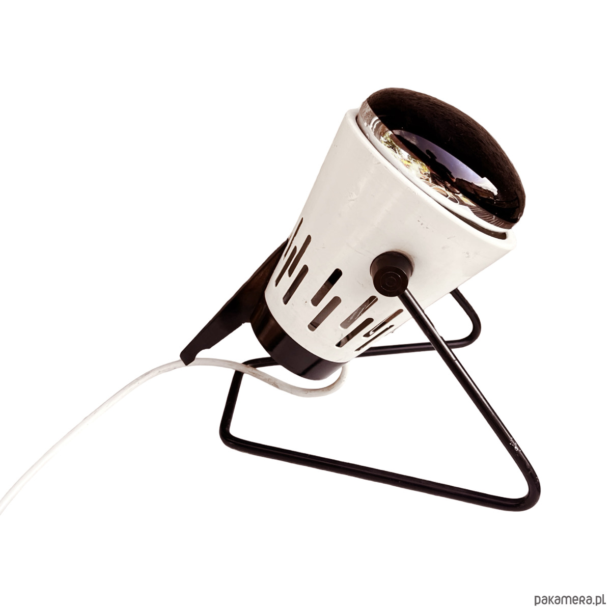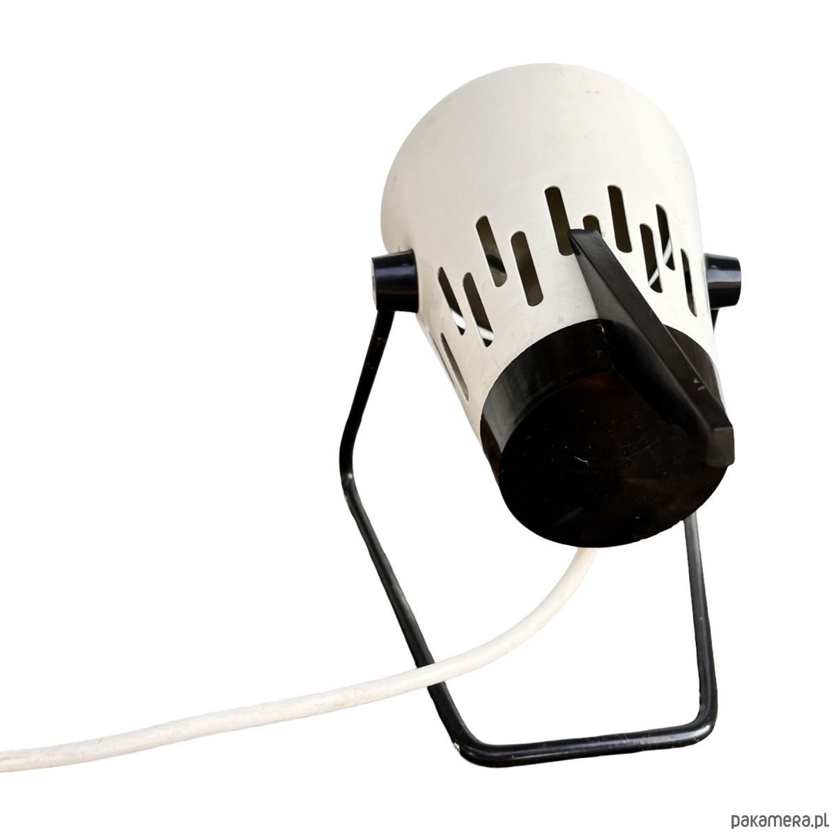 Lampa wykonana z malowanej na biało blachy z czarnym bakelitowym uchwytem. Posiada regulację góra-dół.