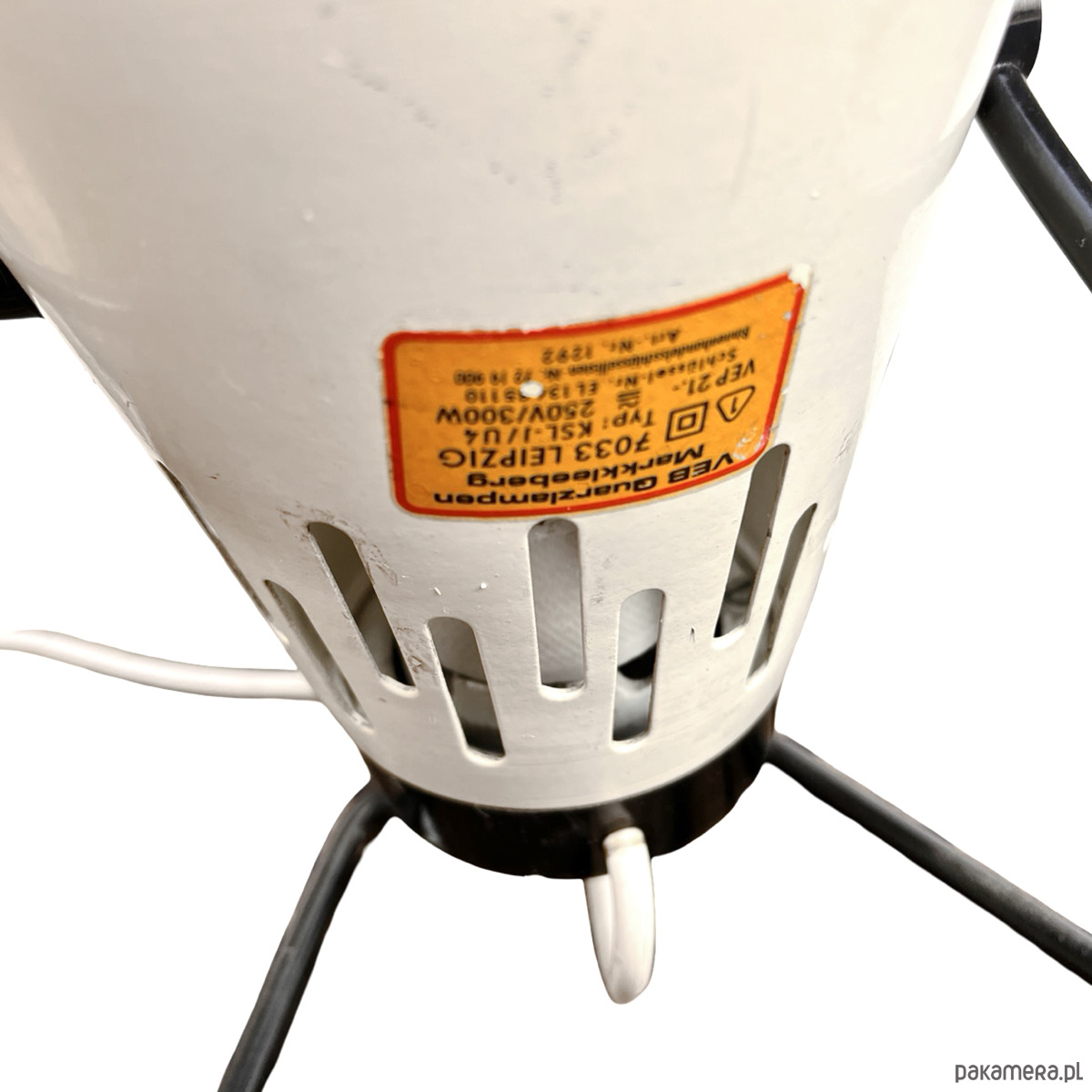Lampa medyczna (z żarówką emitującą światło podczerwone- sprawna, dołączana do zestawu) wyprodukowana przez VEB Quarzlampen Markleeberg w Niemczech w latach 60. Lampa może służyć również jako lampa podłogowa lub biurkowa tworząc ciekawy nastrój. (Wystarczy w tym celu jedynie wymienić oryginalną żarówkę na żarówkę emitującą zwykłe światło). Gwint na żarówkę E27.