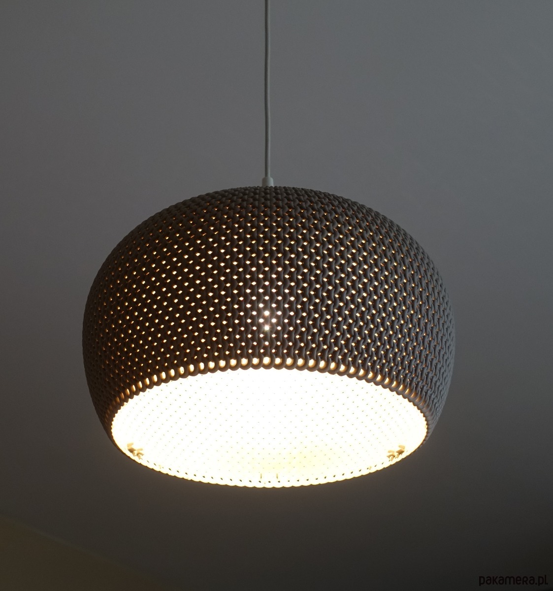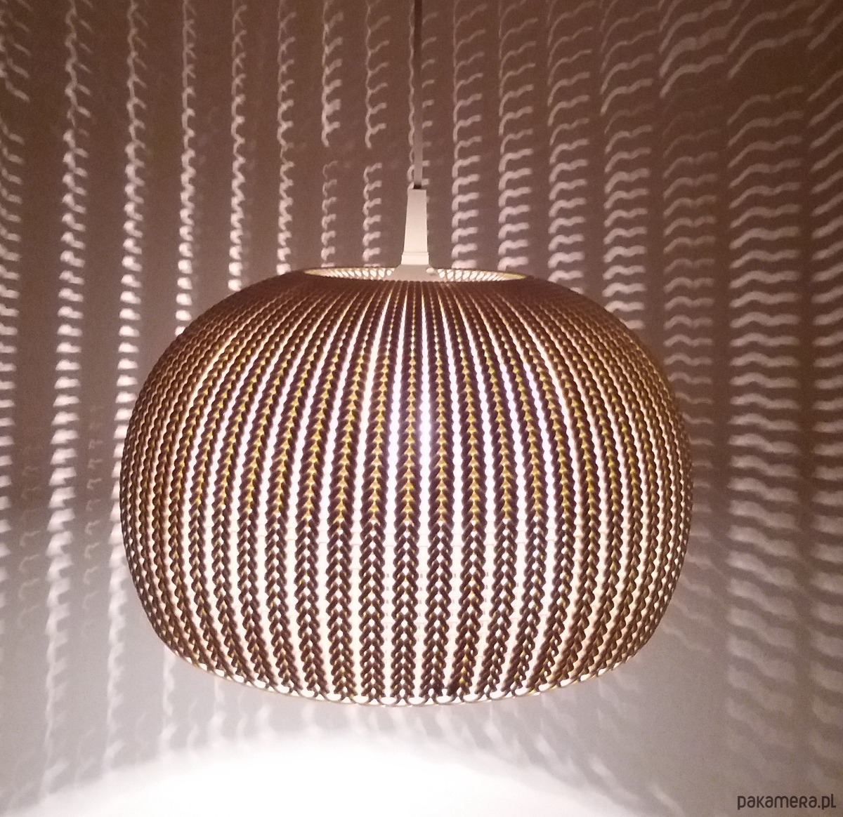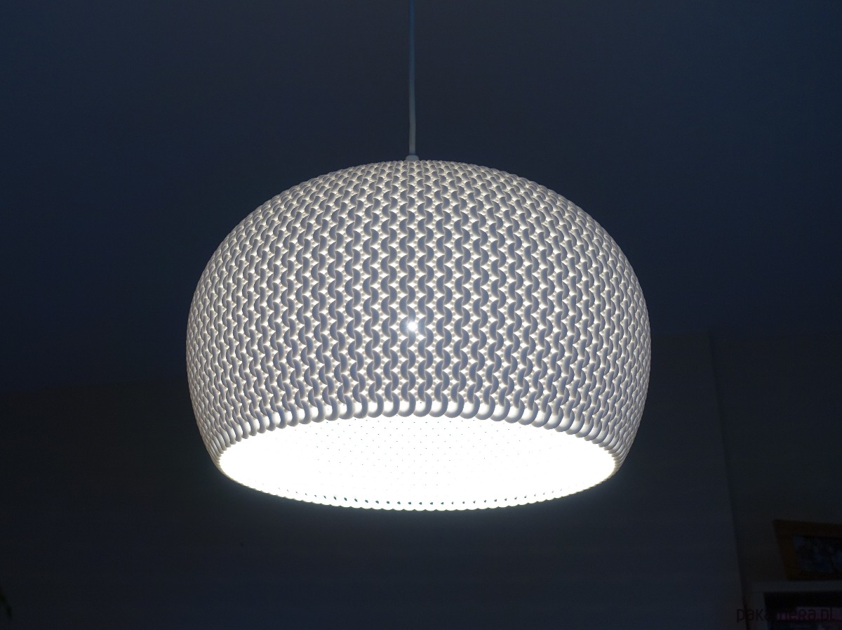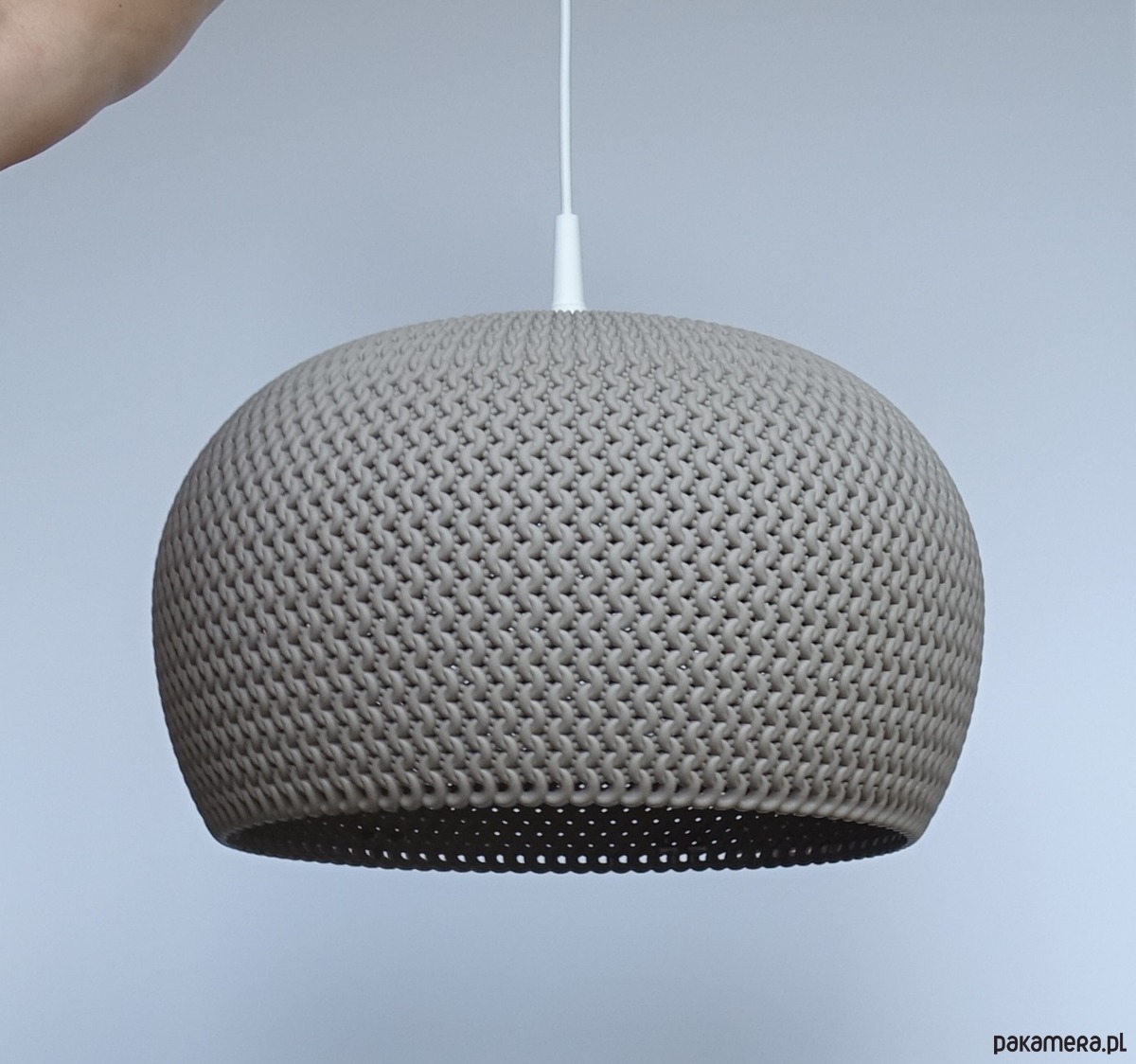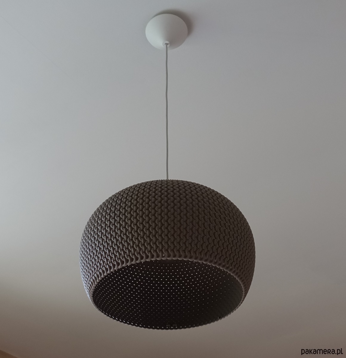 Lampa wisząca jednopunktowa w formie wełnianego beretu, wykonana całkowicie z tworzywa sztucznego.