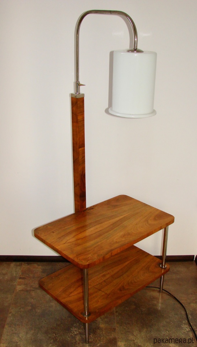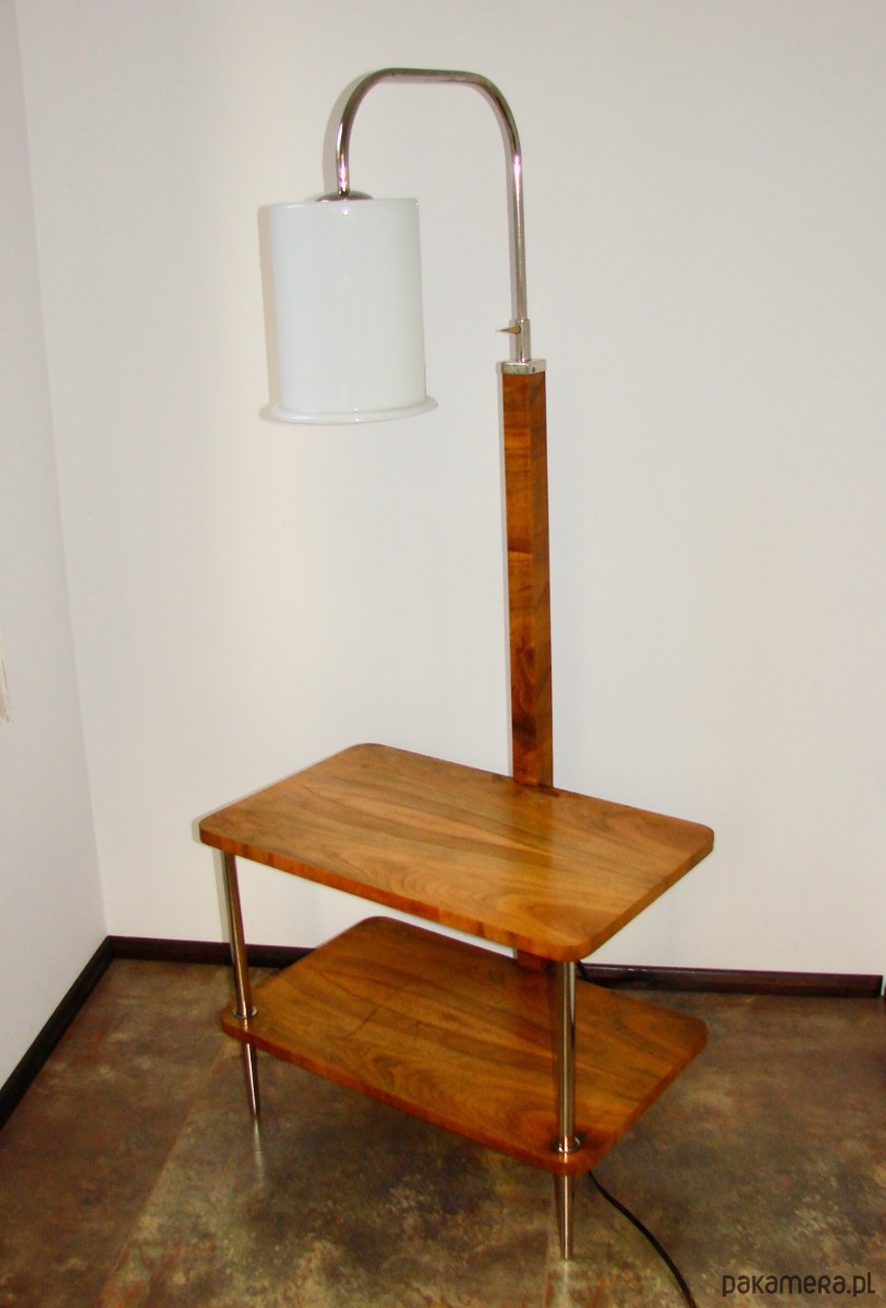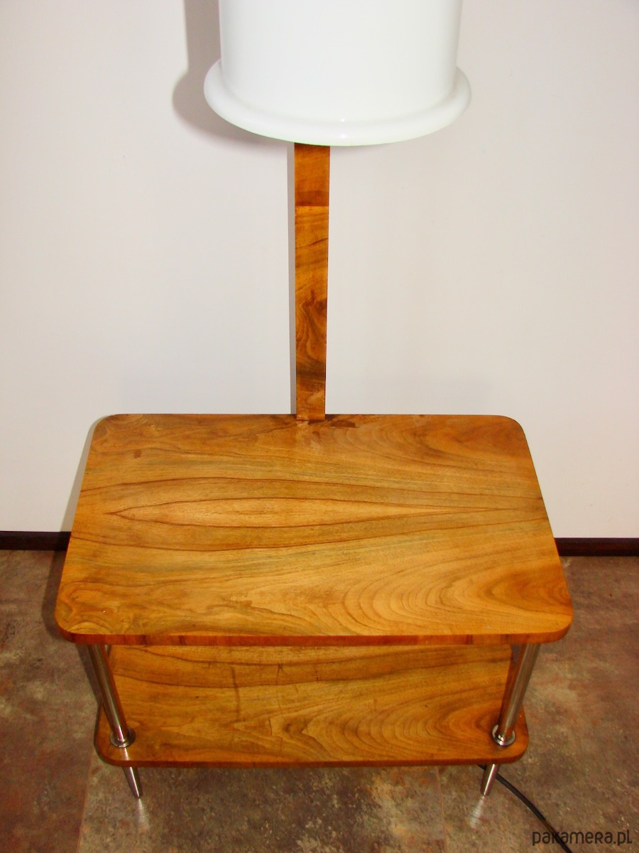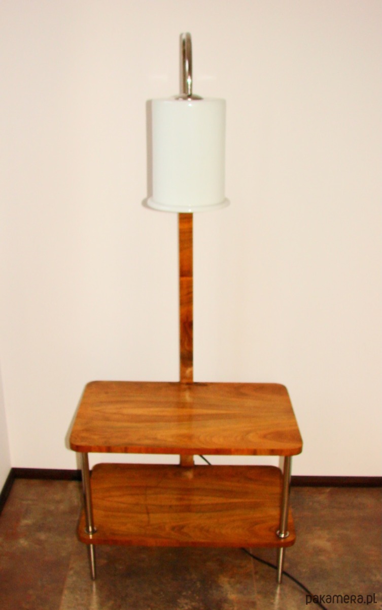 Polska lampa podłogowa z lat 50. w stylu Art Deco, łącząca funkcję oświetlenia i stolika. Wykonana z wysokiej jakości drewna fornirowanego orzechem oraz elementów z mosiądzu niklowanego.