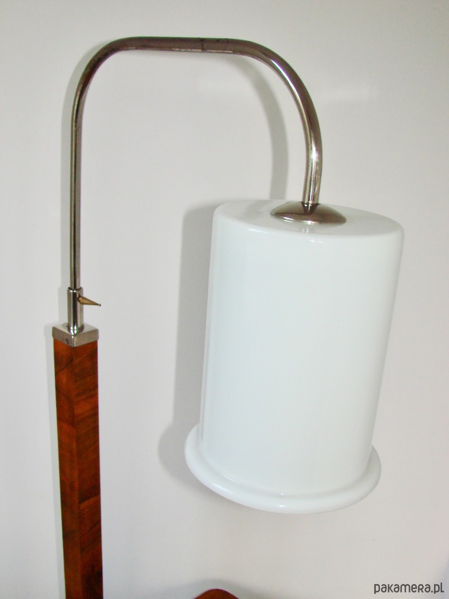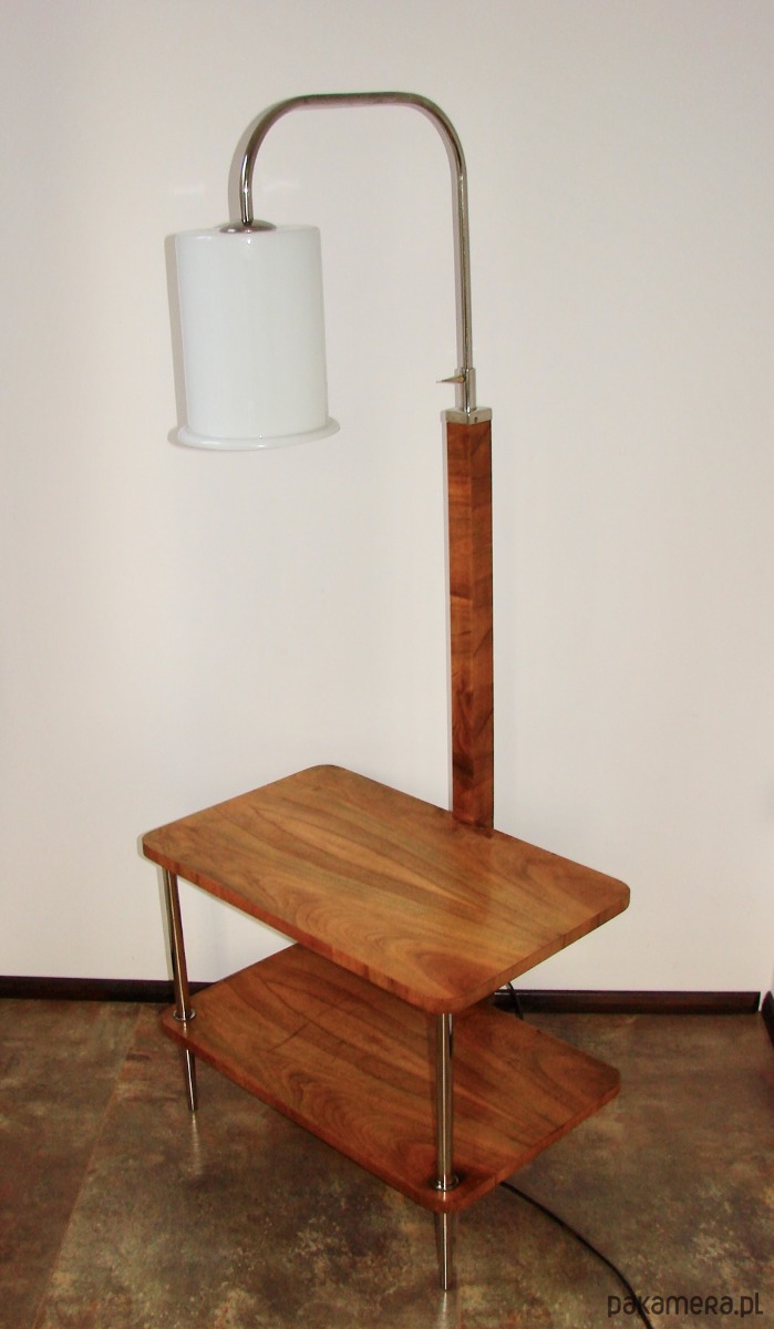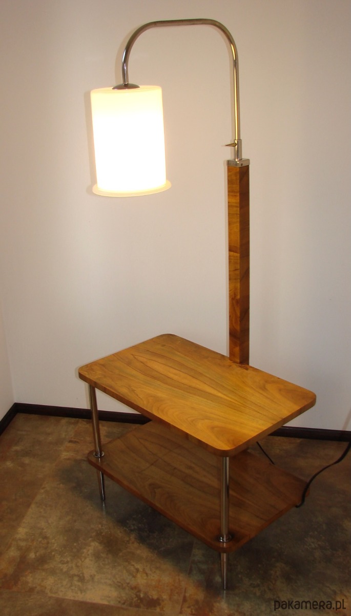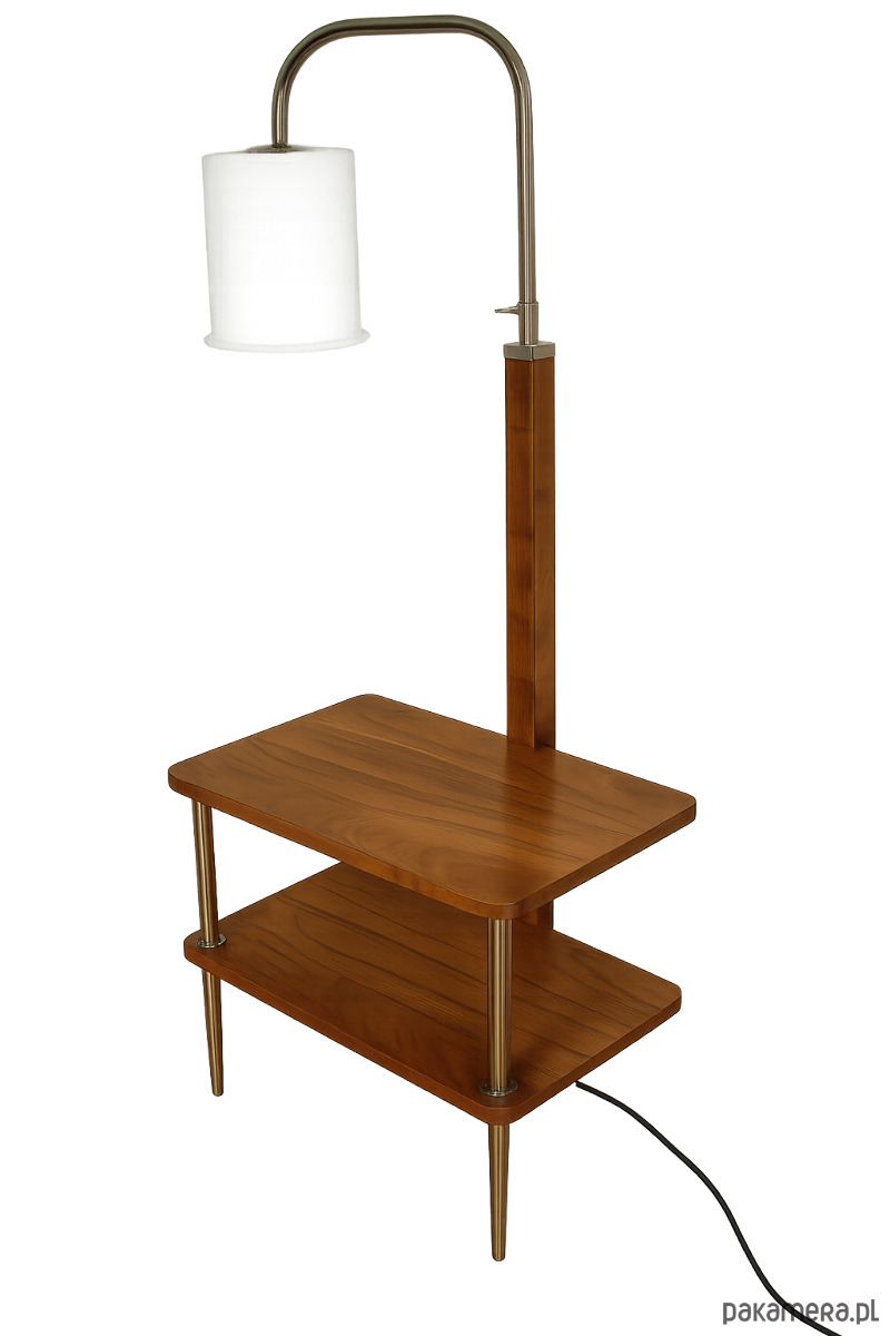 Polska lampa podłogowa z lat 50. w stylu Art Deco, łącząca funkcję oświetlenia i stolika. Wykonana z wysokiej jakości drewna fornirowanego orzechem oraz elementów z mosiądzu niklowanego.