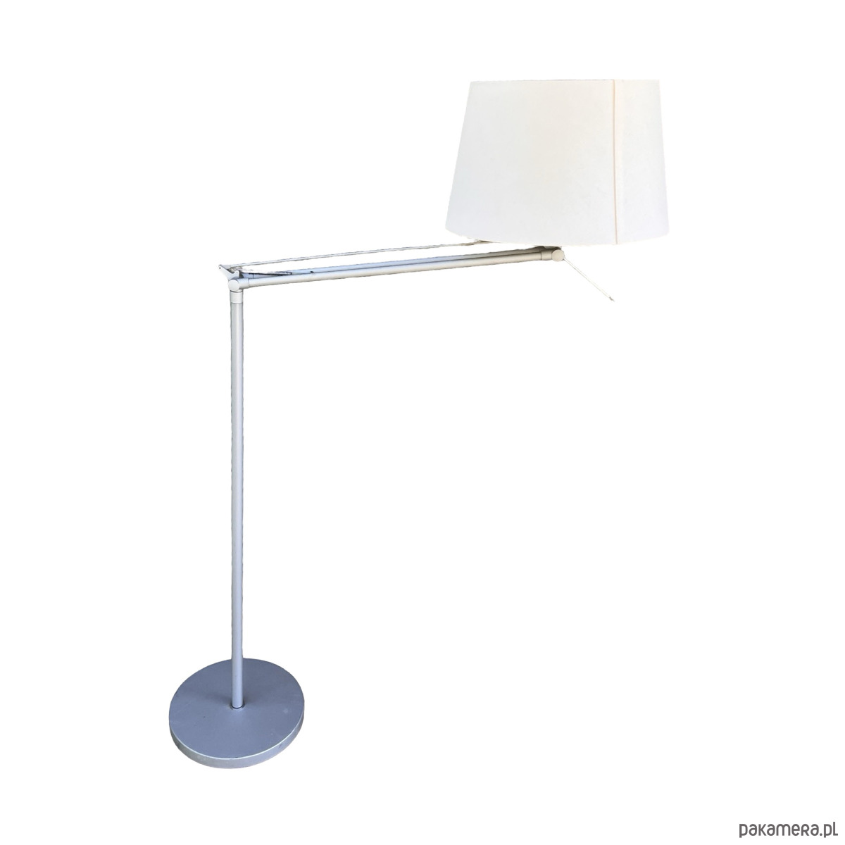Ta uniwersalna lampa podłogowa idealnie sprawdza się jako lampa do czytania lub ambientowa. Posiada stabilną, betonową podstawę, niklowany aluminiowy trzon i biały klosz z polipropylenu, który delikatnie rozprasza światło. Można ją regulować i skierować w stronę fotela lub kanapy.