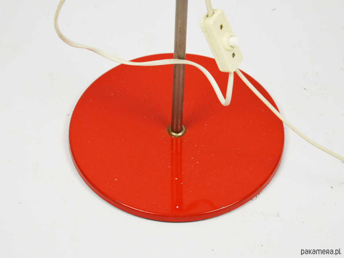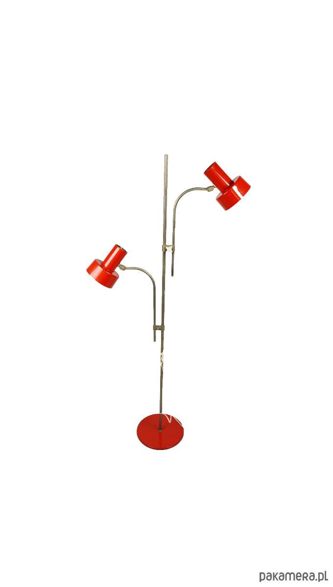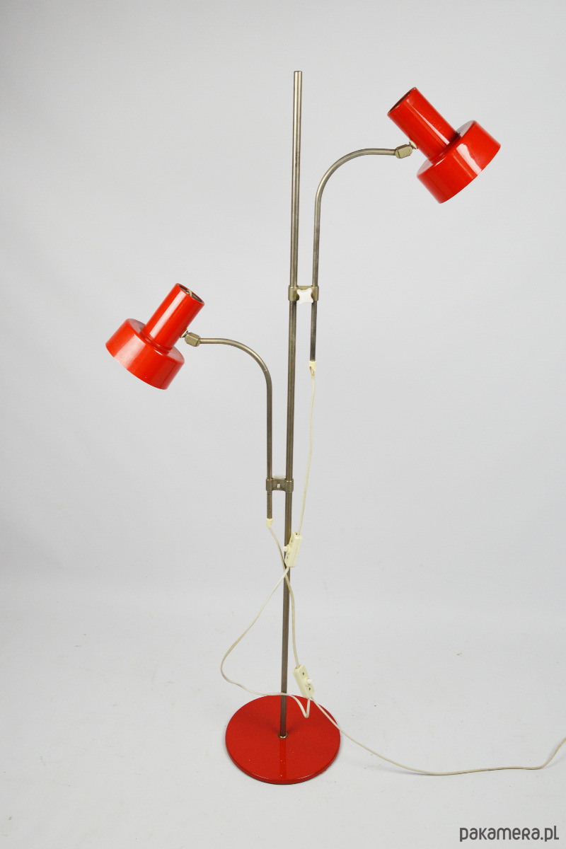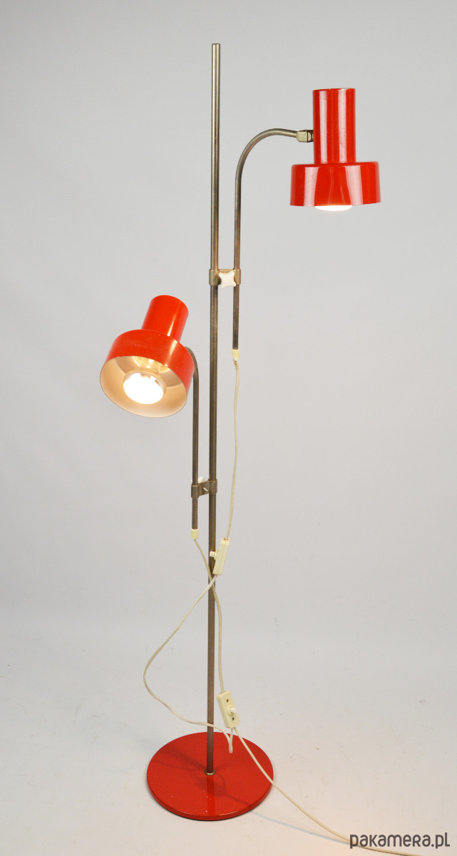 Lampa podłogowa wyprodukowana przez Karl Max Stadt w latach 70. Lampa posiada dwa klosze, które można umieścić na różnej wysokości oraz zapalić niezależnie od siebie. Stan zachowania dobry, widoczne rysy i otarcia.