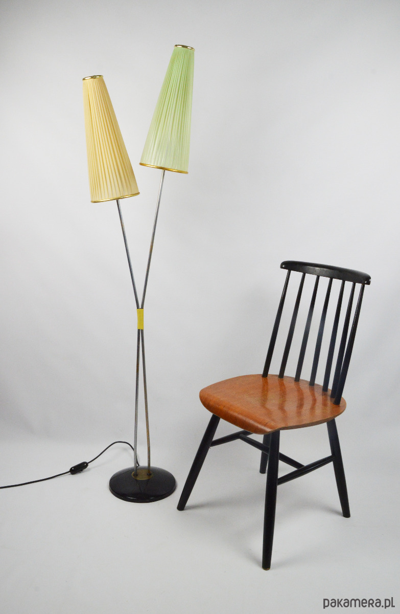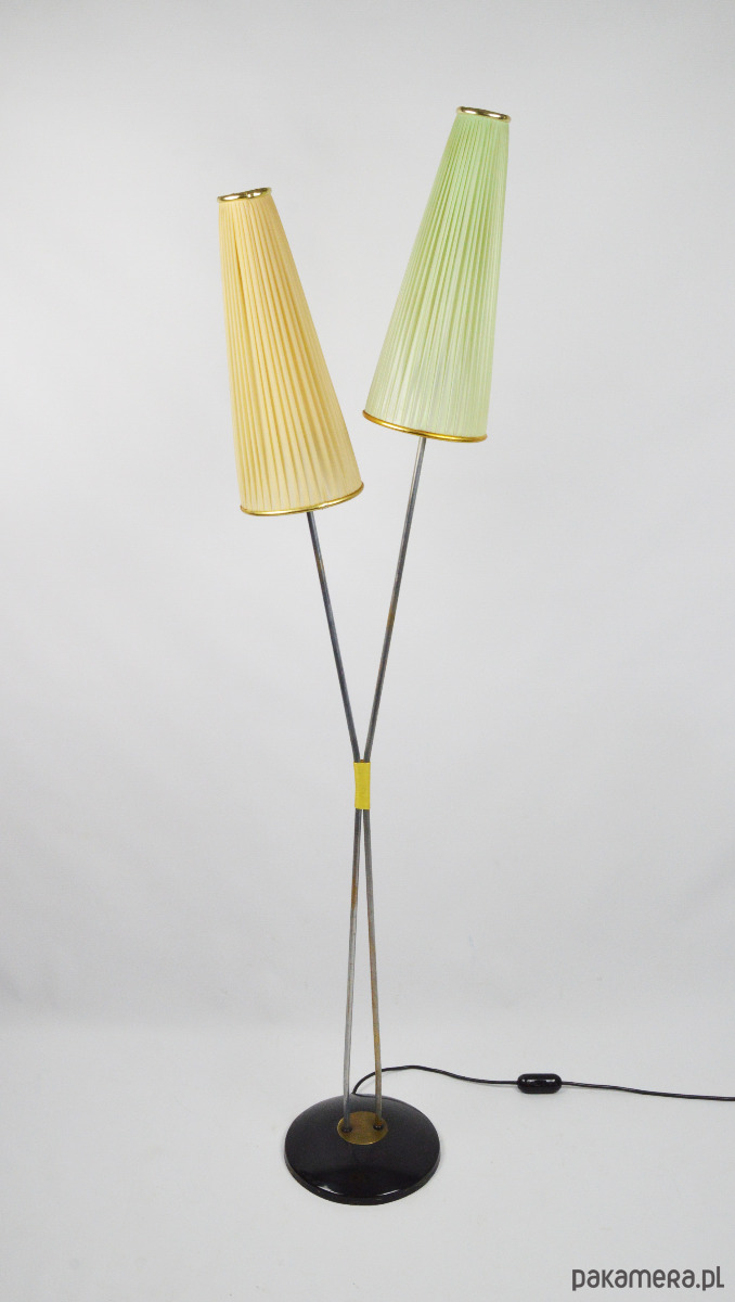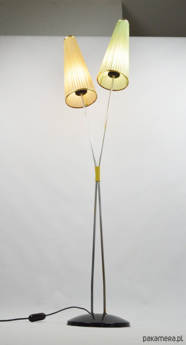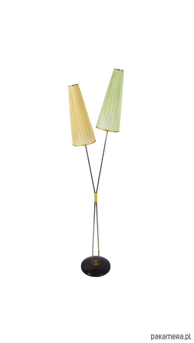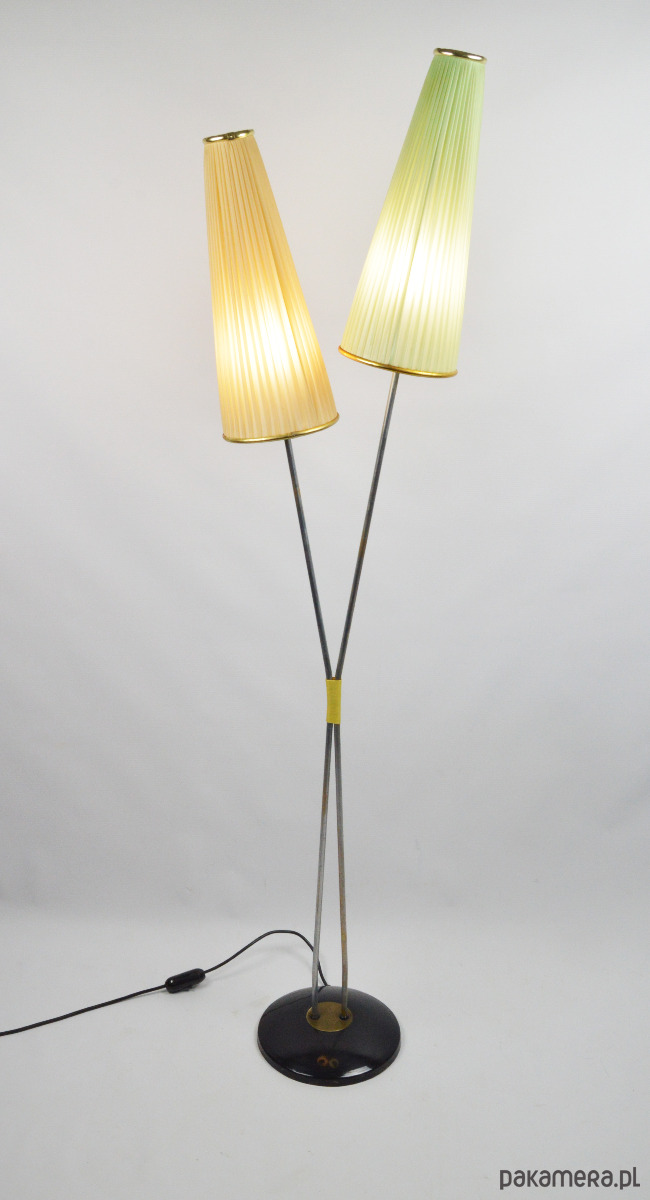Klasyczna przedstawicielka oświetlenia z lat 50. Podwójna lampa podłogowa z dwoma plisowanymi kloszami w kształcie stożków w kolorze pistacjowym i beżowym. Stan zachowania dobry, widoczne utlenienia na metalowych elementach lampy oraz rysy na podstawie. Klosze są całe, widoczne na zdjęciach trwałe zabrudzenia.