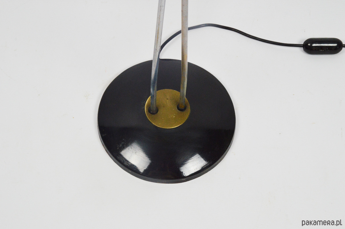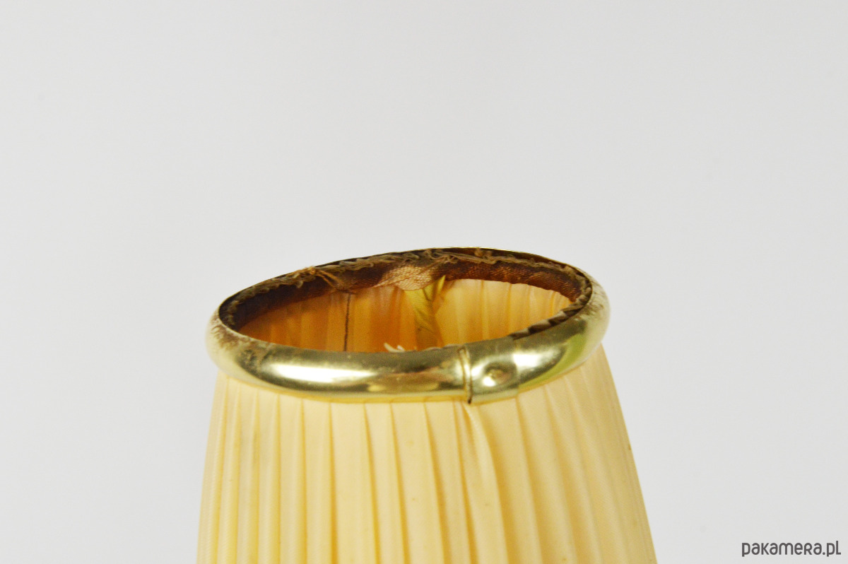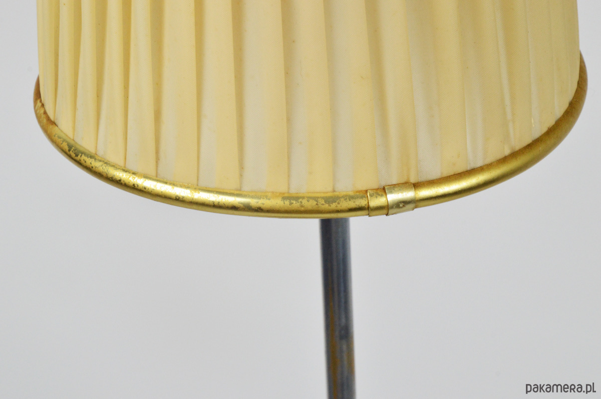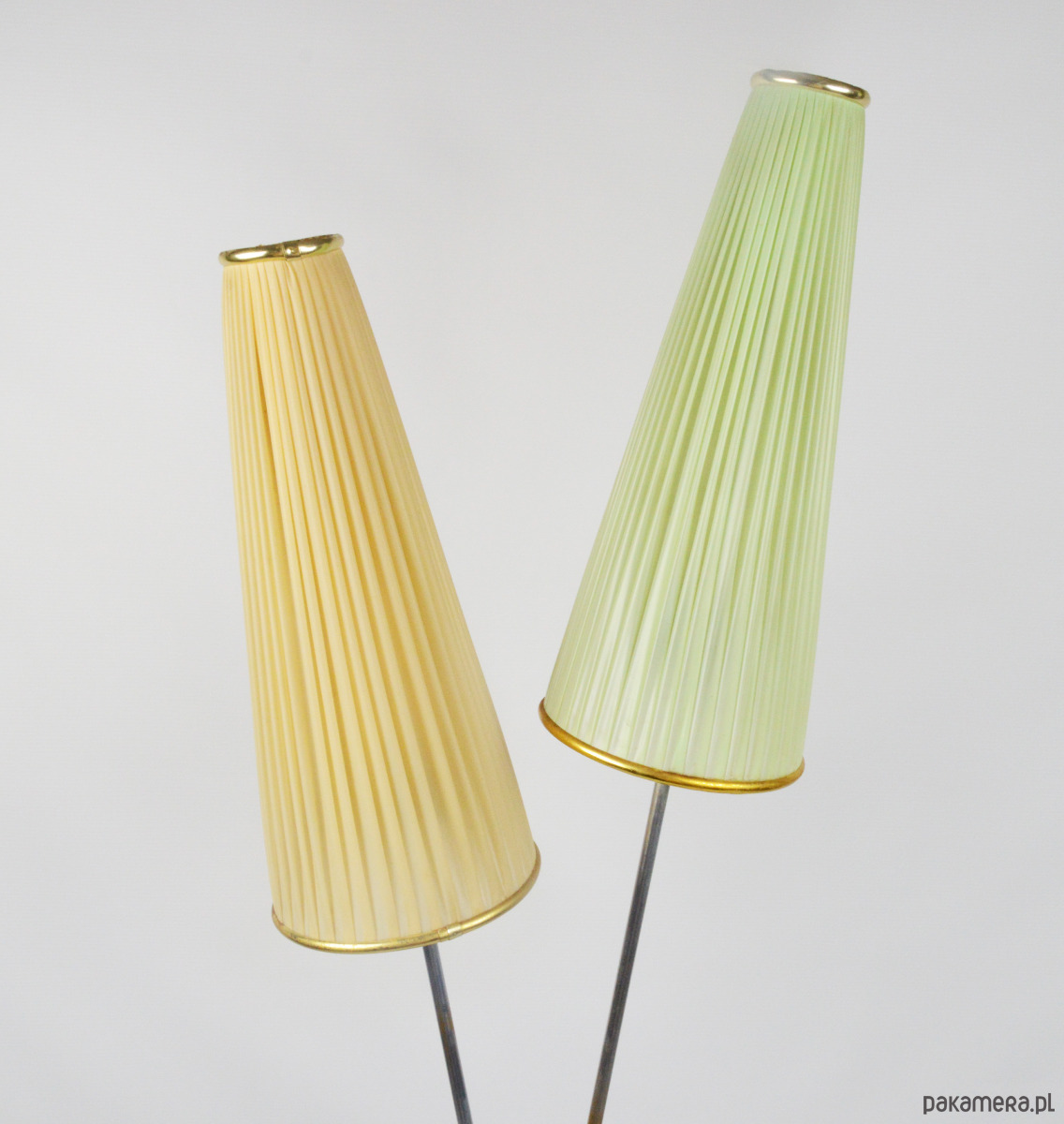 Klasyczna przedstawicielka oświetlenia z lat 50. Podwójna lampa podłogowa z dwoma plisowanymi kloszami w kształcie stożków w kolorze pistacjowym i beżowym. Stan zachowania dobry, widoczne utlenienia na metalowych elementach lampy oraz rysy na podstawie. Klosze są całe, widoczne na zdjęciach trwałe zabrudzenia.