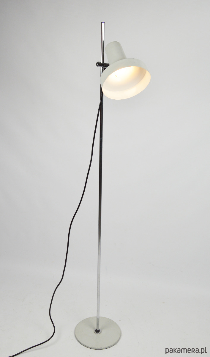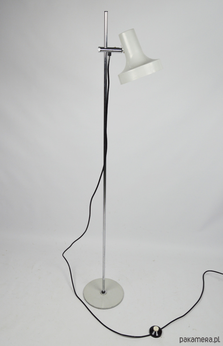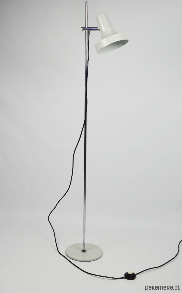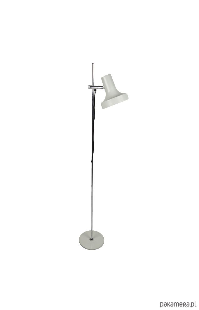 Jasnoszara lampa podłogowa z lat 70. Stan zachowania dobry, widoczne rysy i otarcia.