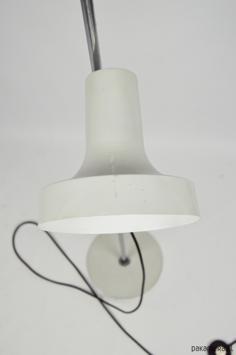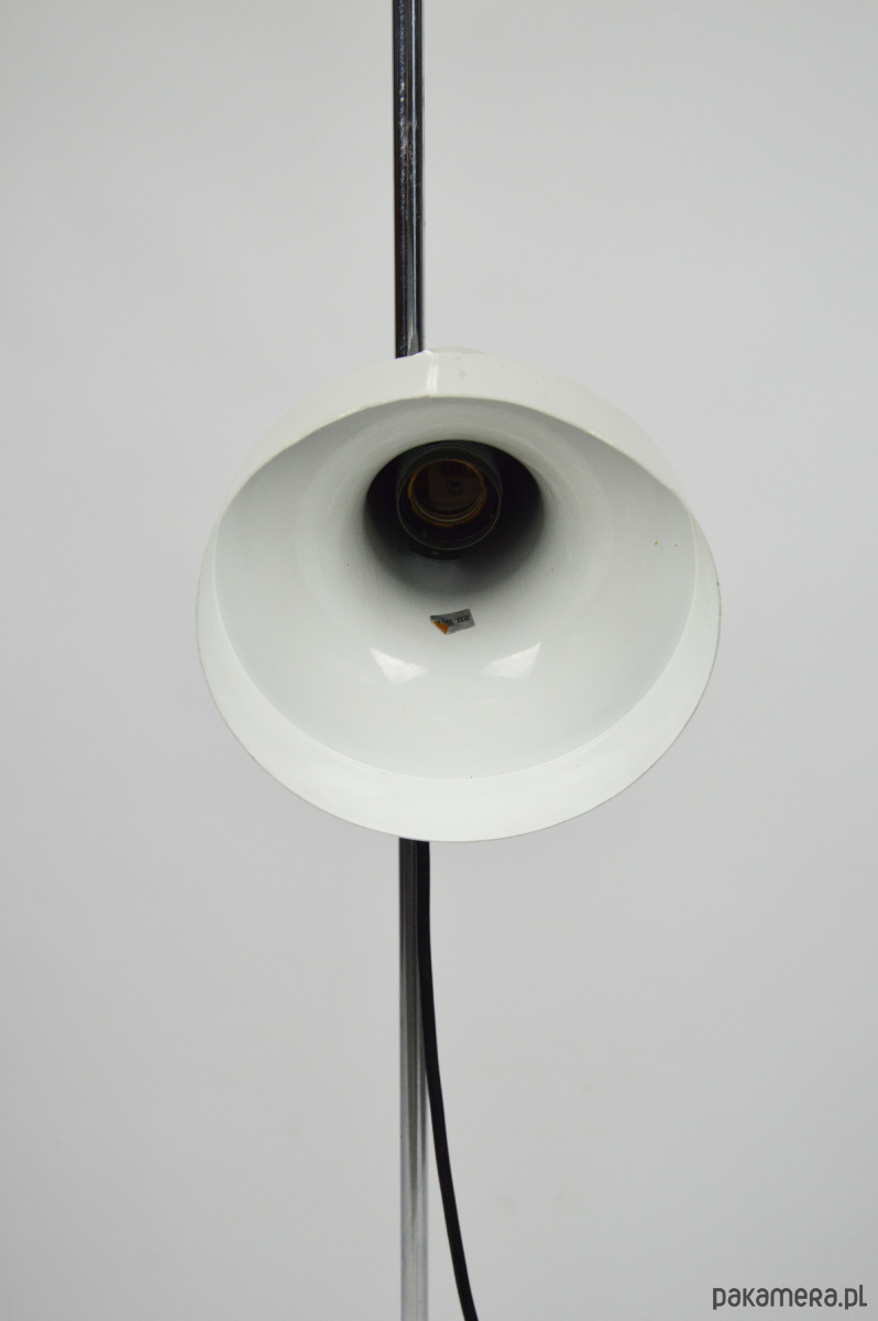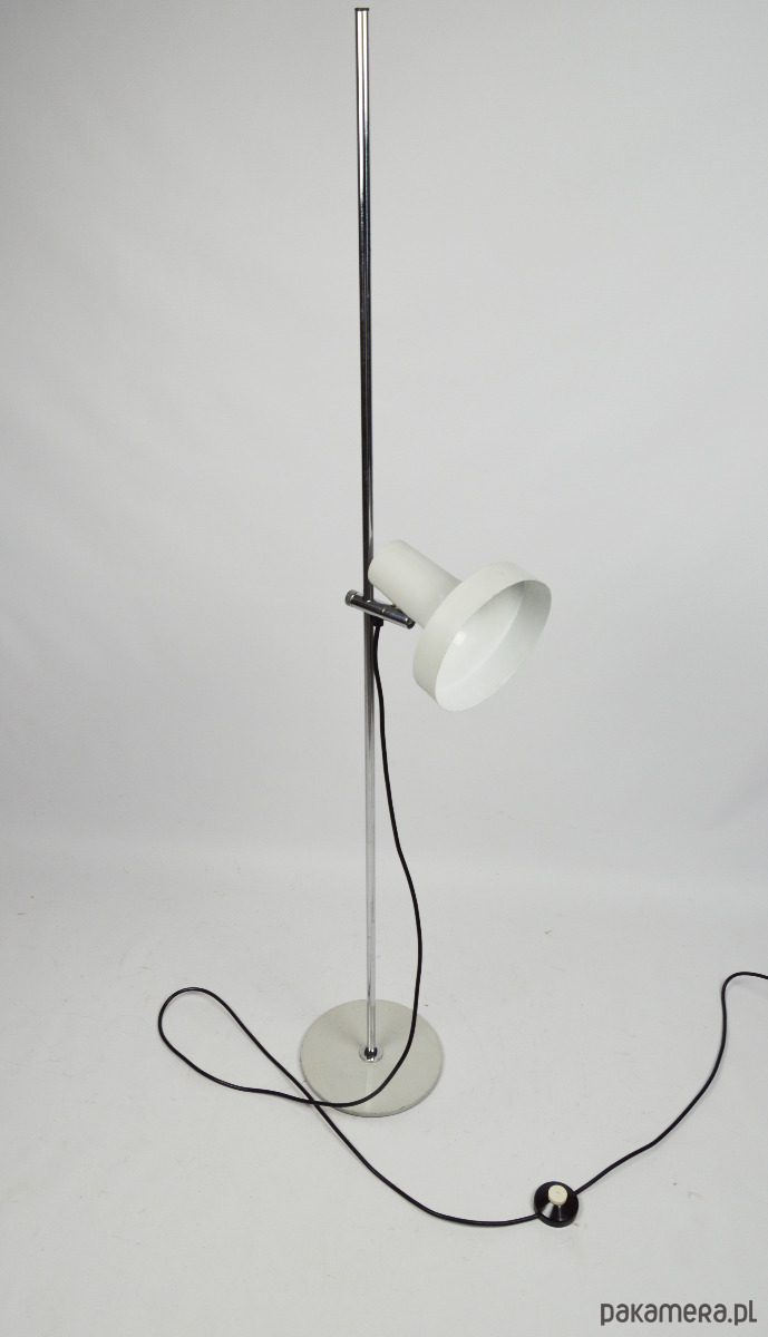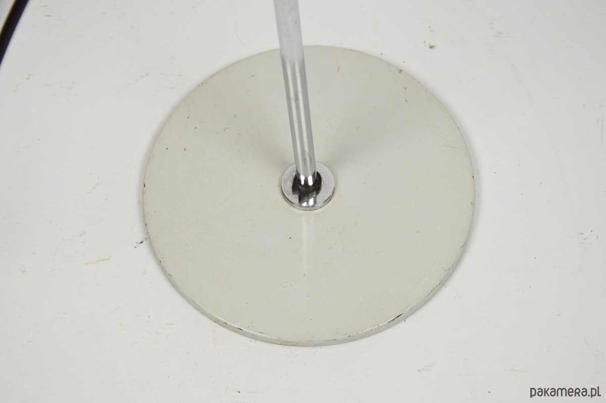 Jasnoszara lampa podłogowa z lat 70. Stan zachowania dobry, widoczne rysy i otarcia.