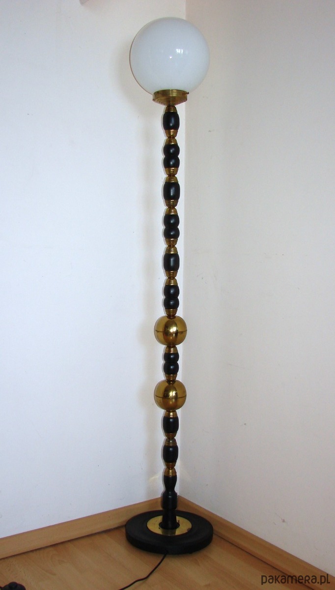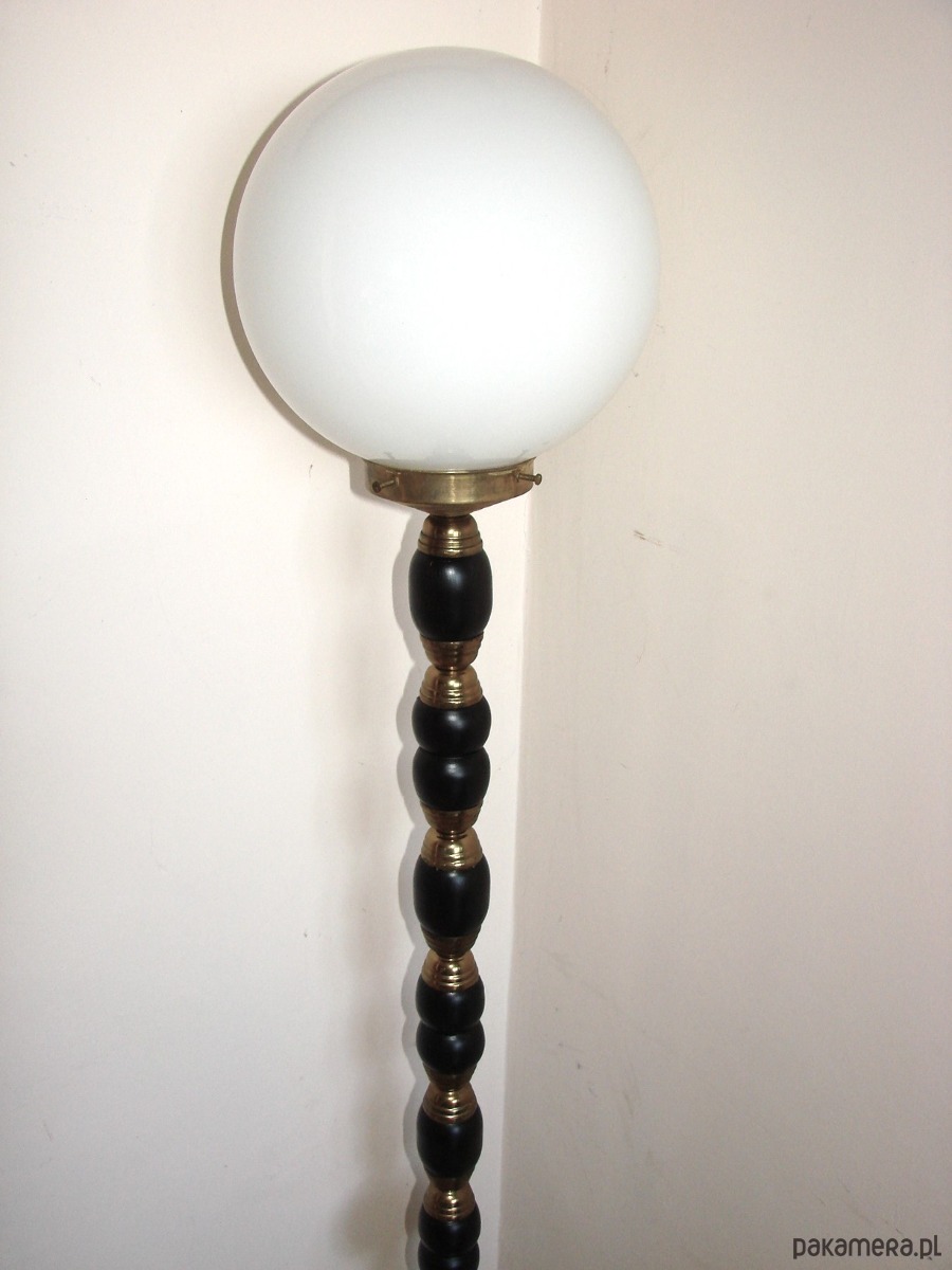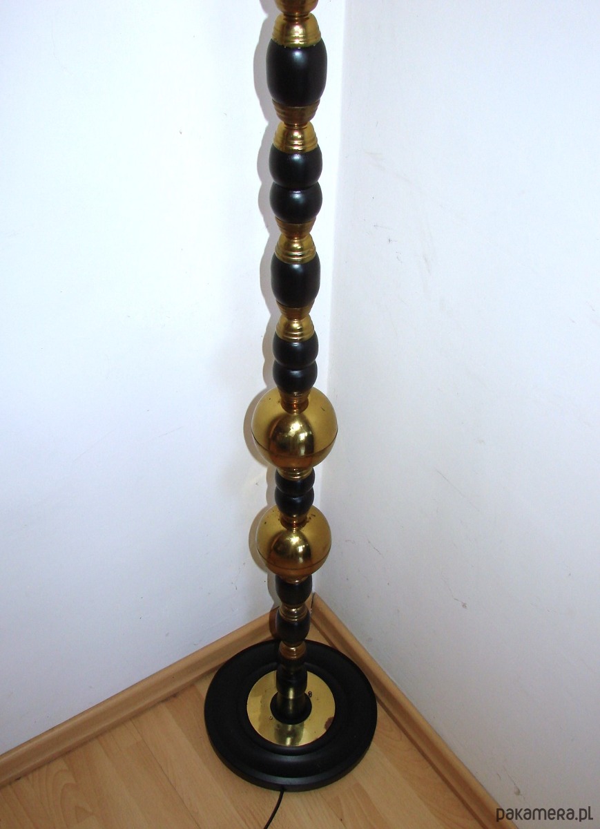 Lampa podłogowa Mid Century, lata 60. Została wykonana z mosiądzu, drewna i szkła. Lampa zachowana jest w dobrym stanie i wymaga żarówki E27