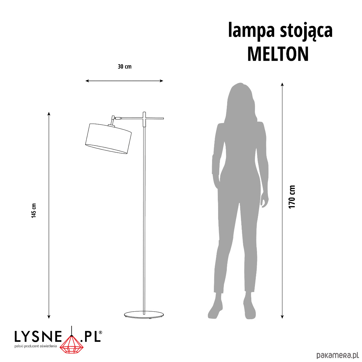 Wymiary lampy (stelaż + abażur): wysokość - 145 cm, szerokość - 30 cm