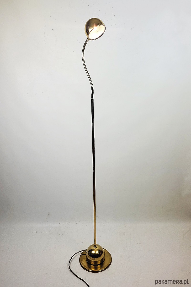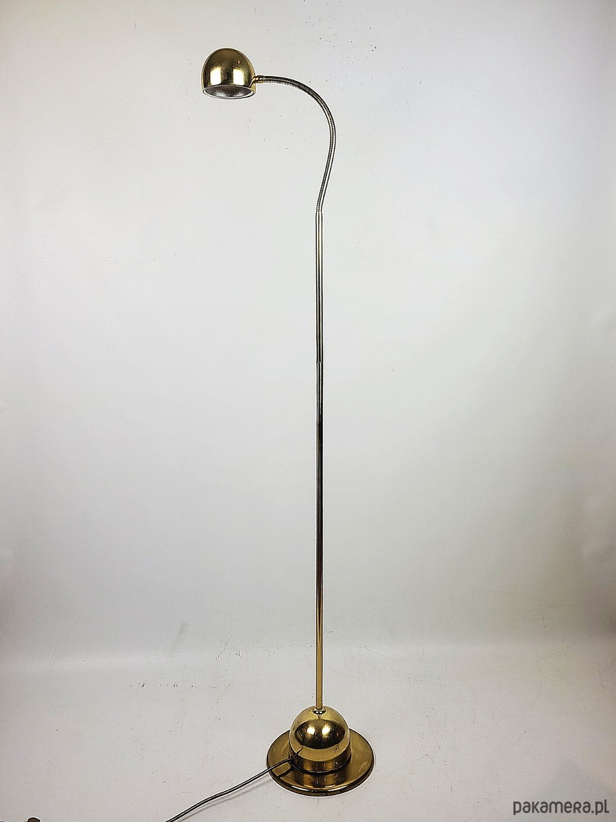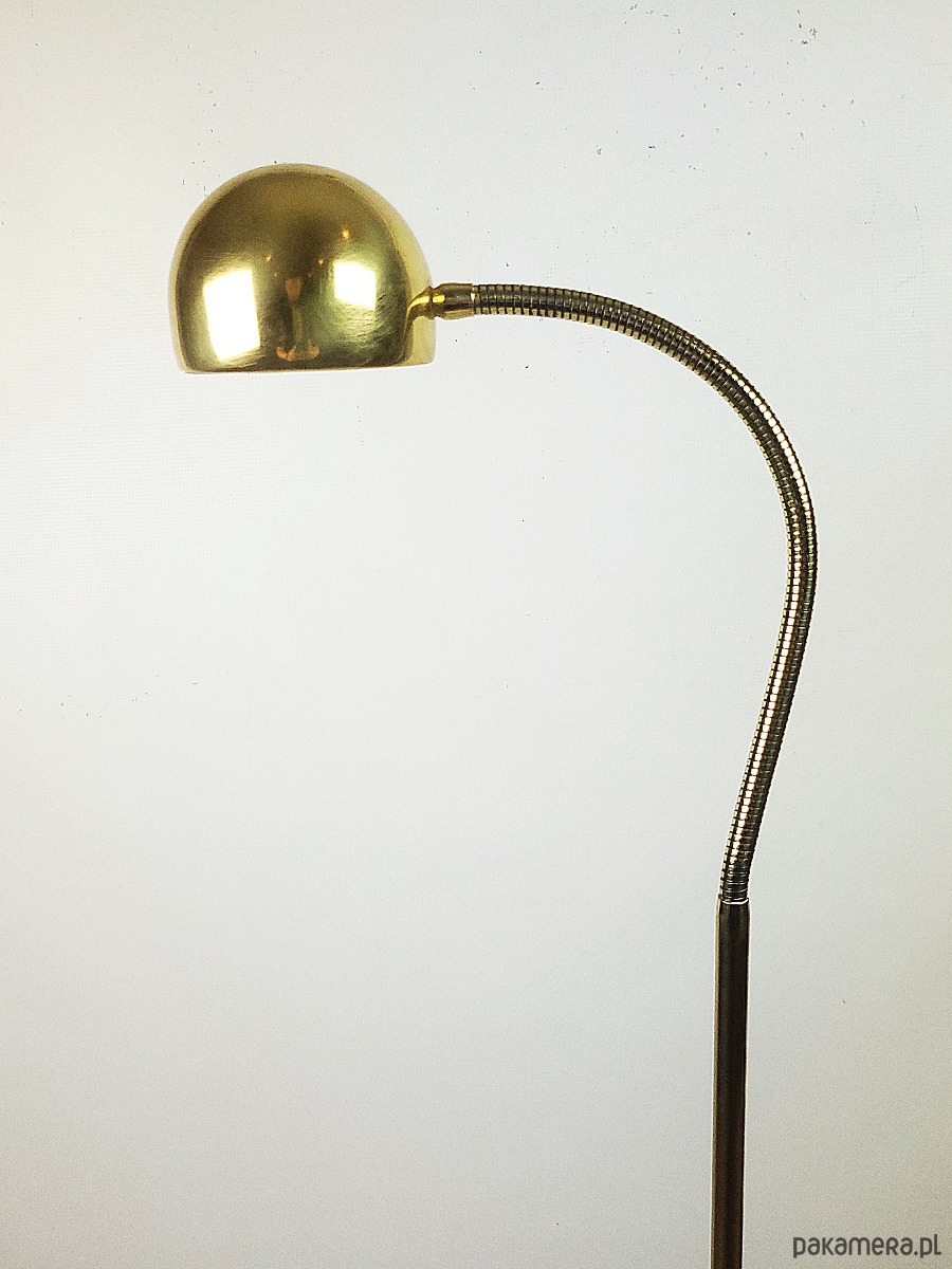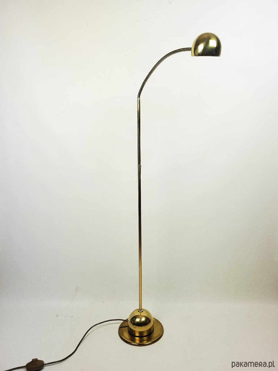 Złota lampa podłogowa z regulacją klosza z lat 80. Stan zachowania dobry, widoczne drobne rysy.