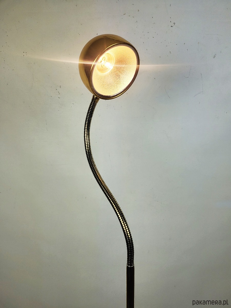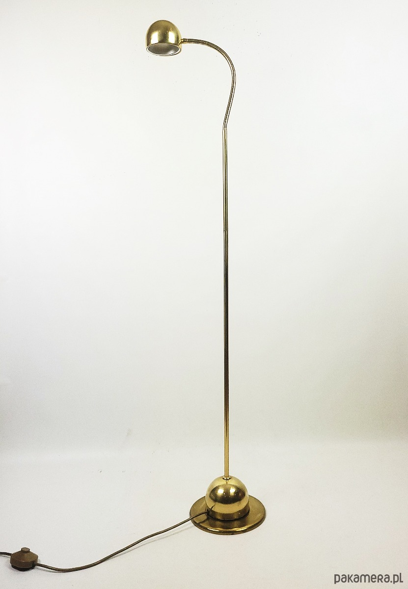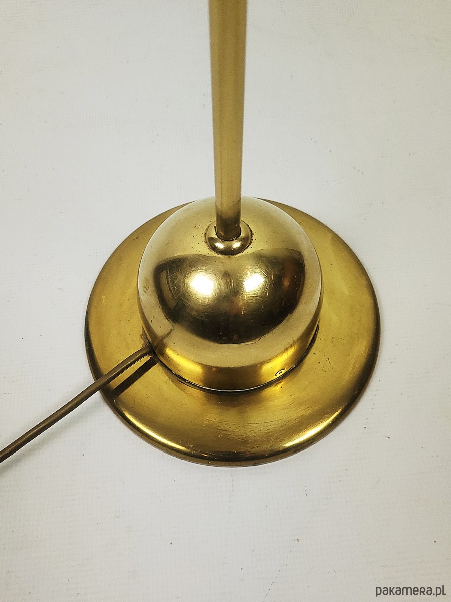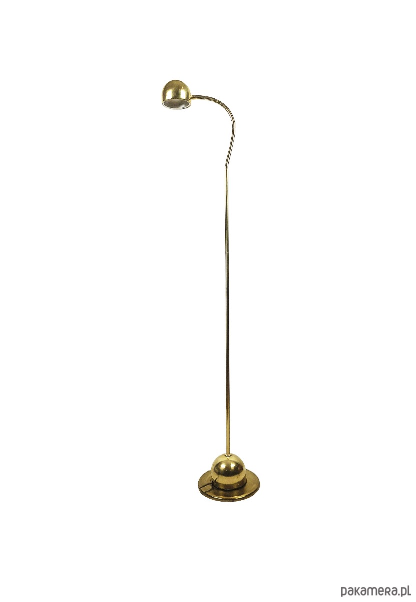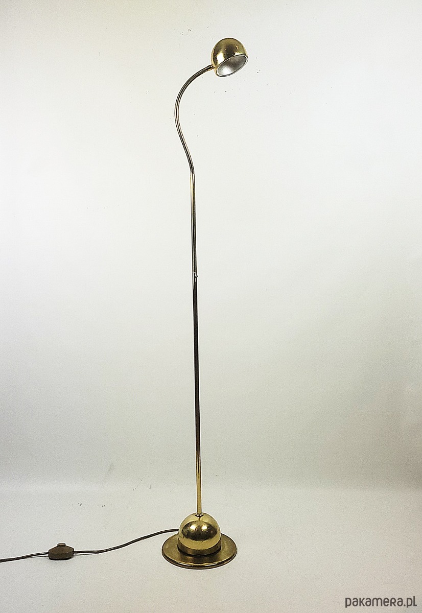 Złota lampa podłogowa z regulacją klosza z lat 80. Stan zachowania dobry, widoczne drobne rysy.