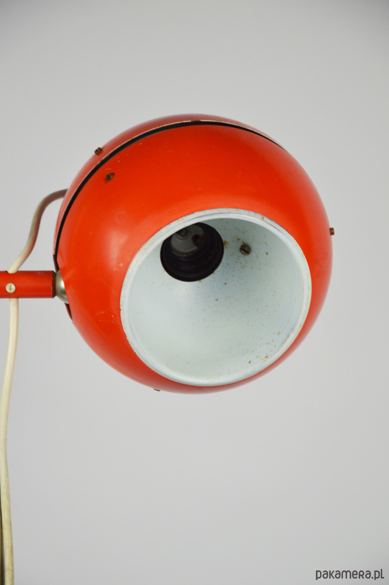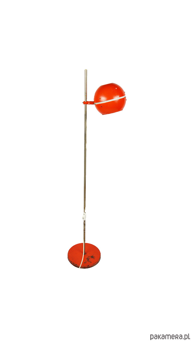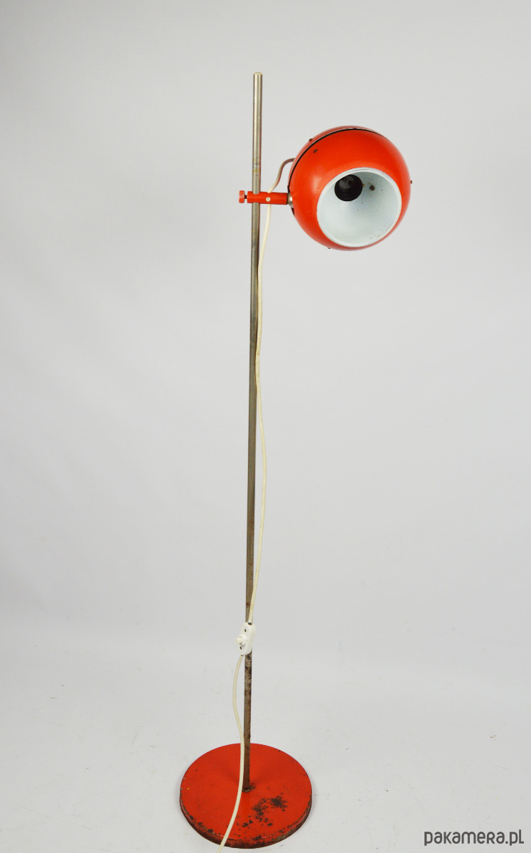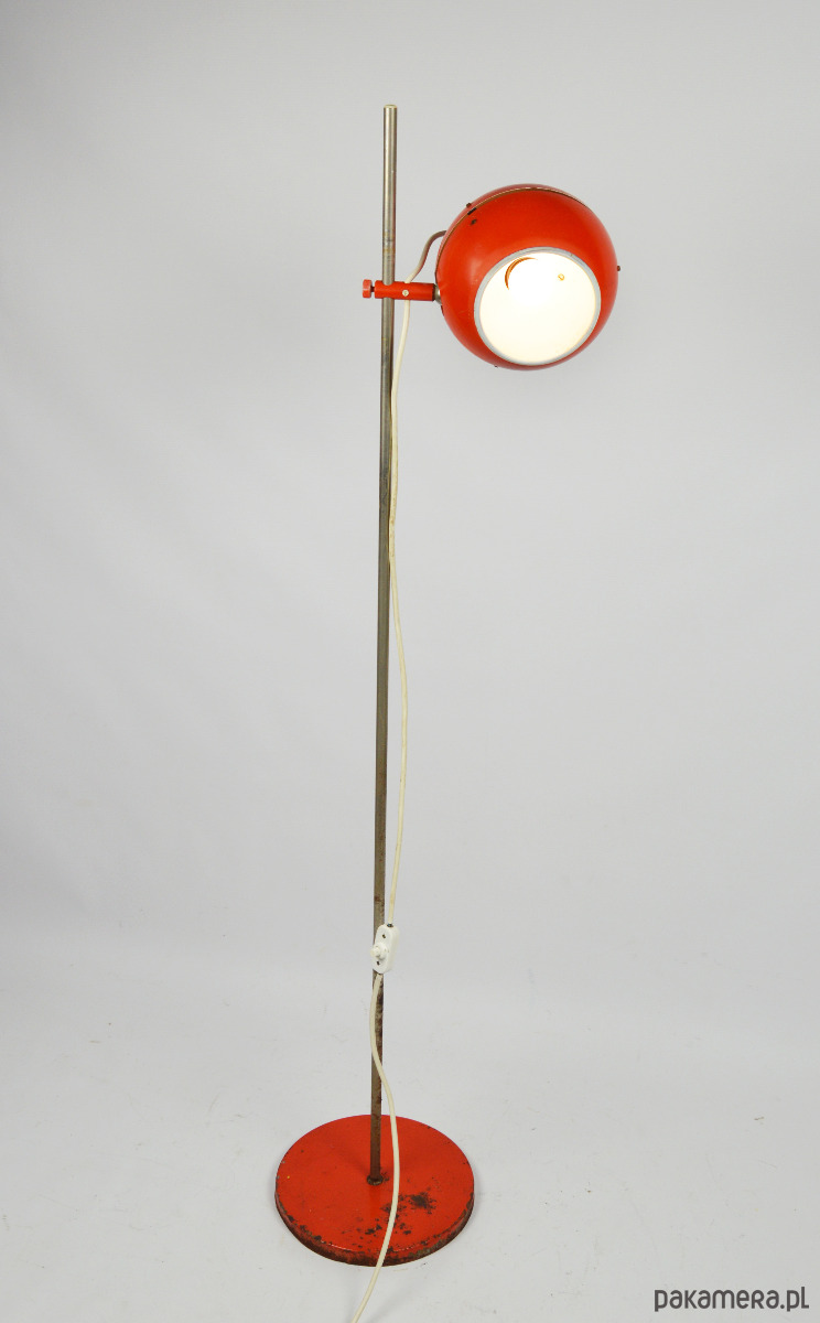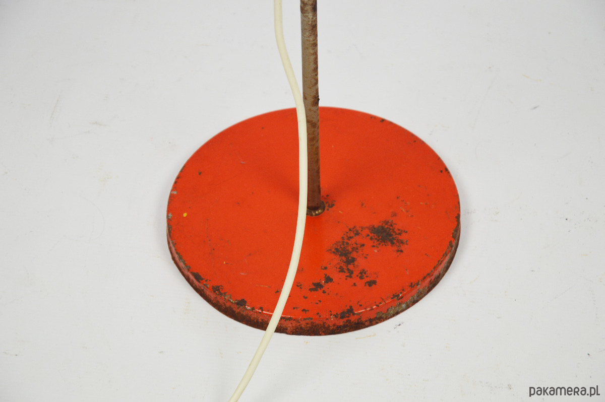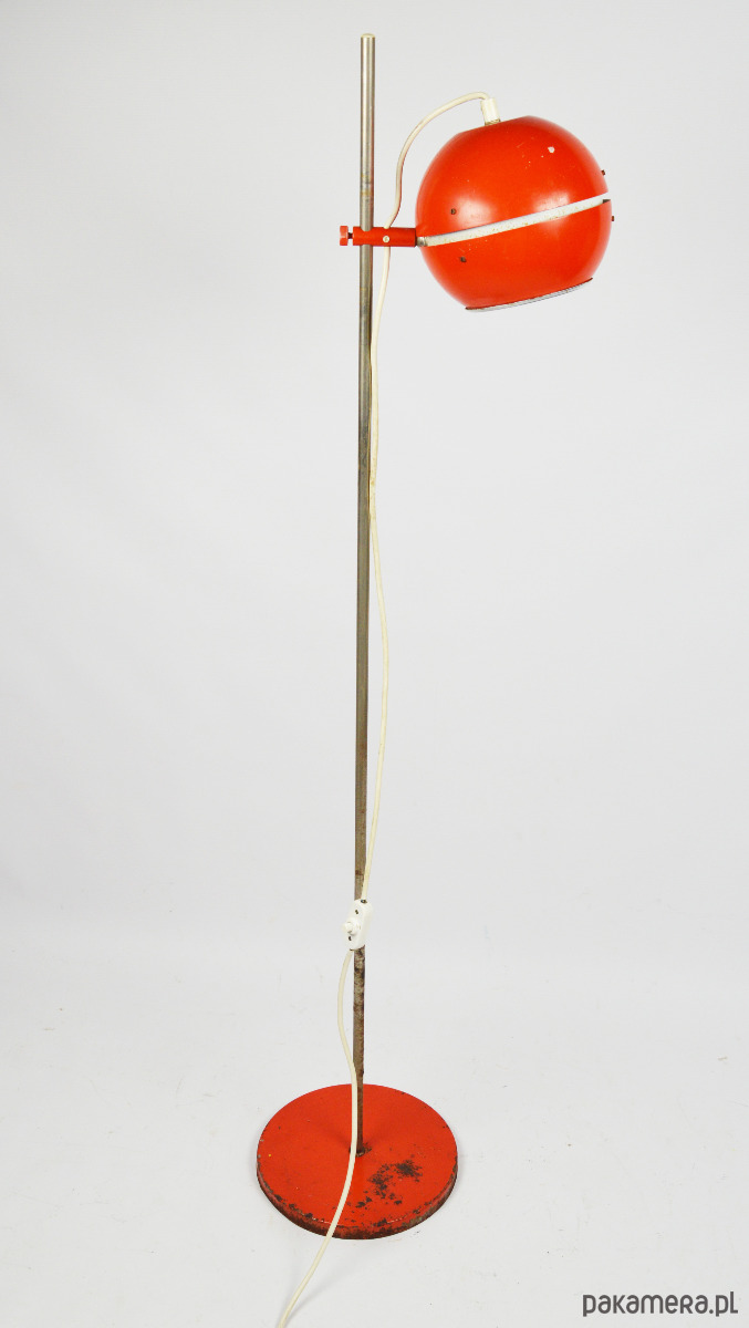 Lampa podłogowa w stylu space age z lat 70. Możliwość ustawienia klosza na dowolnej wysokości. Widoczne ślady czasu, takie jak korozja, rysy i otarcia.