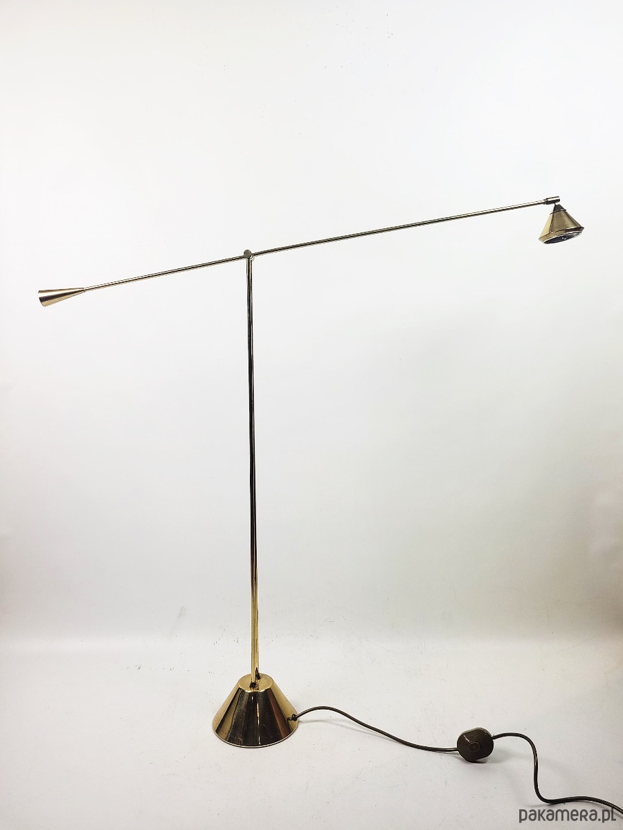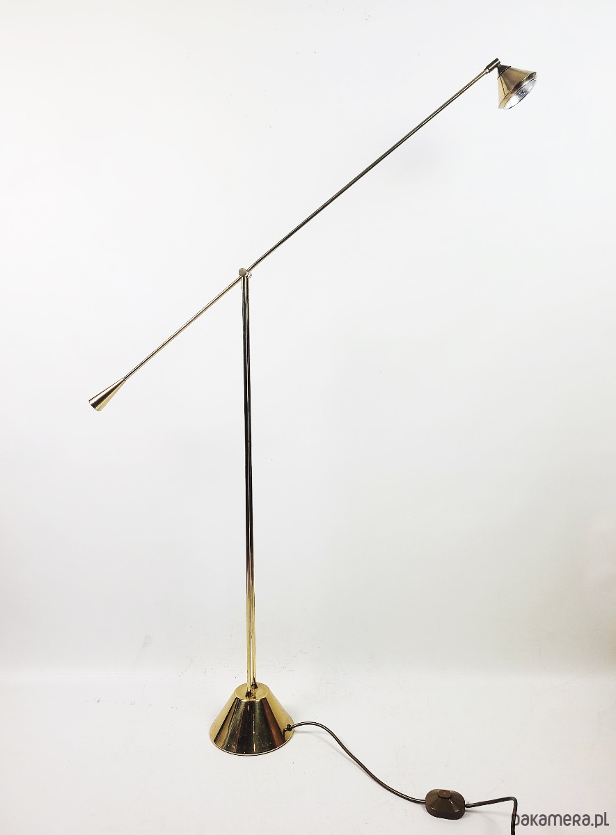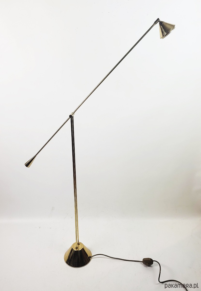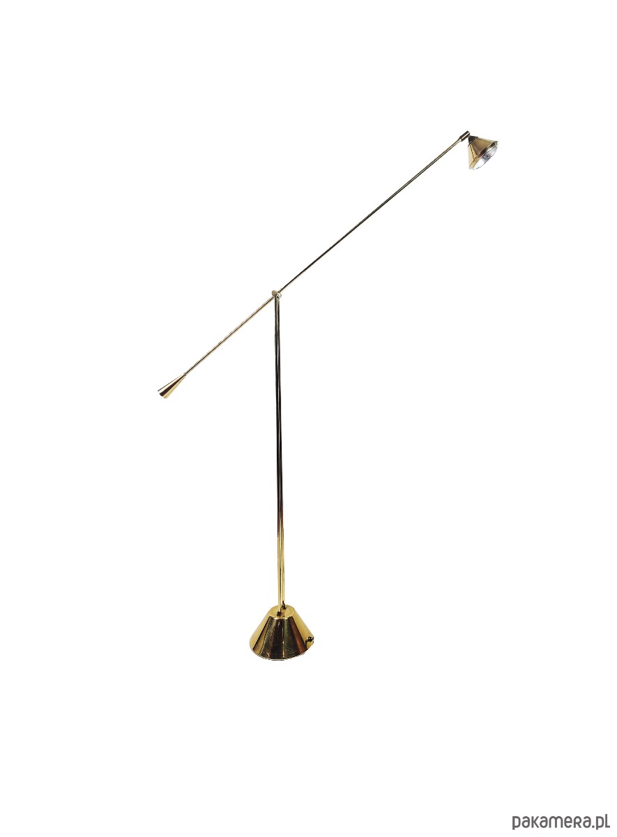 Elegancka lampa podłogowa w kolorze złota, utrzymana w duchu modernizmu lat 80. Charakteryzuje się prostą, geometryczną formą oraz funkcjonalną konstrukcją z przeciwwagą, pozwalającą na regulację położenia klosza. Klosz w kształcie ostrosłupa nadaje całości wyrazisty, architektoniczny charakter, podkreślając minimalistyczną estetykę przedmiotu. Połączenie metalicznego blasku złota z geometryczną bryłą tworzy ponadczasowy, dekoracyjny akcent, idealny do wnętrz inspirowanych modernizmem, postmodernizmem lub stylem vintage.