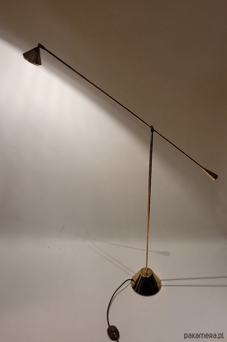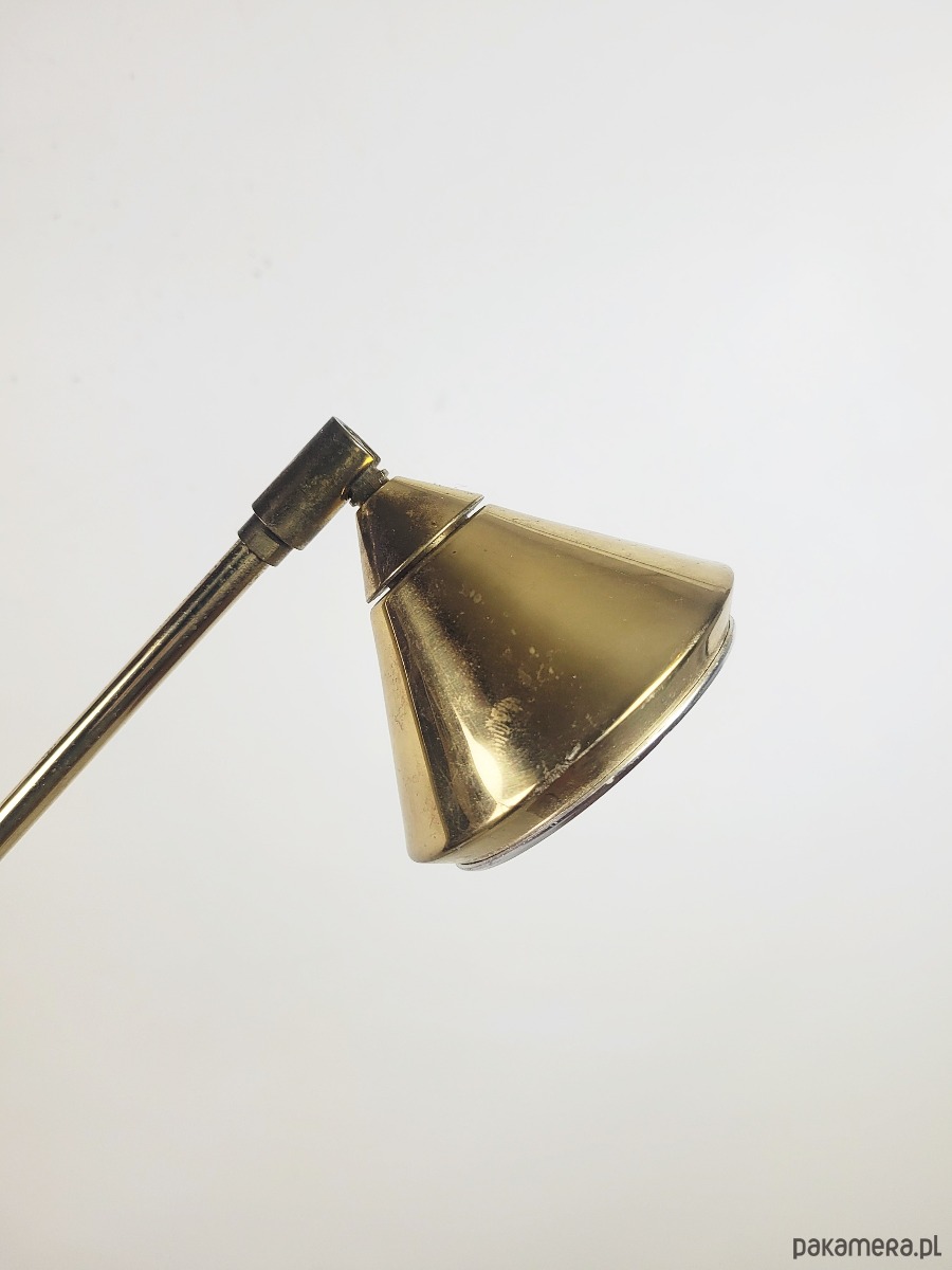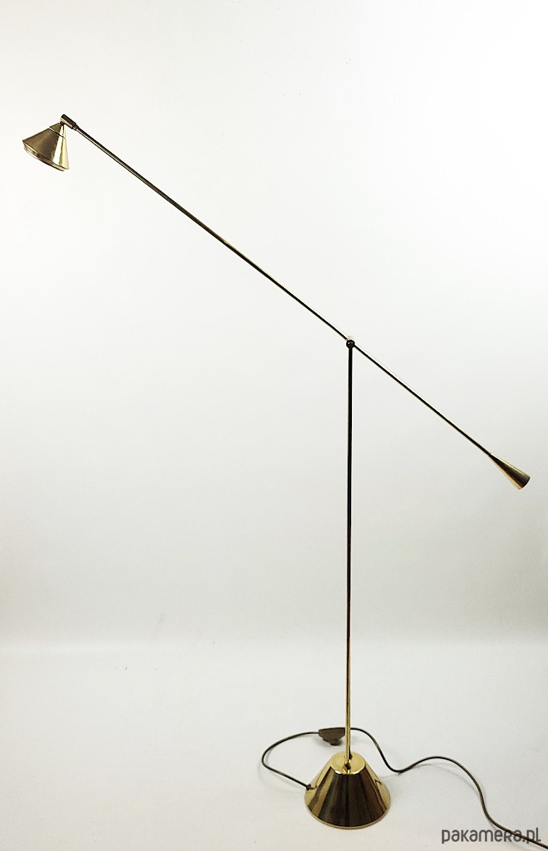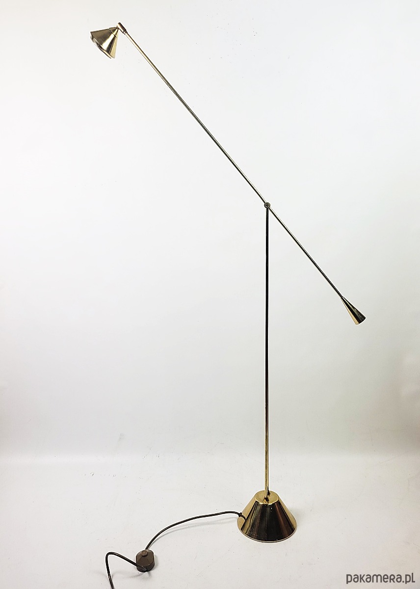 Elegancka lampa podłogowa w kolorze złota, utrzymana w duchu modernizmu lat 80. Charakteryzuje się prostą, geometryczną formą oraz funkcjonalną konstrukcją z przeciwwagą, pozwalającą na regulację położenia klosza. Klosz w kształcie ostrosłupa nadaje całości wyrazisty, architektoniczny charakter, podkreślając minimalistyczną estetykę przedmiotu. Połączenie metalicznego blasku złota z geometryczną bryłą tworzy ponadczasowy, dekoracyjny akcent, idealny do wnętrz inspirowanych modernizmem, postmodernizmem lub stylem vintage.
