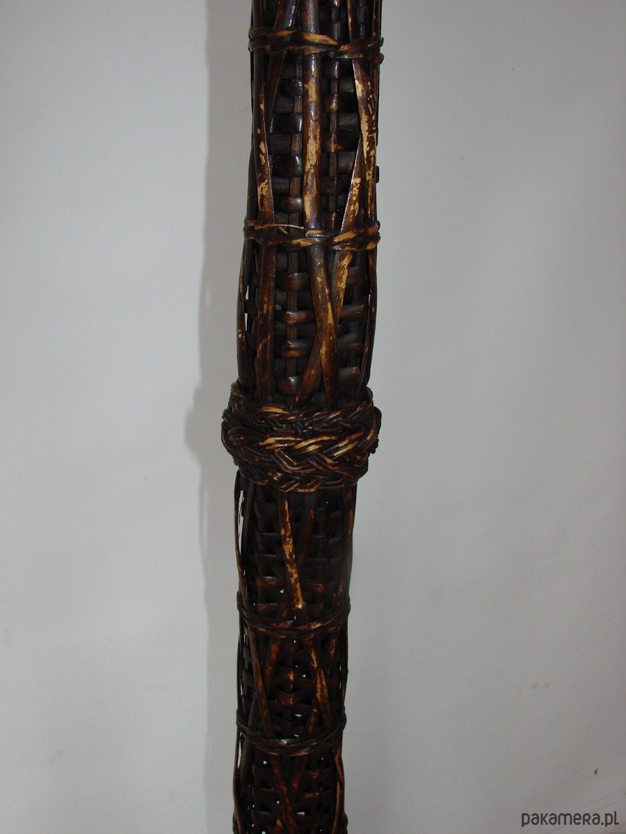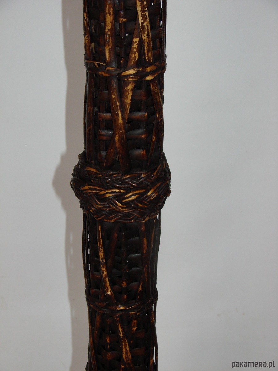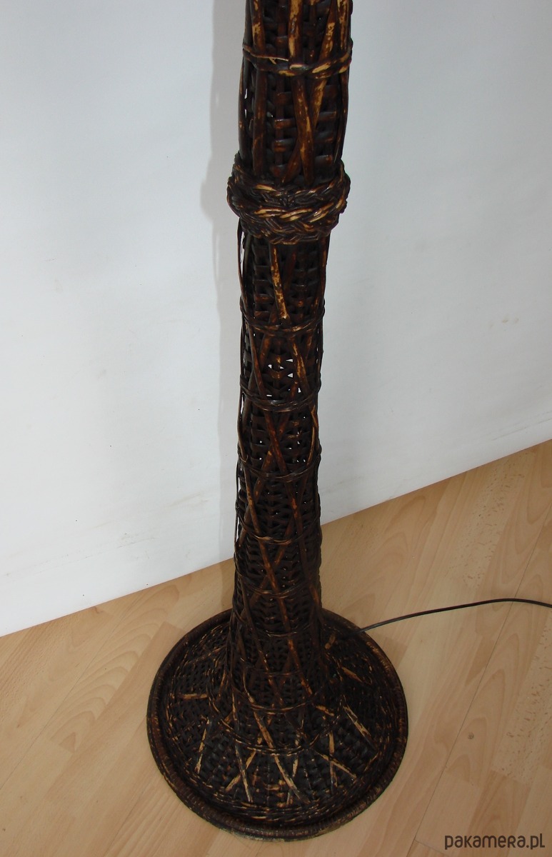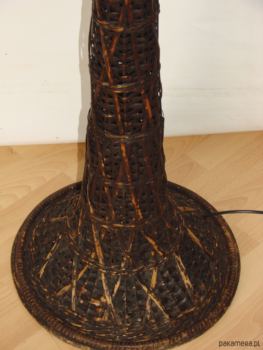 Unikatowa lampa podłogowa pochodząca z lat 40. XX wieku, wykonana z naturalnego, plecionego rattanu. To oryginalny egzemplarz z epoki, zachowany w dobrym stanie, z widoczną szlachetną patyną charakterystyczną dla autentycznego designu vintage.