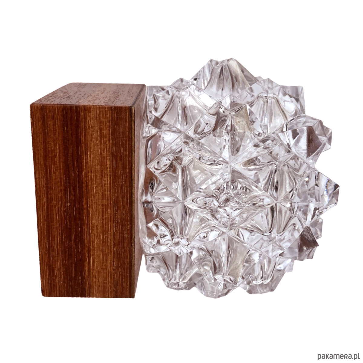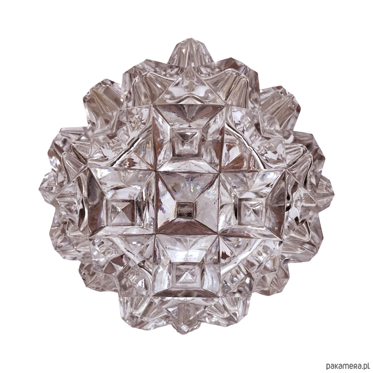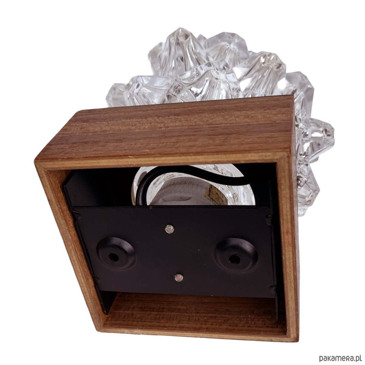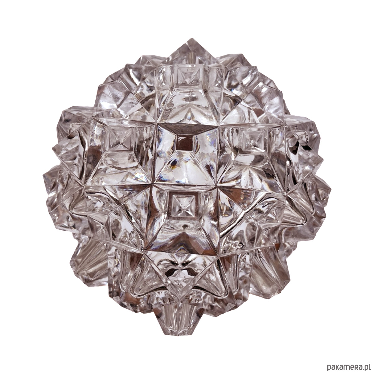 Klosz wykonany z grubego, bezbarwnego szkła o mocno **fakturowanej powierzchni** – pełnej kolców i geometrycznych kształtów. Taka struktura pięknie rozprasza światło, tworząc niezwykłe efekty wizualne – światło rozchodzi się miękko w różnych kierunkach, nie tylko do przodu, ale także na boki.