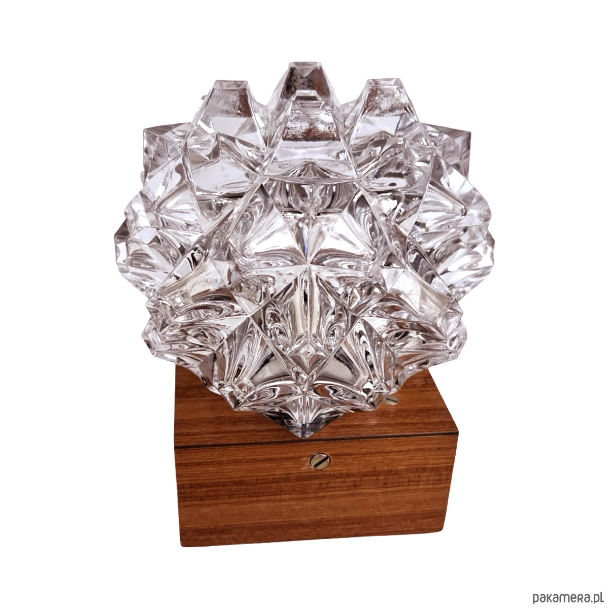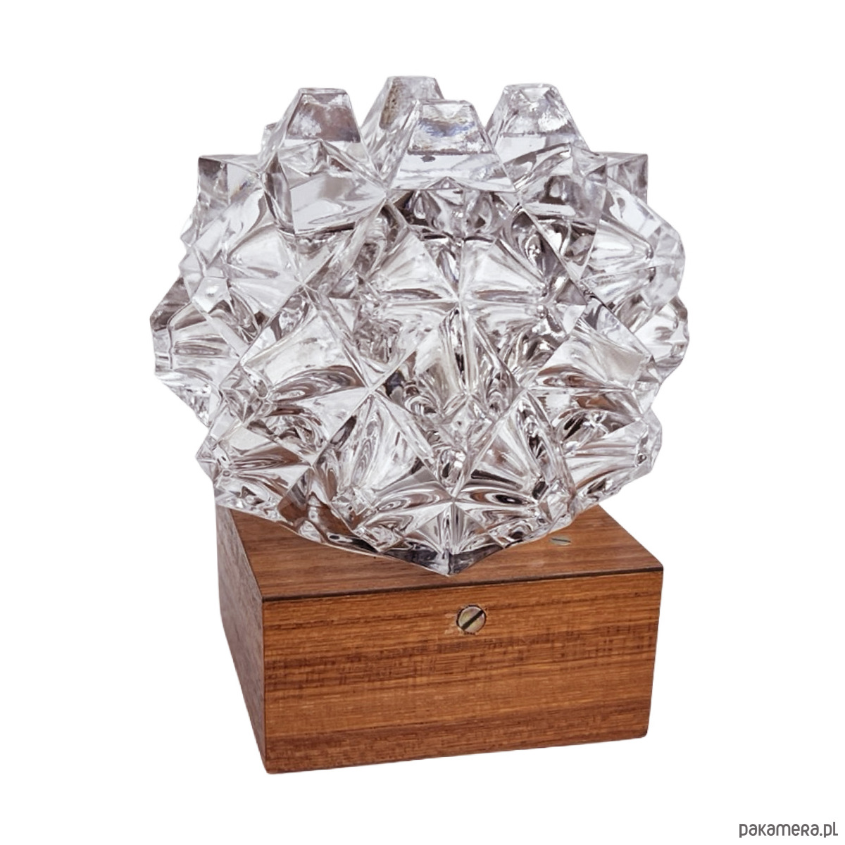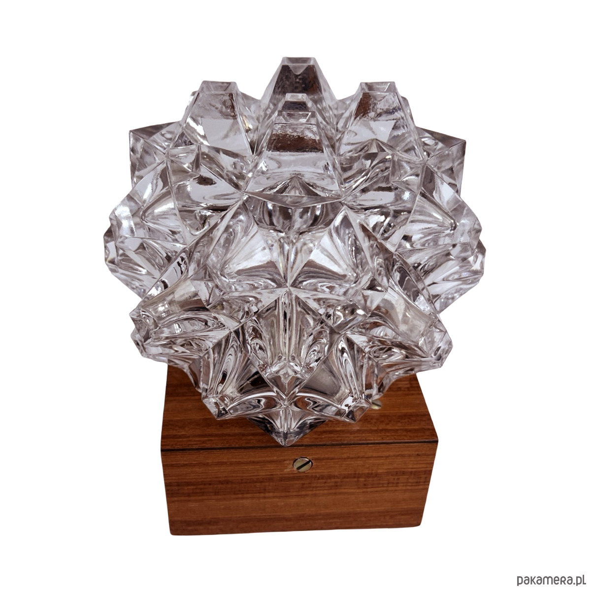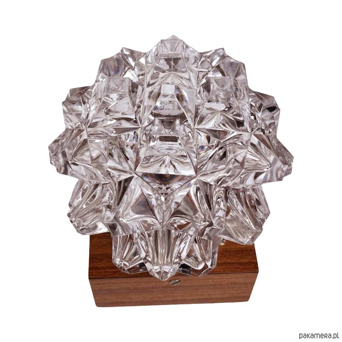 Klosz wykonany z grubego, bezbarwnego szkła o mocno **fakturowanej powierzchni** – pełnej kolców i geometrycznych kształtów. Taka struktura pięknie rozprasza światło, tworząc niezwykłe efekty wizualne – światło rozchodzi się miękko w różnych kierunkach, nie tylko do przodu, ale także na boki.