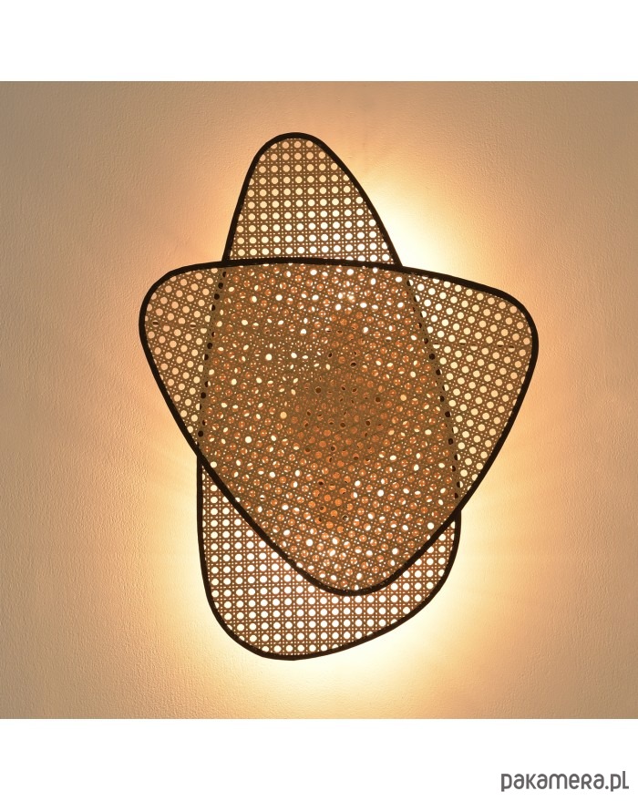 Lampa ścienna Boho DUO, w stylu boho, wykonana została z naturalnej plecionki wiedeńskiej. Kinkiet składa się z dwóch rattanowych kloszy wykończonych na obrzeżach czarną tekstylną lamówką. Rattanowe elementy zamontowano na metalowej konstrukcji w kolorze czarnym. Kinkiet idealnie komponuje się we wnętrzach w stylu boho, zaprojektowanych w naturalnej, stonowanej kolorystyce.