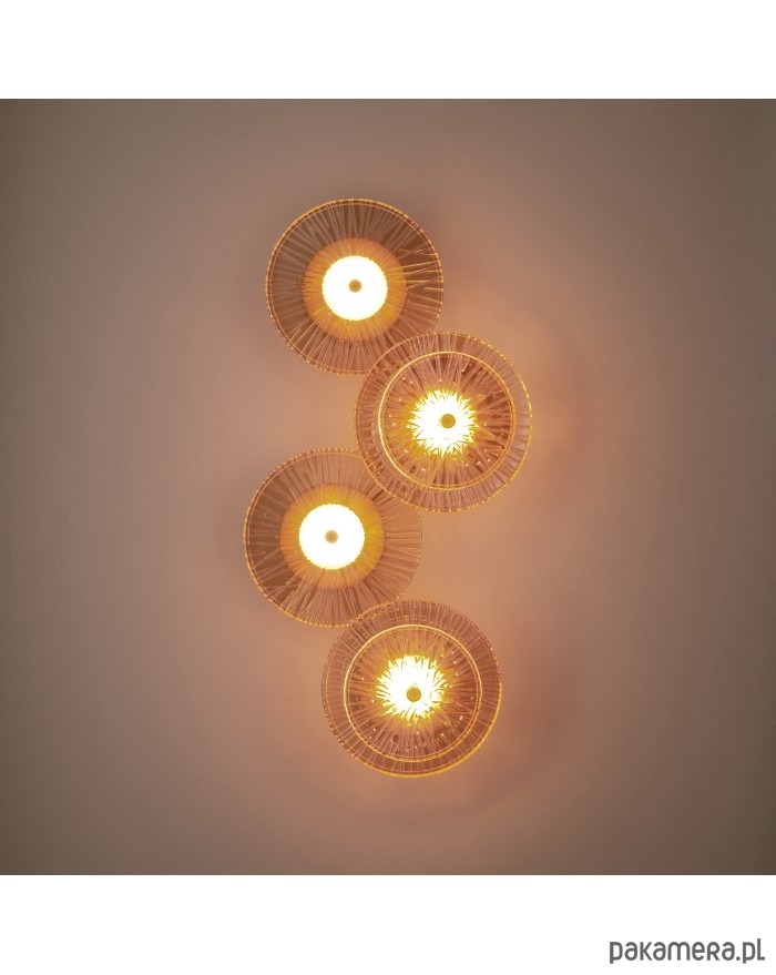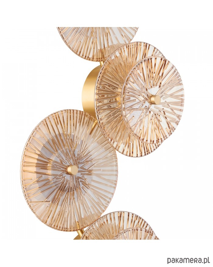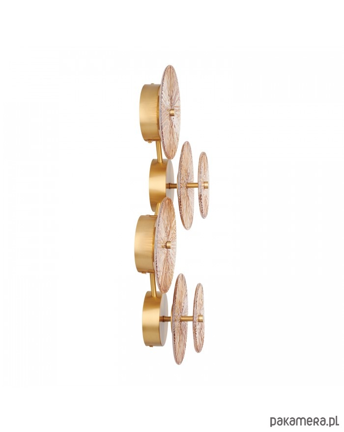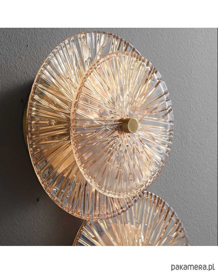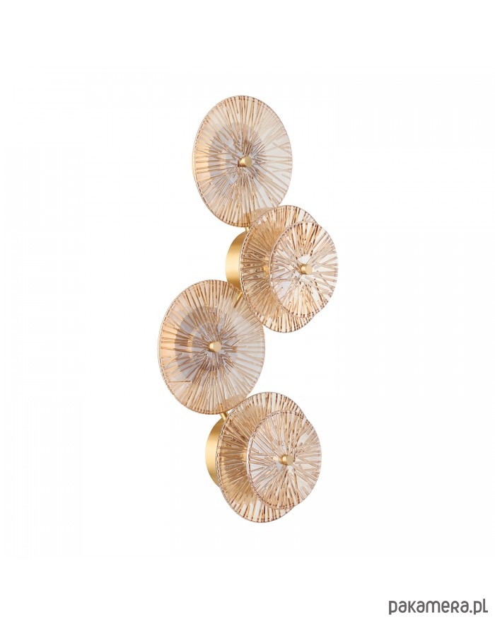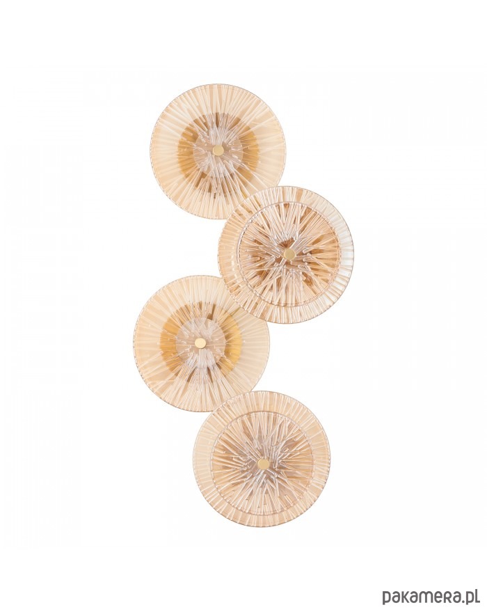 Elegancka lampa ścienna składa się z czterech podwójnych tarcz połączonych ze sobą źródłem światła led. Lampa łączy w sobie wysokiej jakości materiały: szkło ryflowane w bursztynowym odcieniu oraz mosiądz szczotkowany. Dzięki szklanej powierzchni lampa nabiera lekkości, wypełniając przestrzeń ciepłym światłem. Kinkiet tworzy rzeźbiarską dekorację ścienną będąc ciekawą ozdobą wnętrz.