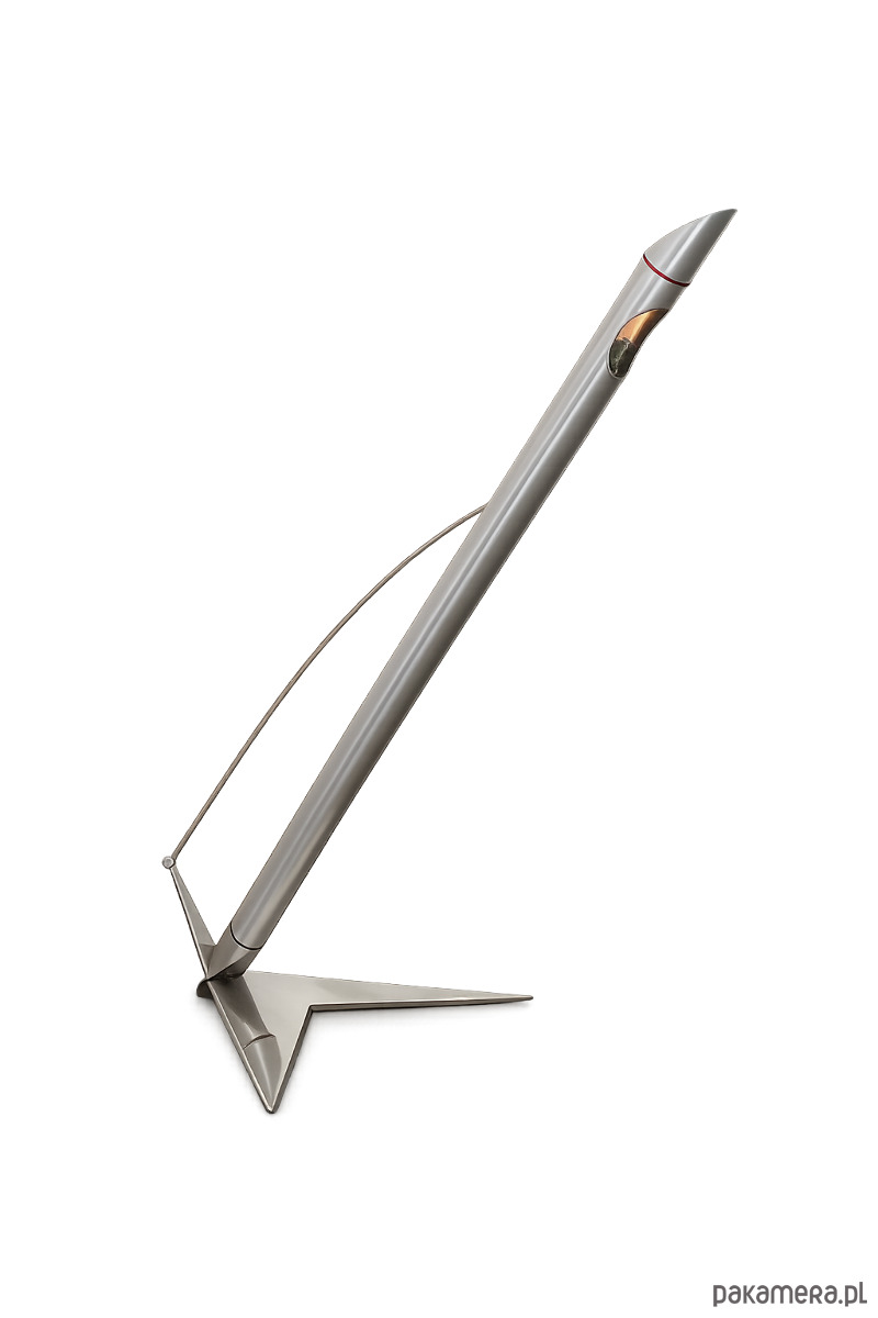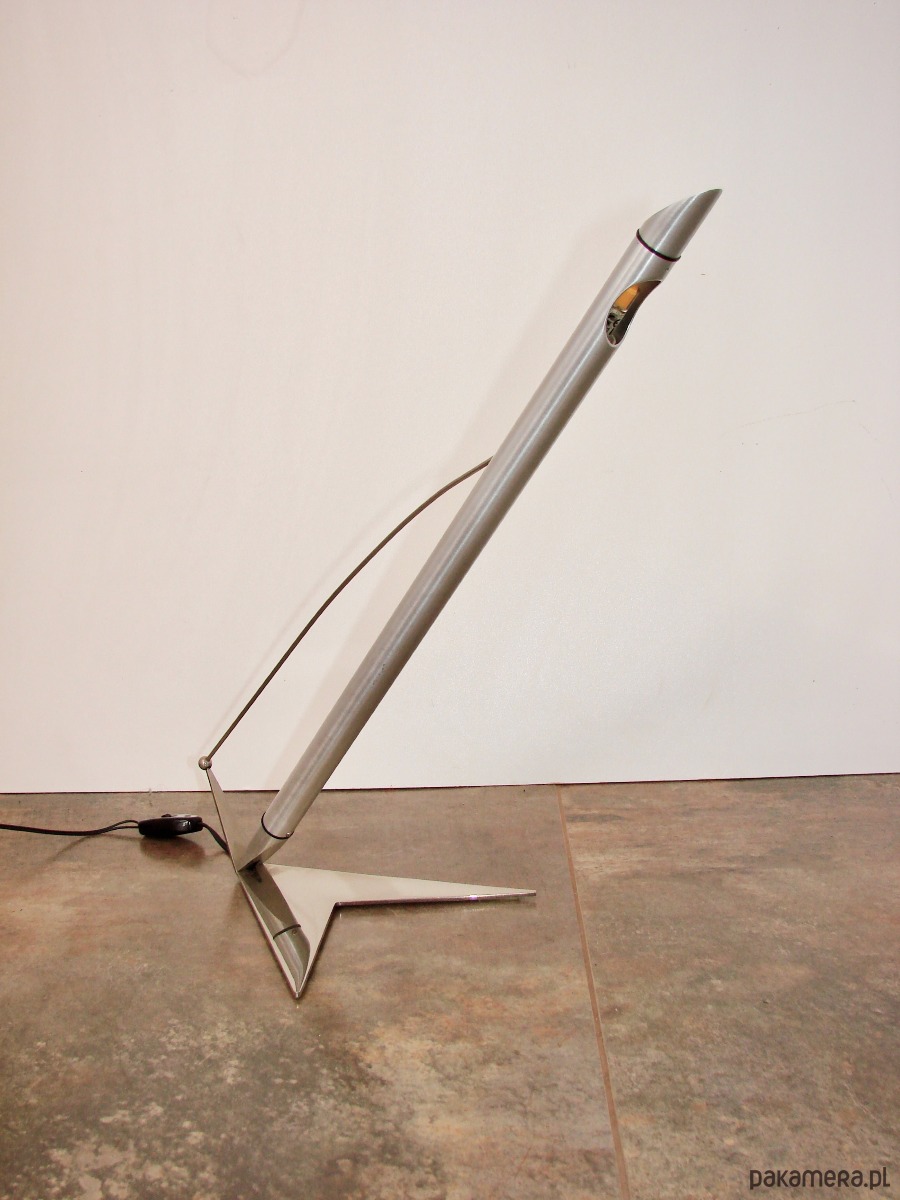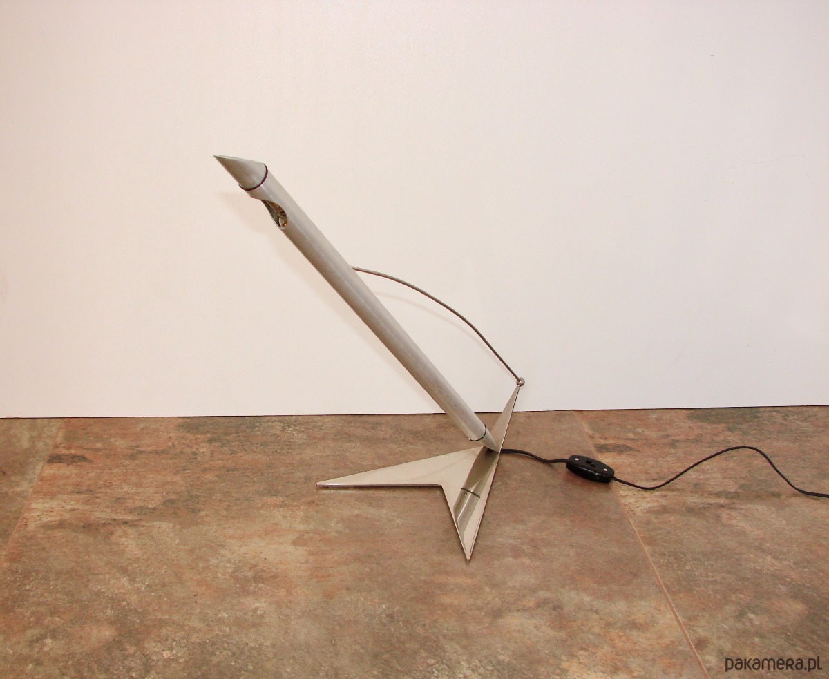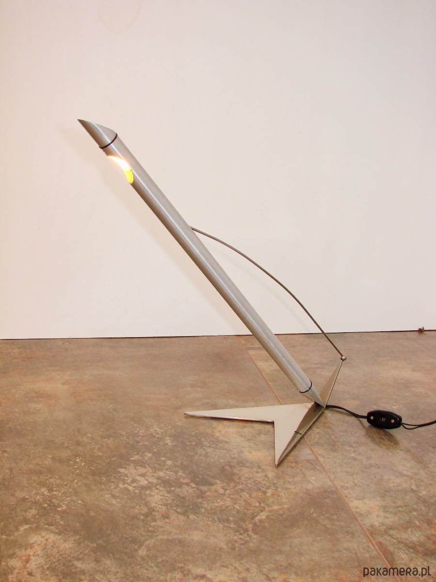 Oryginalna lampa w stylu Space Age z lat 90. Wyróżnia się futurystyczną formą charakterystyczną dla projektów inspirowanych kosmicznym wzornictwem. Konstrukcja została wykonana z niklowanego mosiądzu oraz aluminium, co nadaje lampie elegancki, metaliczny wygląd.