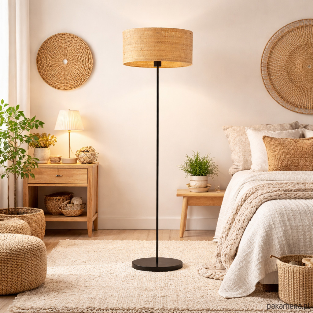Lampa stojąca do sypialni w stylu boho WERONA BOHO z rattanowym abażurem