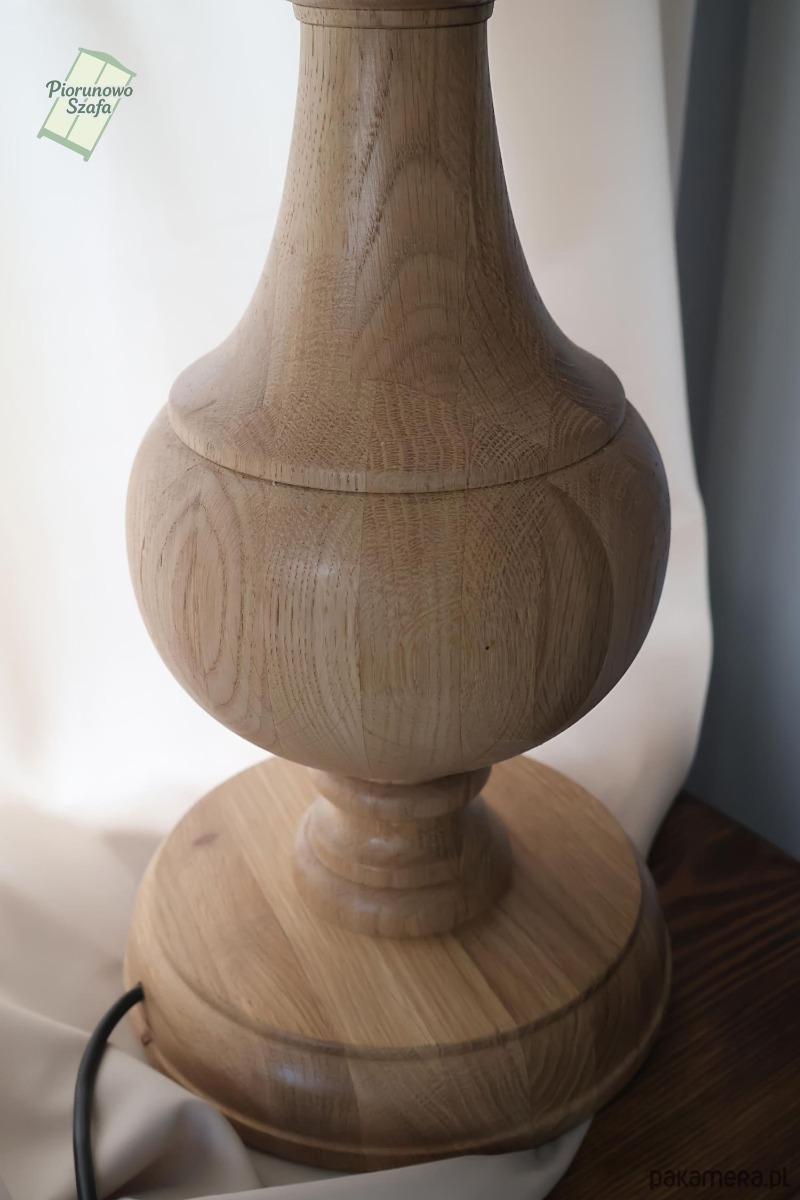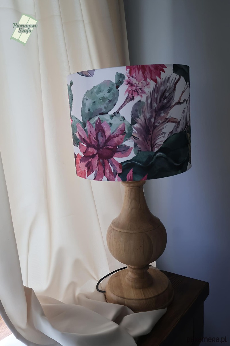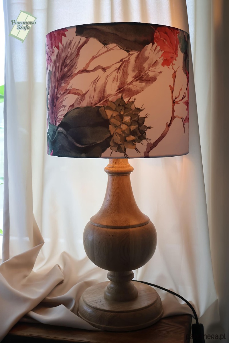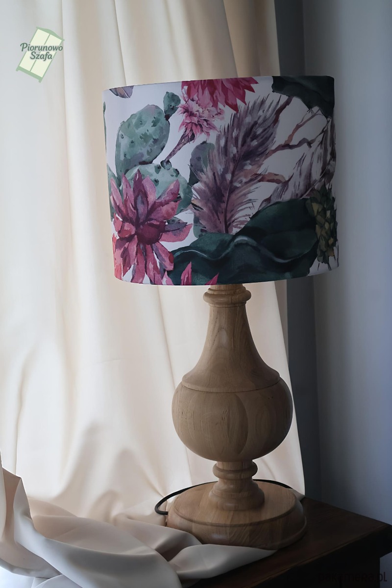 Lampa stołowa drewniana z abażurem w kwiaty – stylowa dekoracja do wnętrz