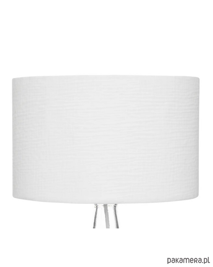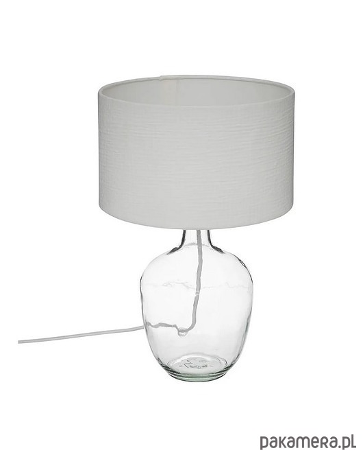 Bardzo ciekawa lampa stołowa. Podstawa wykonana została z transparentnego szkła. Abażur jest bawełniany, w kolorze białym.