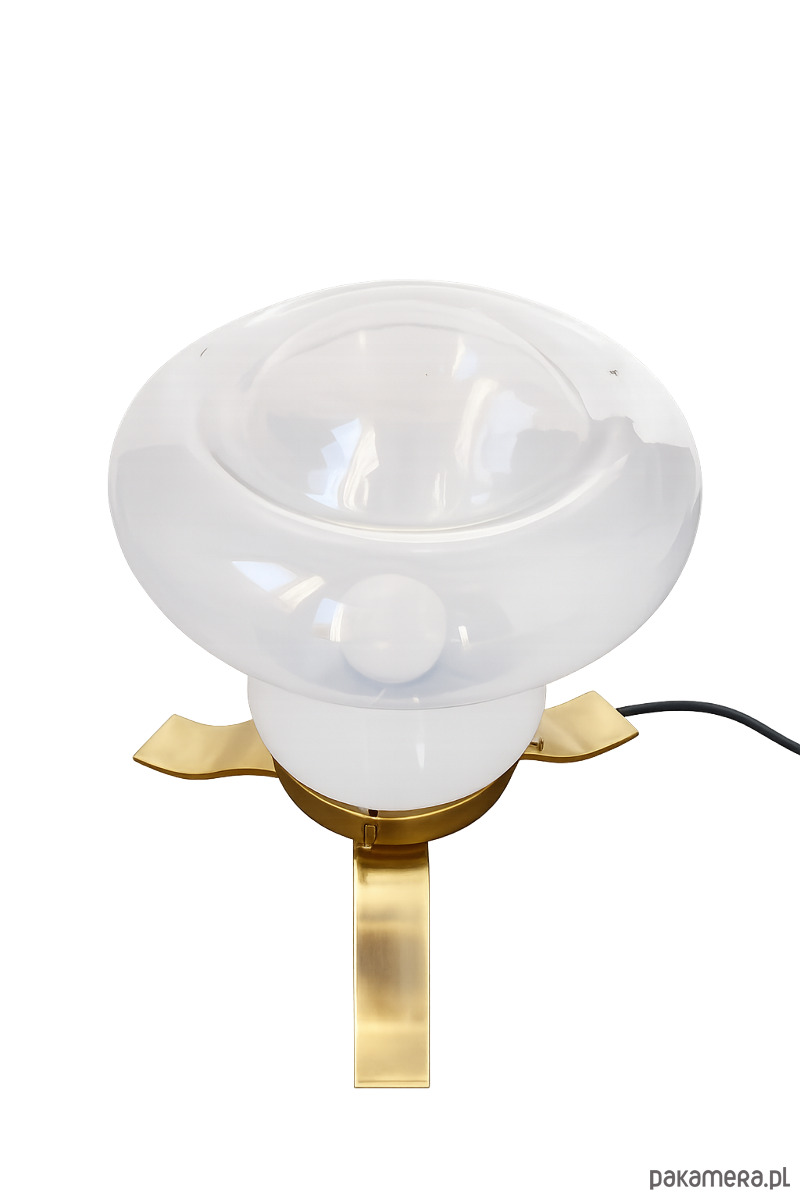 Wyjątkowa lampa stołowa w stylu Mid Century Modern pochodząca z lat 70., która przyciąga uwagę swoją formą i jakością wykonania. Połączenie mlecznego szkła z elementami mosiężnymi nadaje jej elegancki, ponadczasowy charakter.